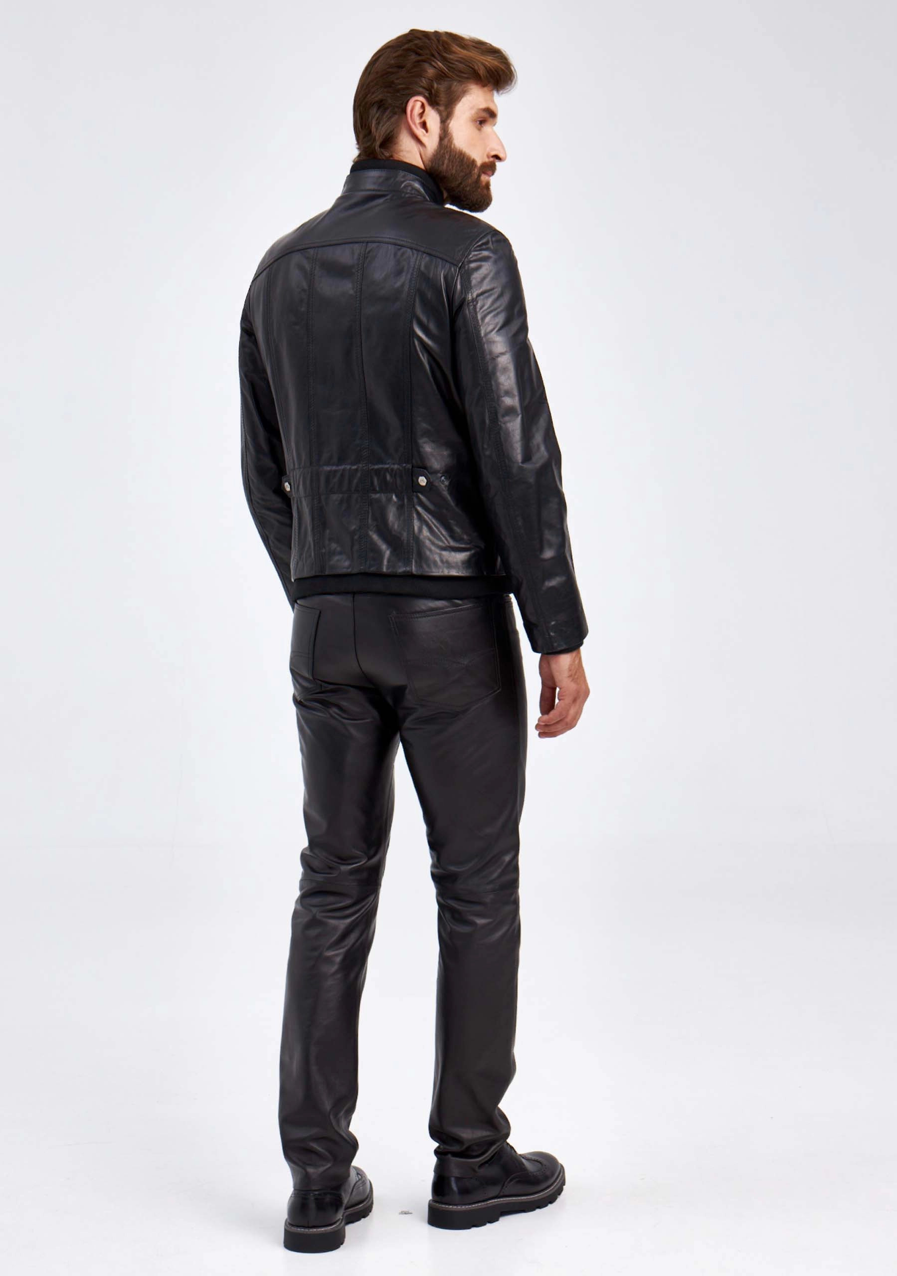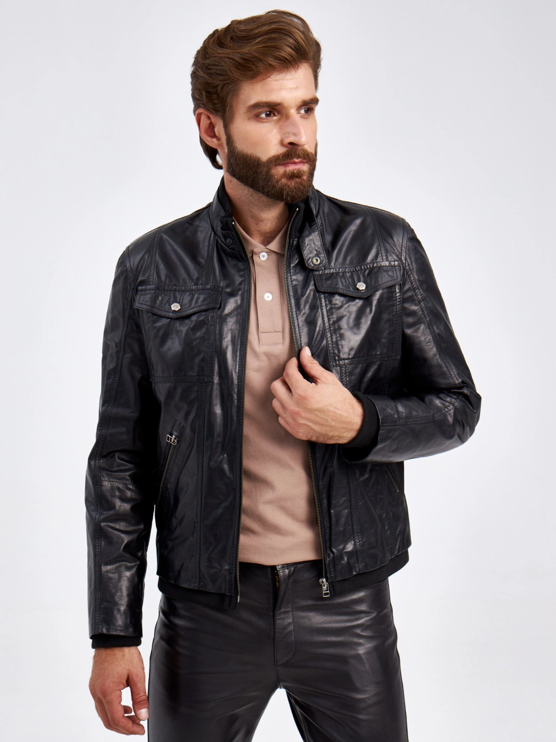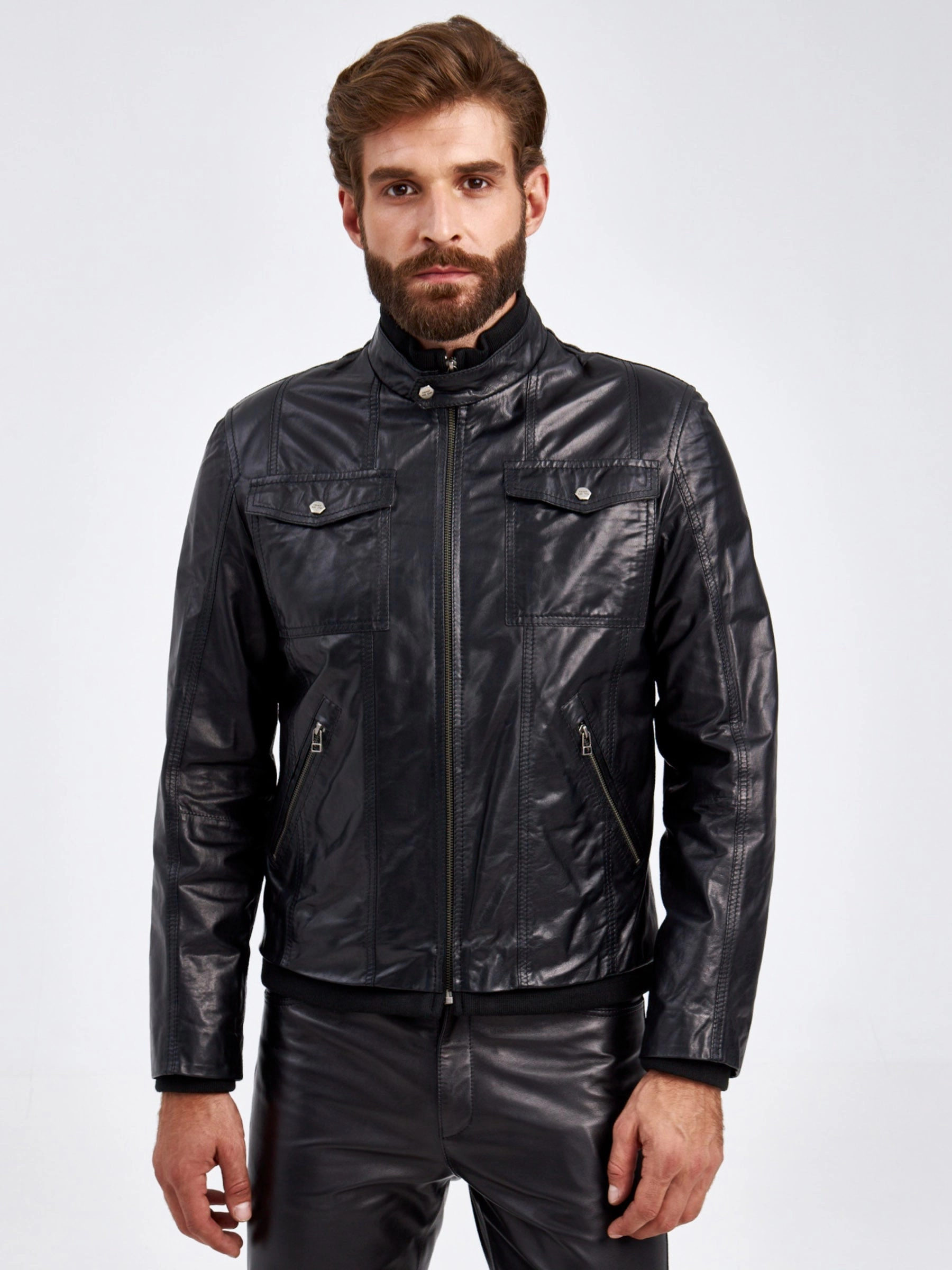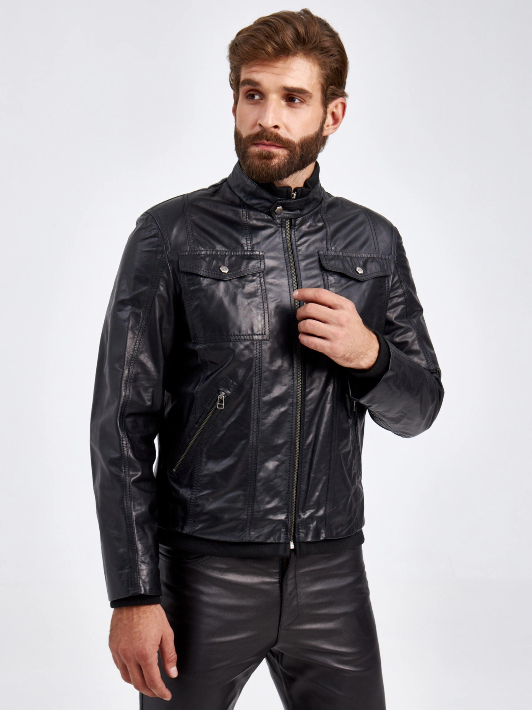 Мужская куртка в великолепной мягкой кожи-пуллап черного цвета застегивающаяся на молнию. Полуприлегающего силуэта. Двойной воротник стойка: трикотаж в тандеме с кожей. Нагрудные накладные карманы с клапанами застегивающиеся кнопками. Боковые на молниях. Пояс и манжеты модели дополнены плотной трикотажной резинкой. Идеальная посадка по фигуре.