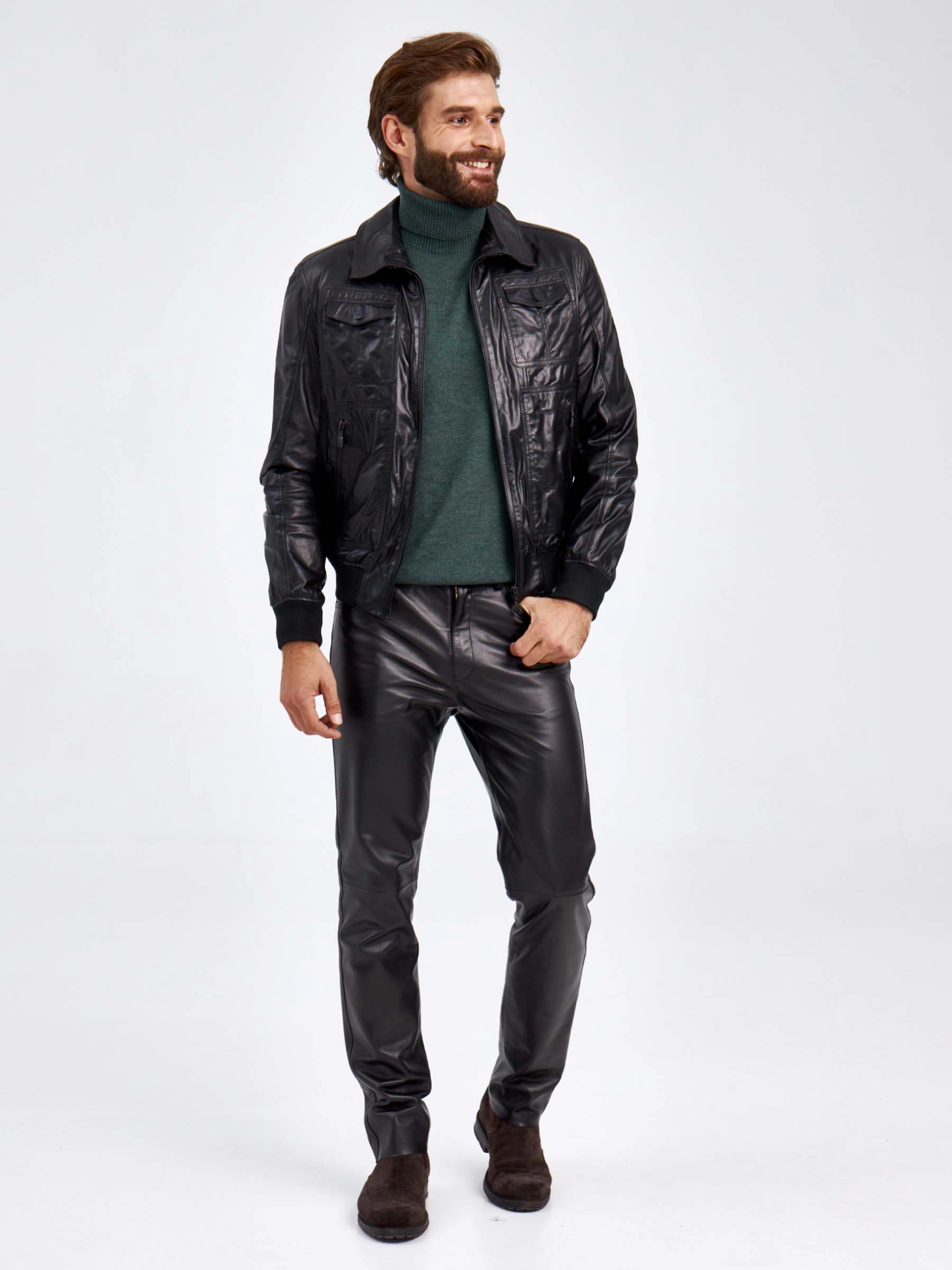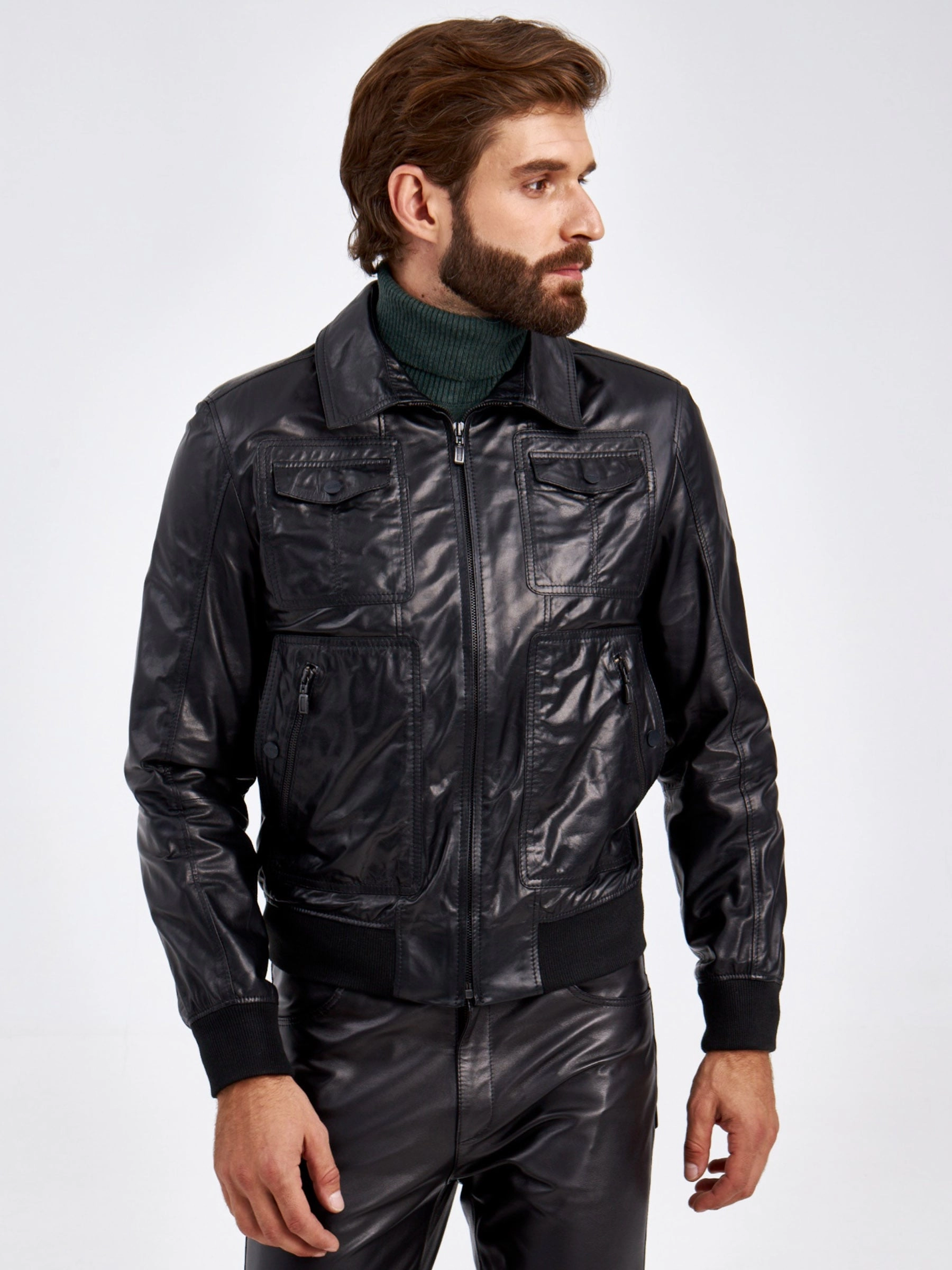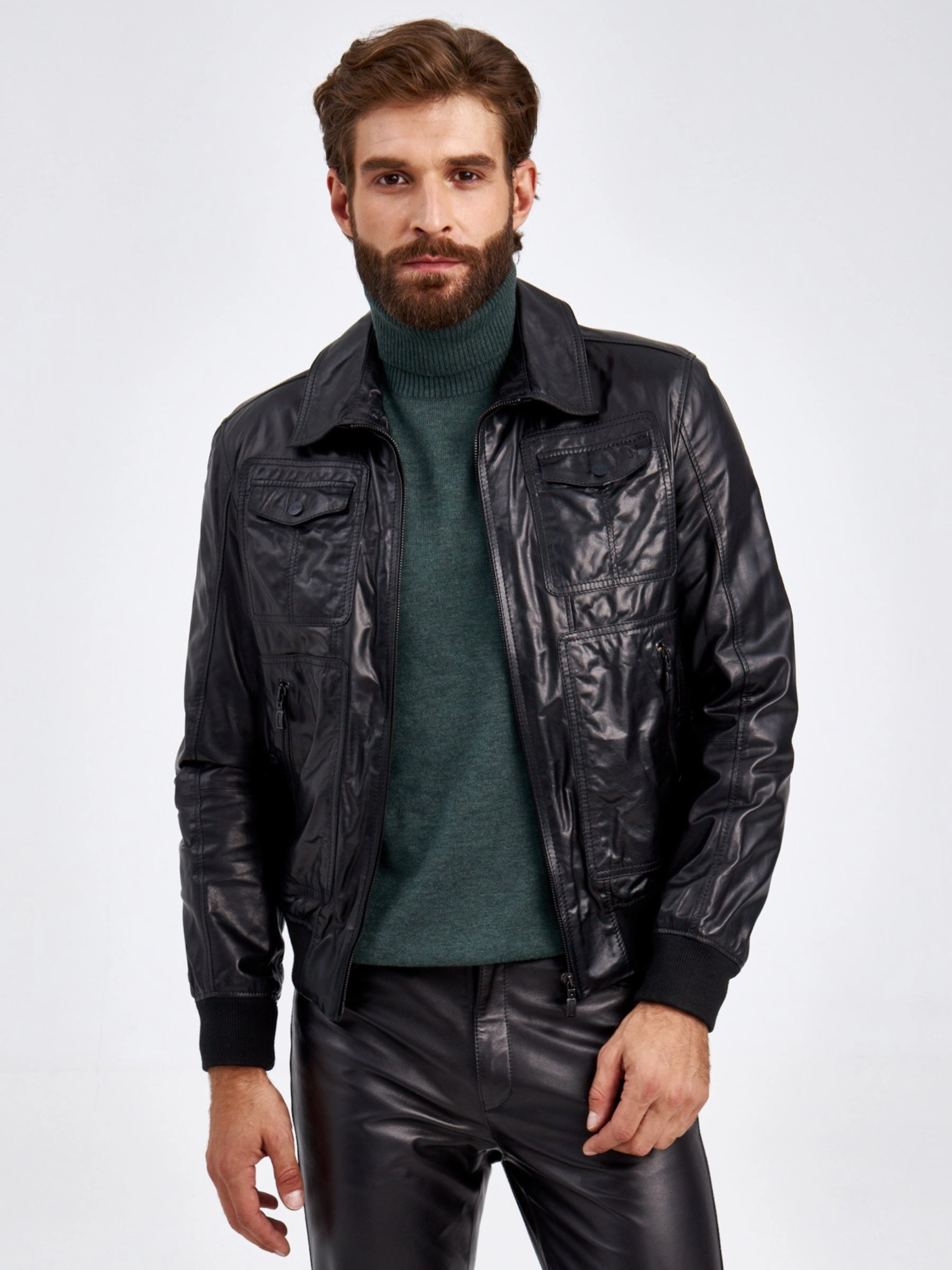 Мужская куртка в великолепной мягкой кожи-пуллап черного цвета застегивающаяся на молнию. Полуприлегающего силуэта. Воротник-отложной. Нагрудные накладные карманы с клапанами на кнопках. Боковые на молниях. Пояс и манжеты модели дополнены плотной трикотажной резинкой. Идеальная посадка по фигуре.
