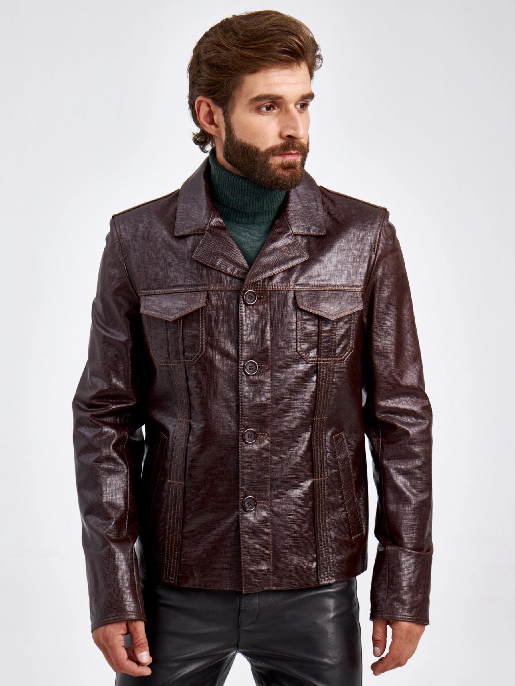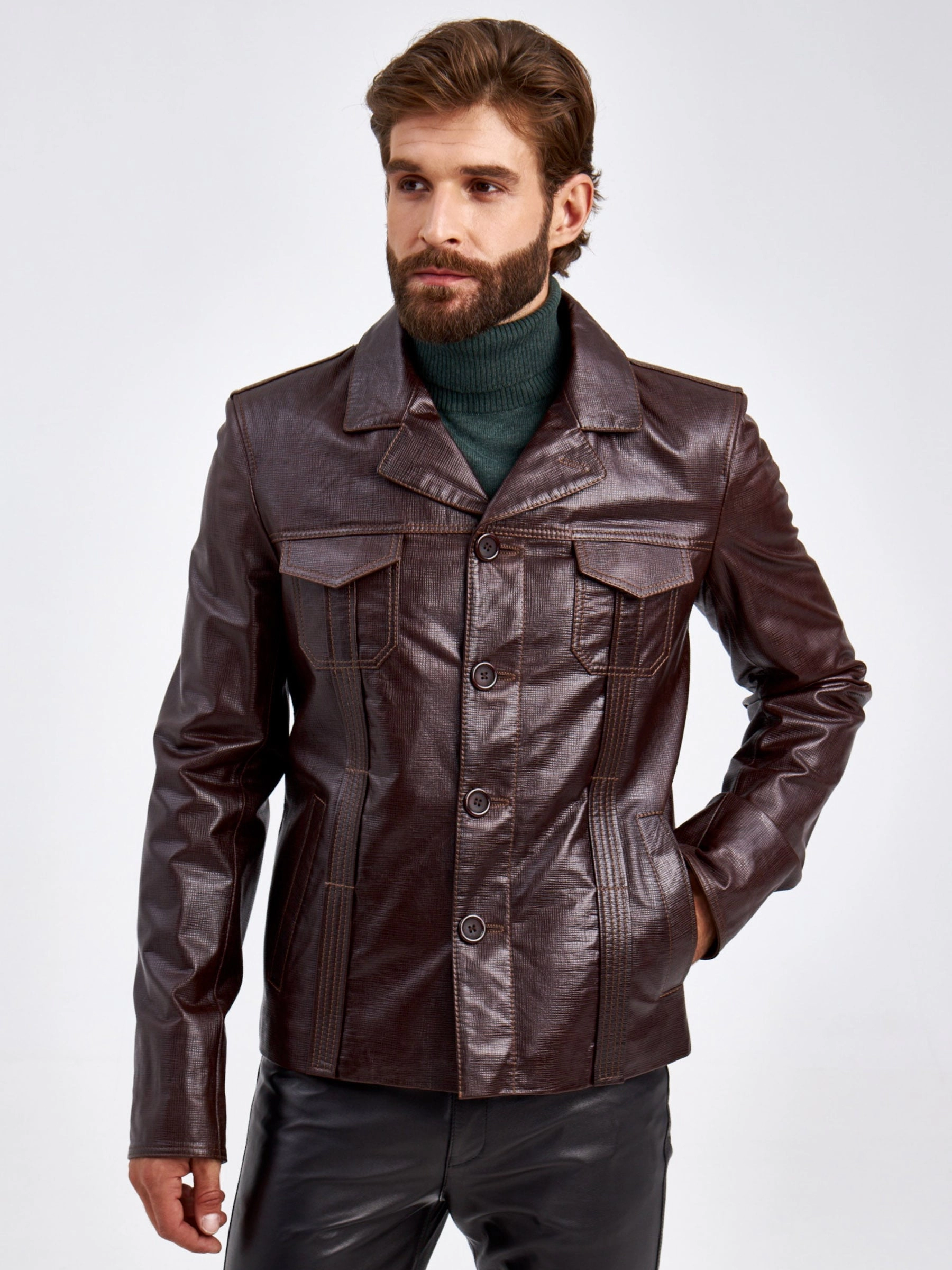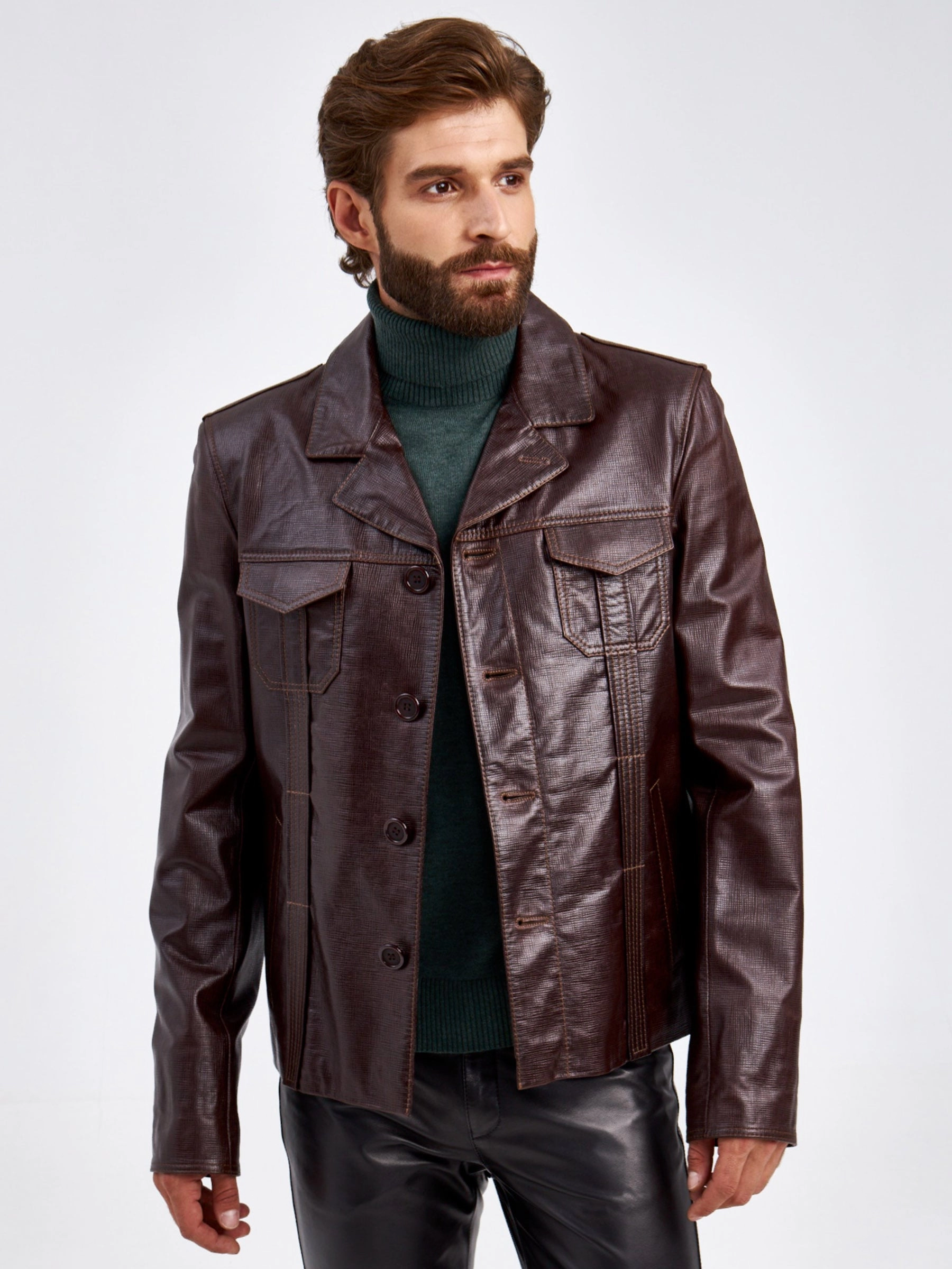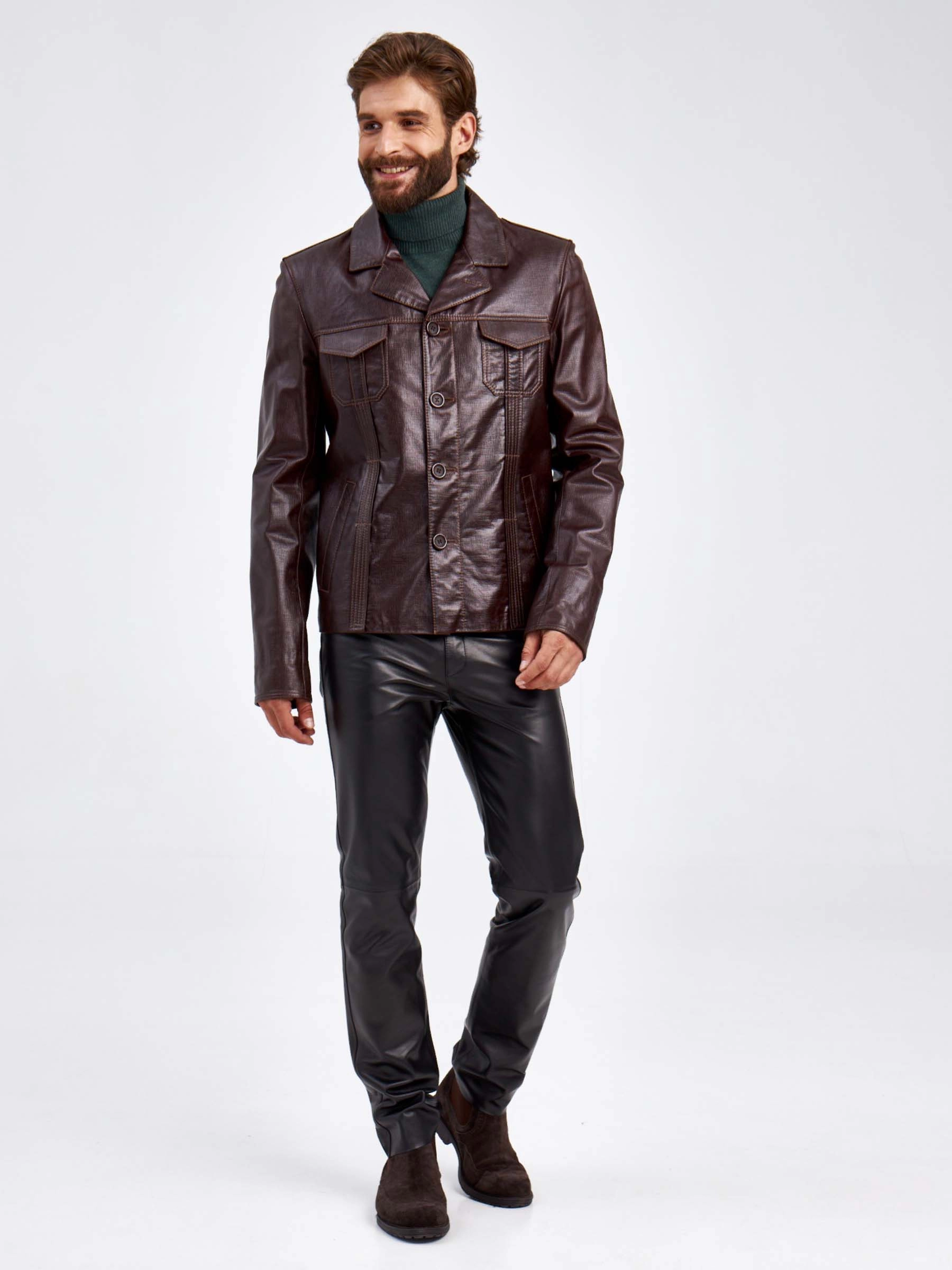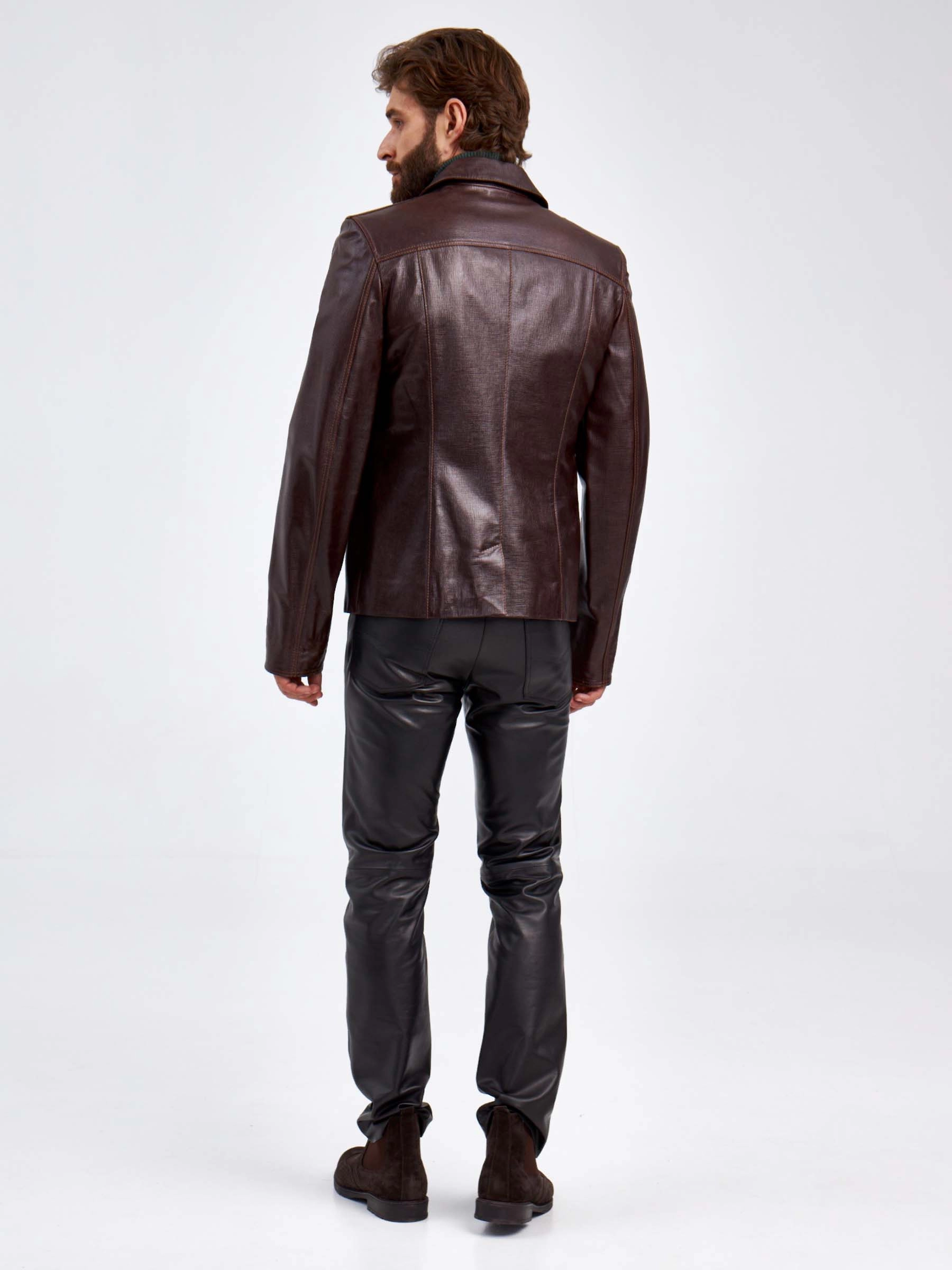 Короткий кожаный мужской пиджак 2010-7, коричневый, размер 48, артикул 29310
