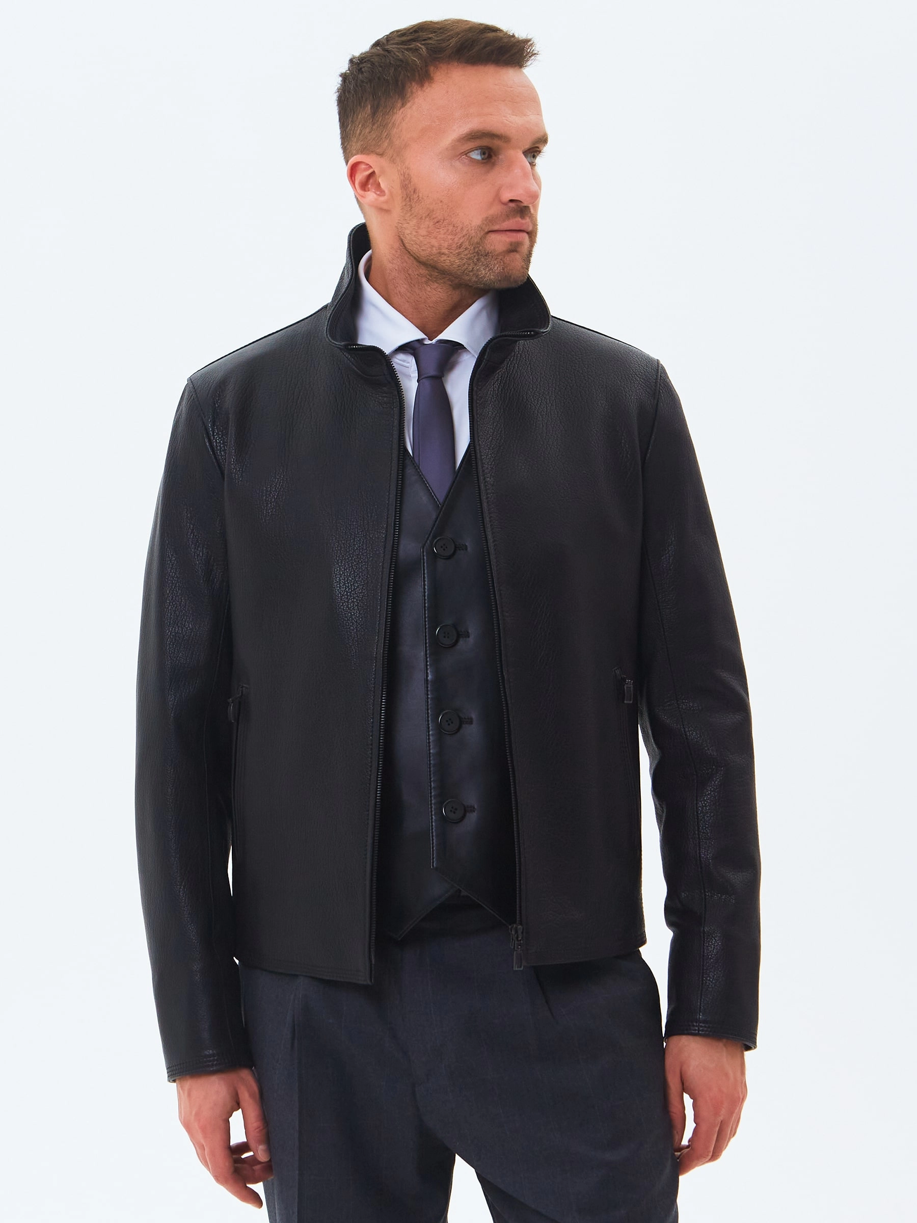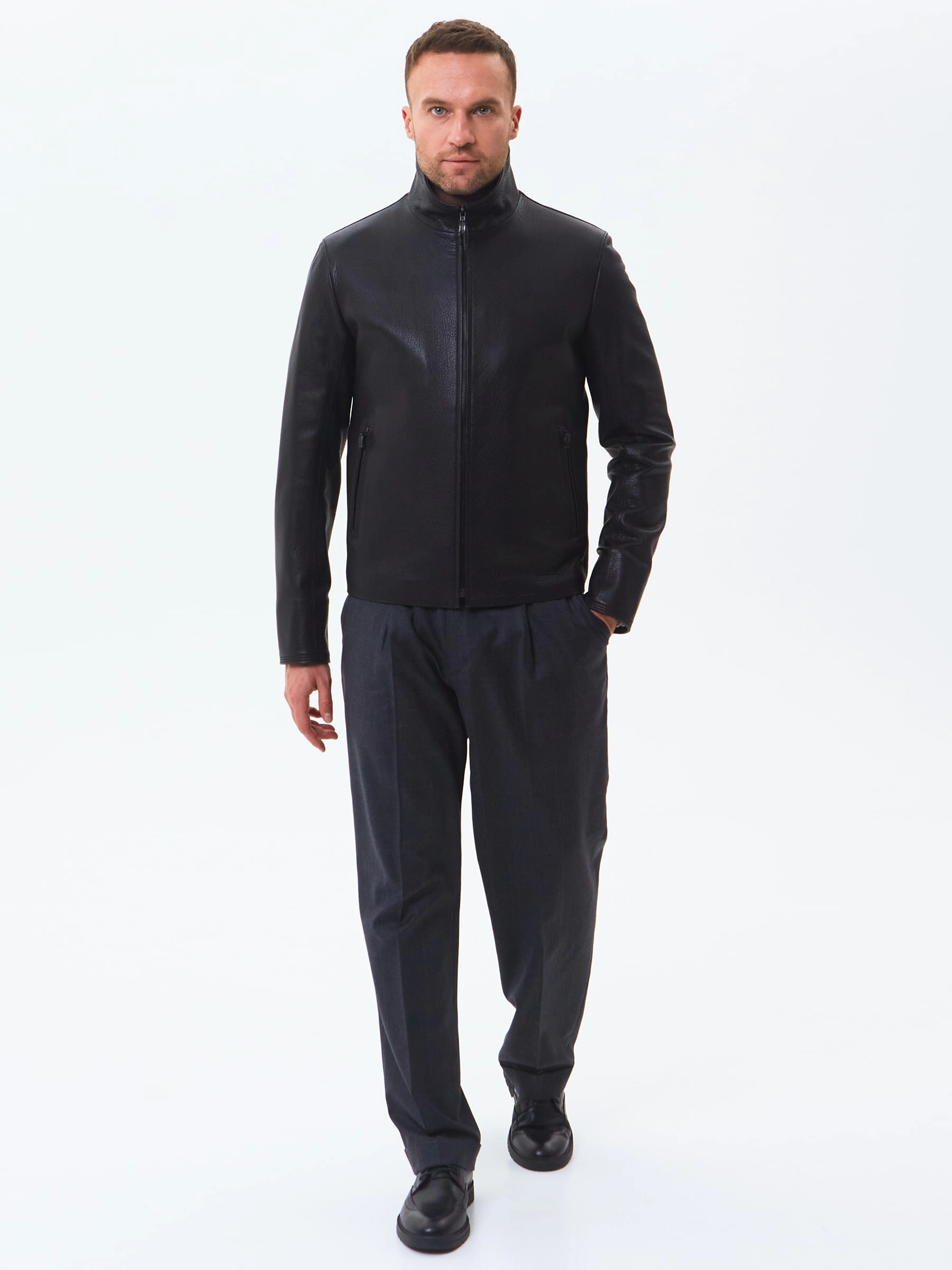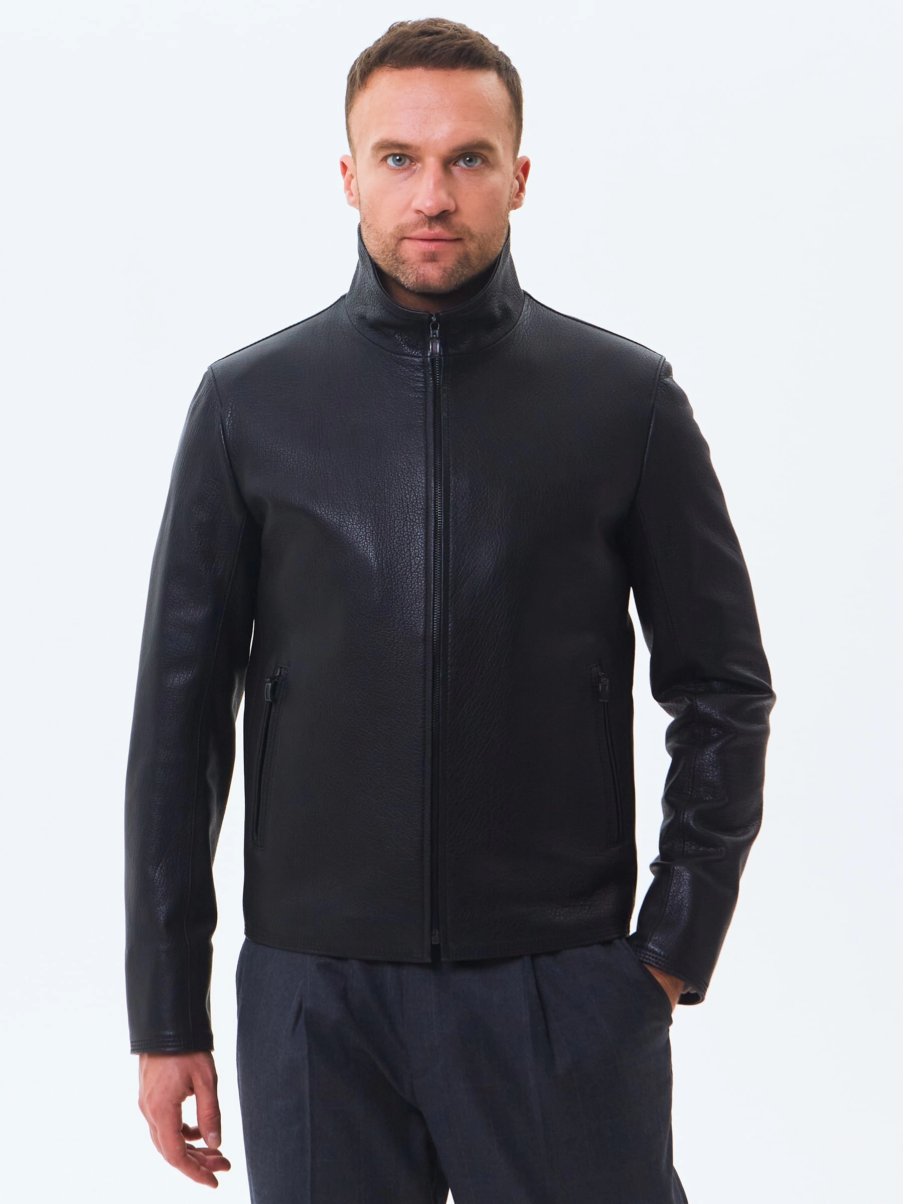 Отличным решением для прохладной погоды послужит короткая кожаная куртка в универсальном черном цвете. Полуприлегающий силуэт. Воротник стойка легко трансформируется в отложной. Застежка молния. Минимум фурнитуры. Основная черта этой модели: Профессиональный пошив и комфорт.