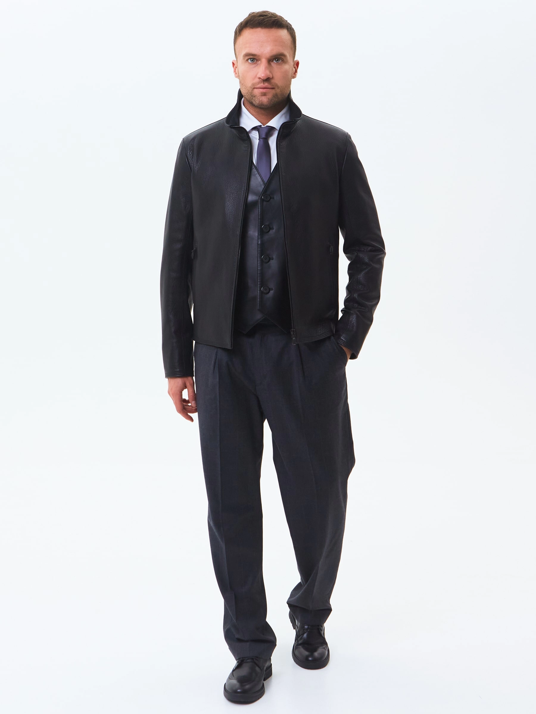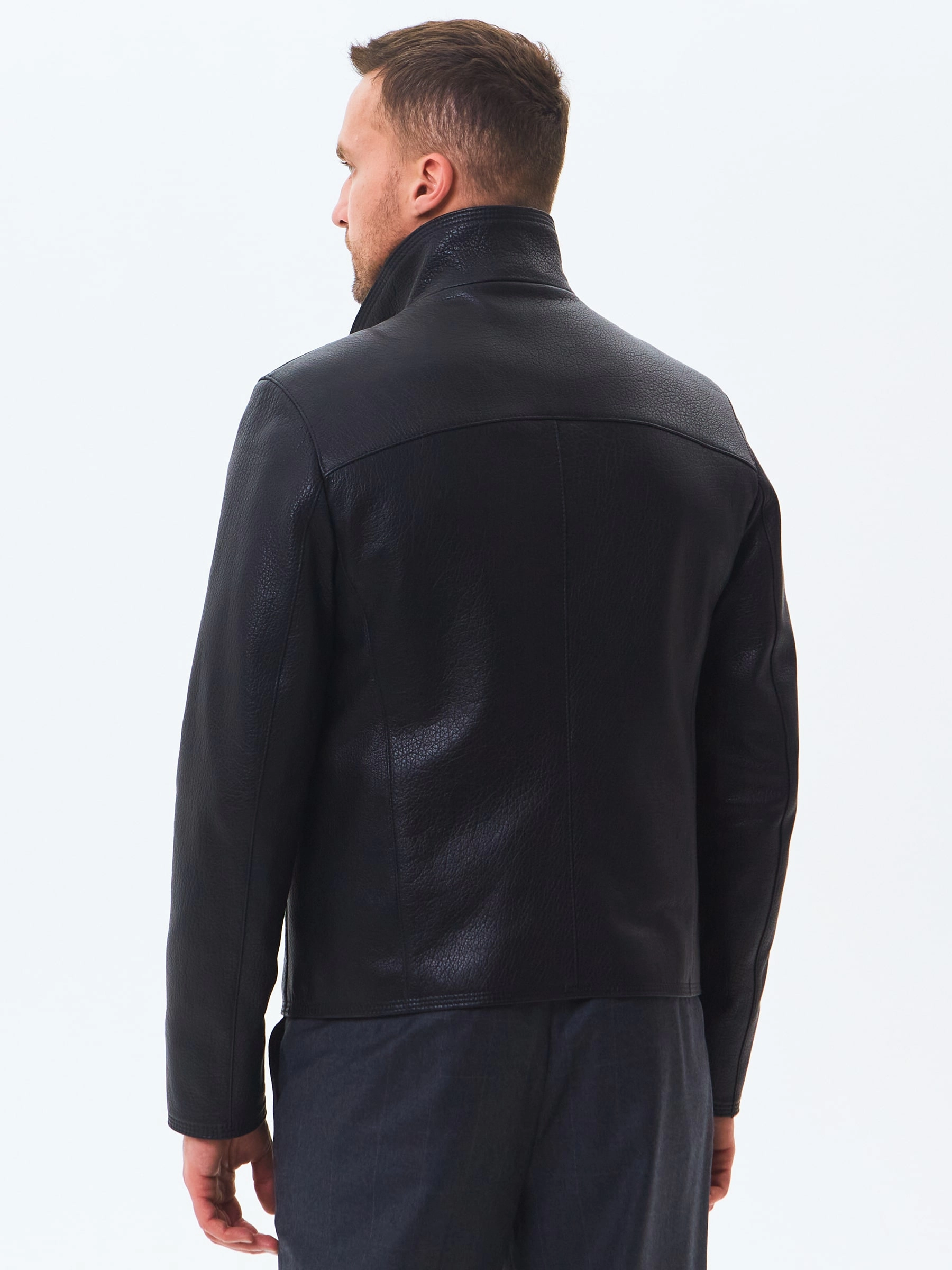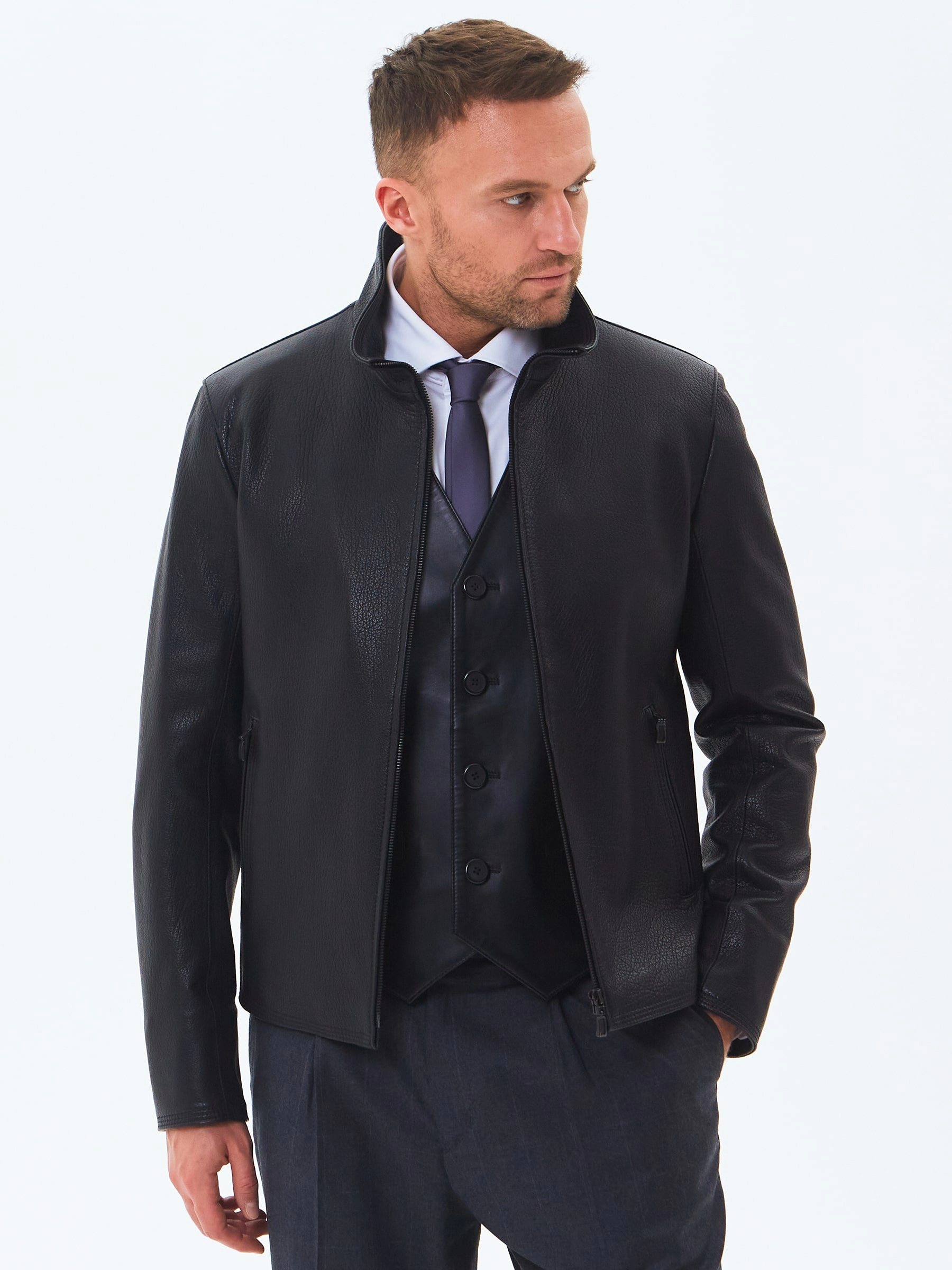 Отличным решением для прохладной погоды послужит короткая кожаная куртка в универсальном черном цвете. Полуприлегающий силуэт. Воротник стойка легко трансформируется в отложной. Застежка молния. Минимум фурнитуры. Основная черта этой модели: Профессиональный пошив и комфорт.