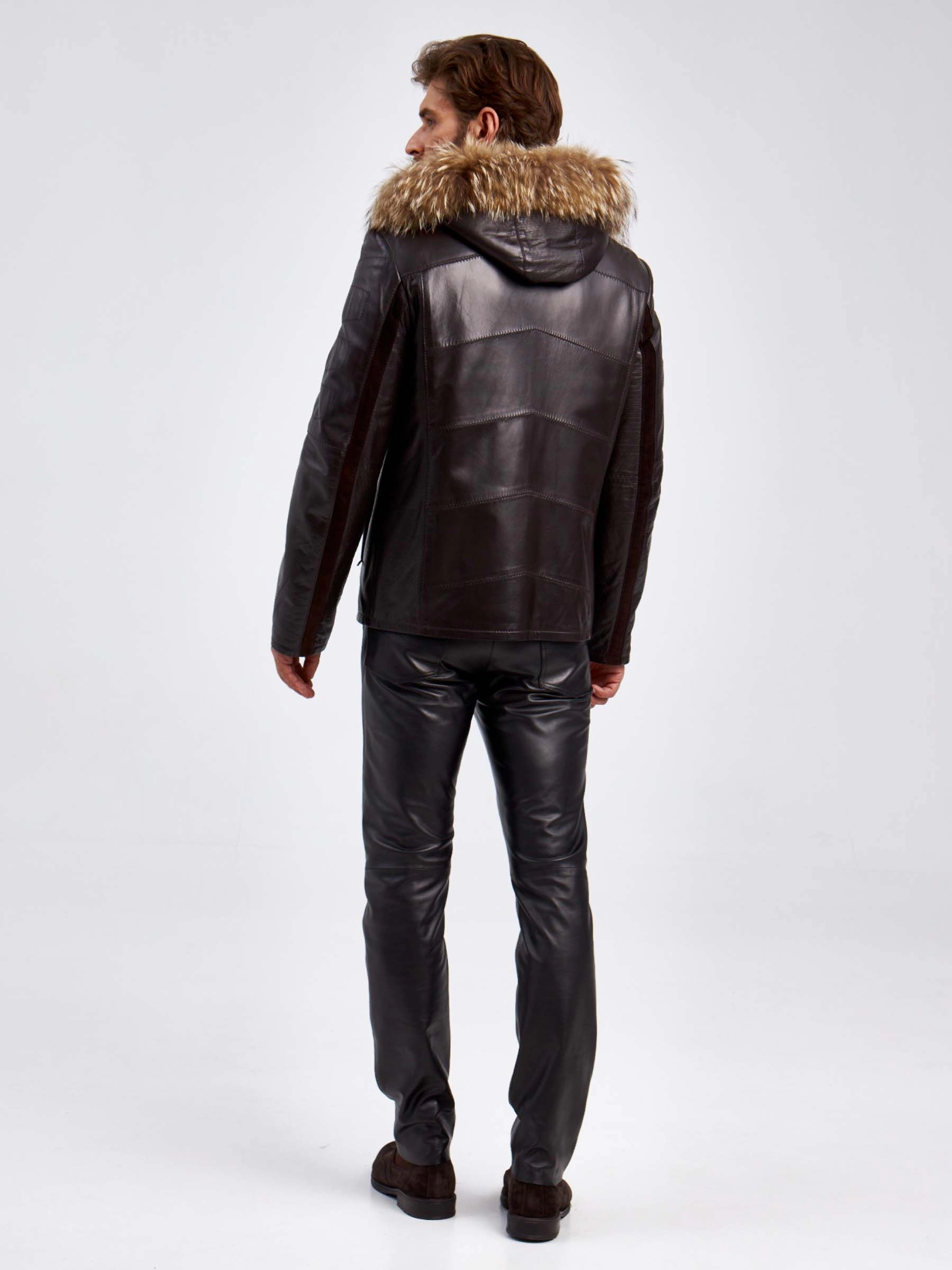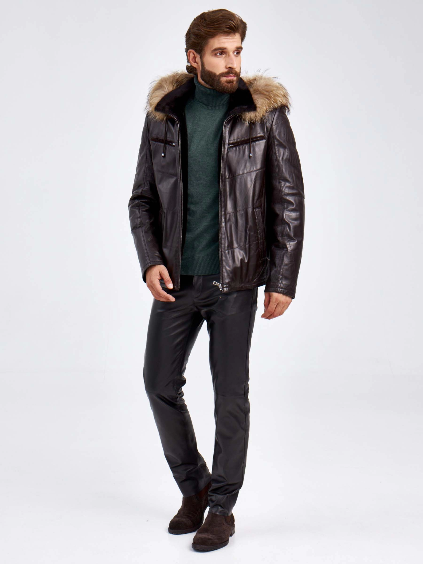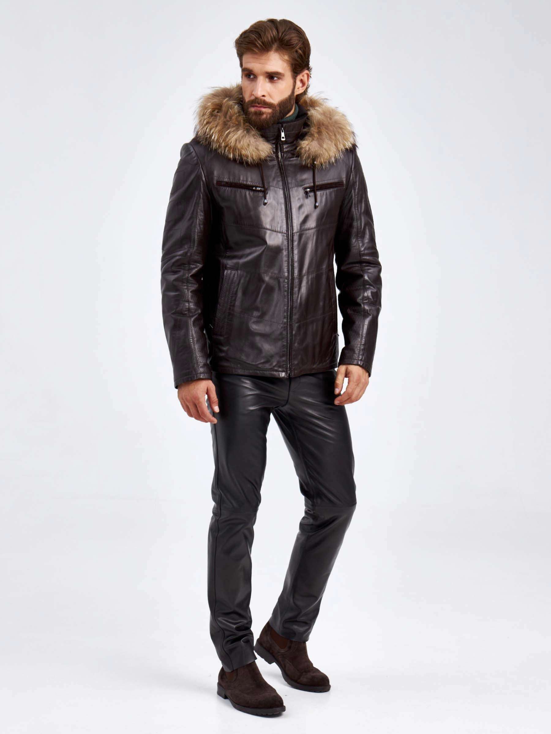Кожаная зимняя мужская куртка с капюшоном на подкладке из овчины 4273, черная, размер 50, артикул 29460