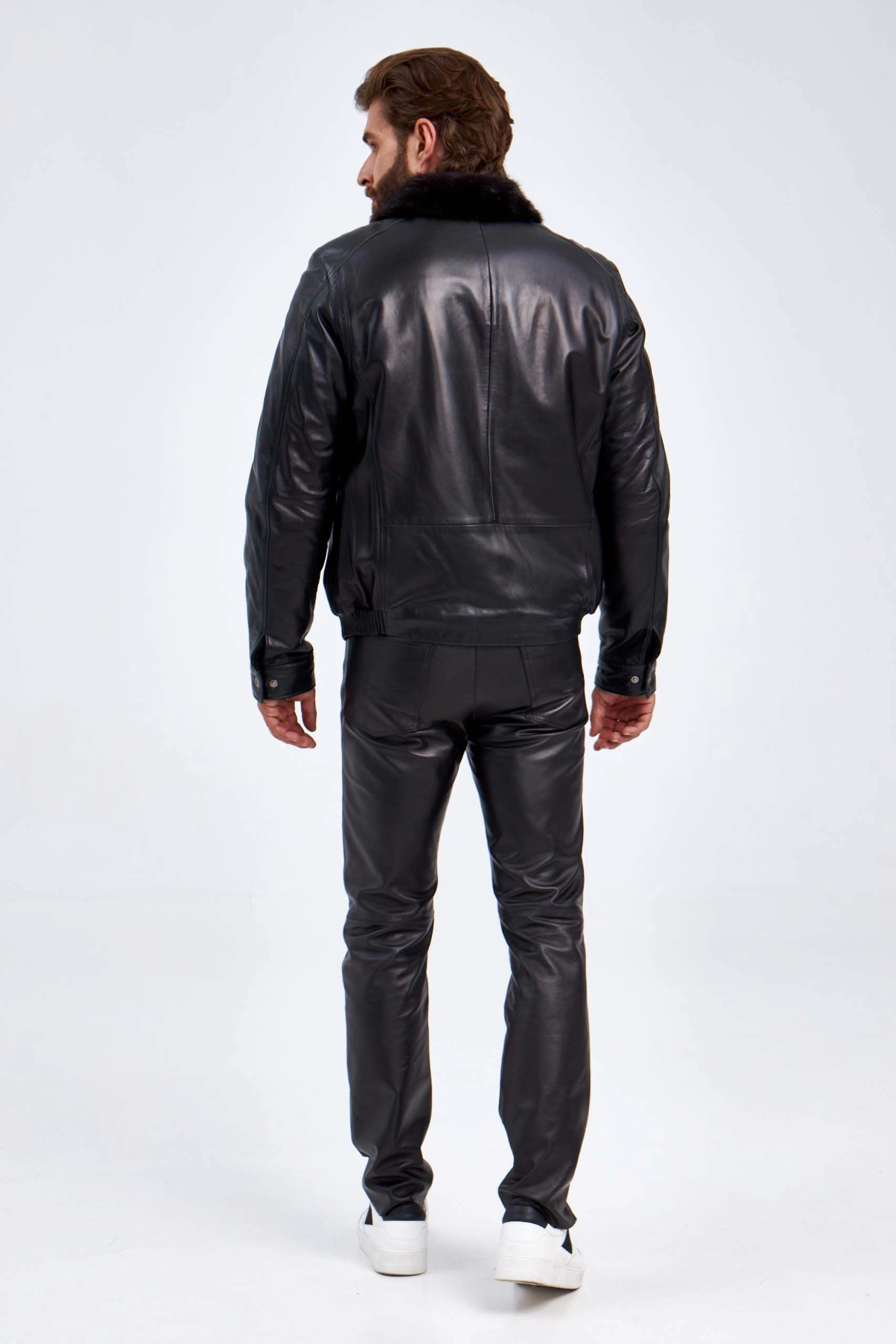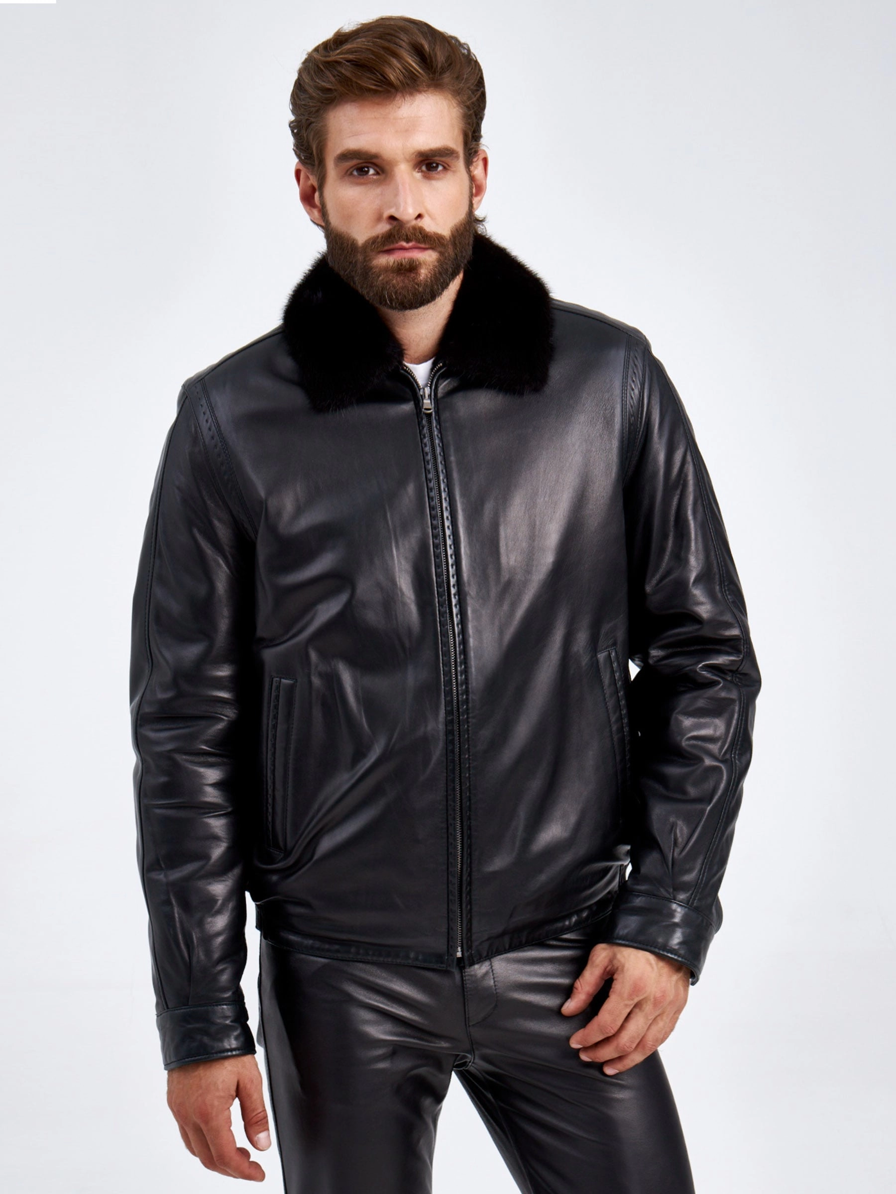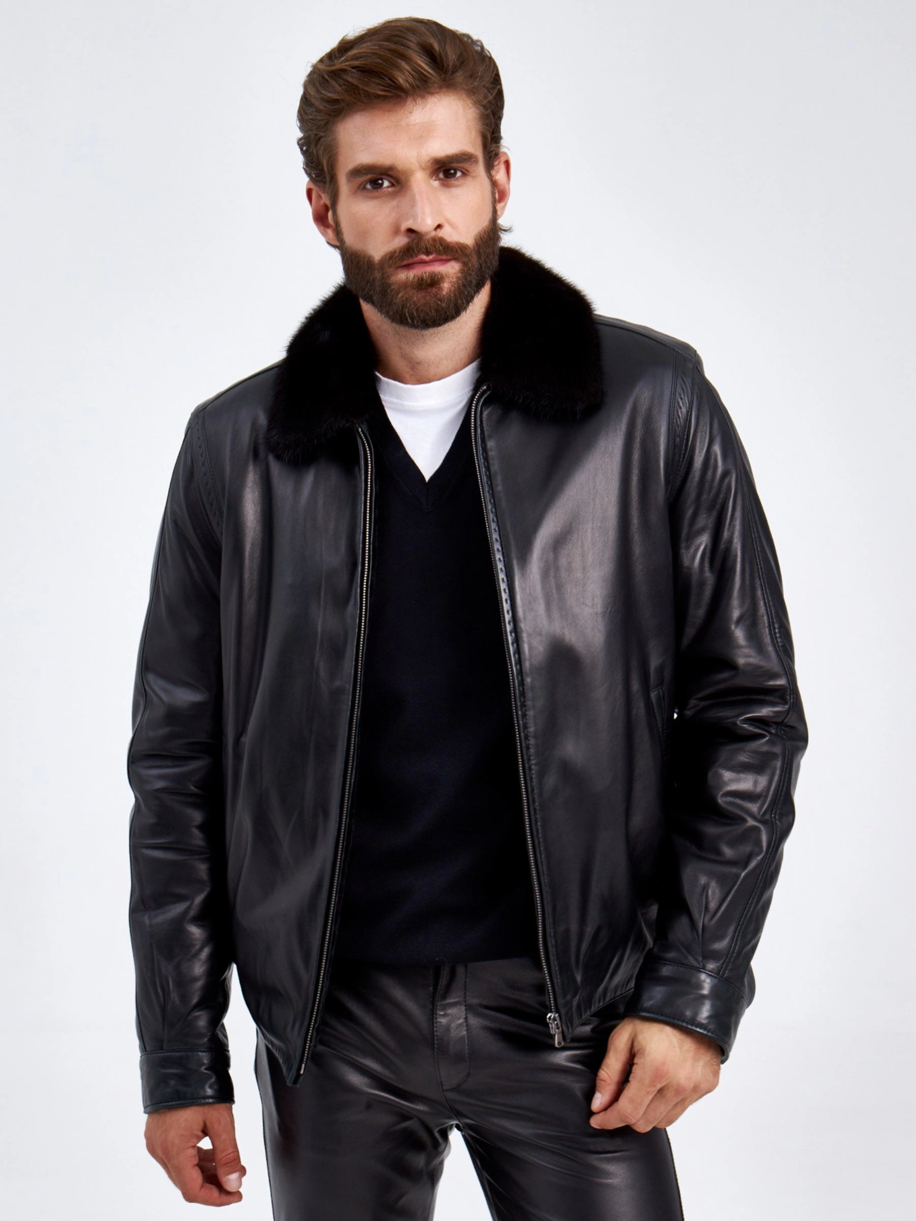 Кожаная зимняя мужская куртка на подкладке из овчины с норковым воротником 4634, черная, размер 48, артикул 29420
