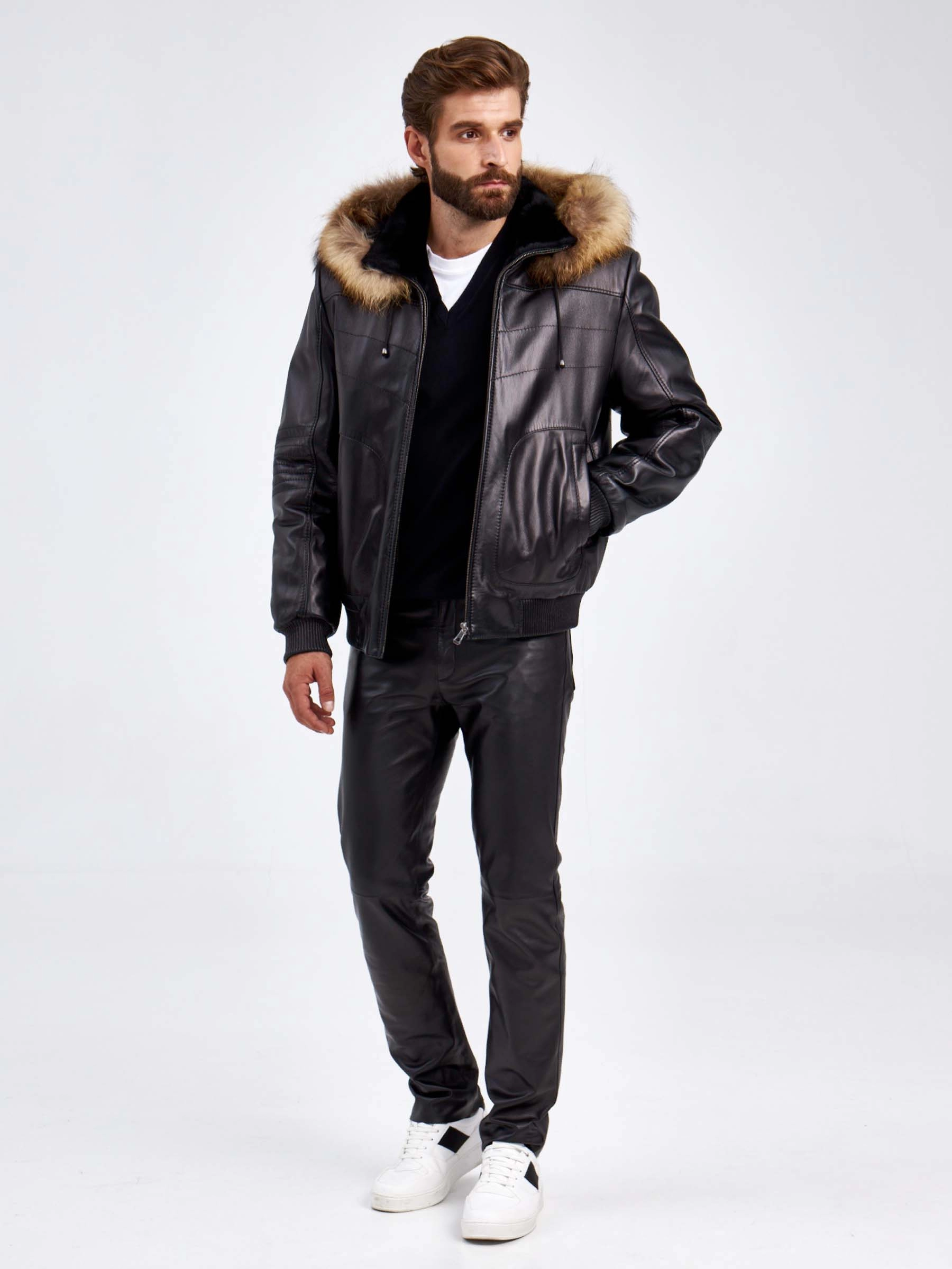 Зимний мужской кожаный бомбер с капюшоном на подкладке из овчины 4726, черный, размер 50, артикул 29430
