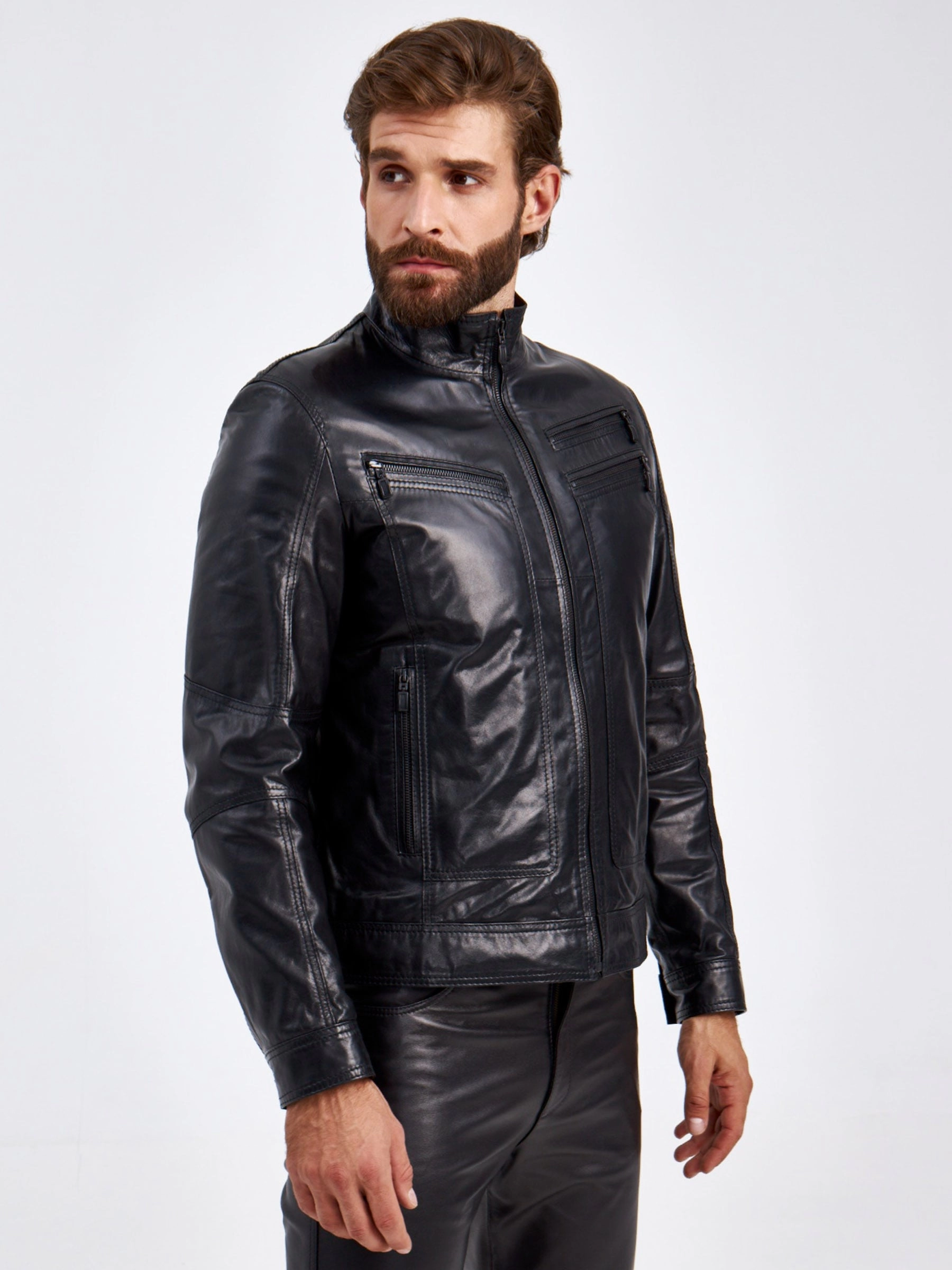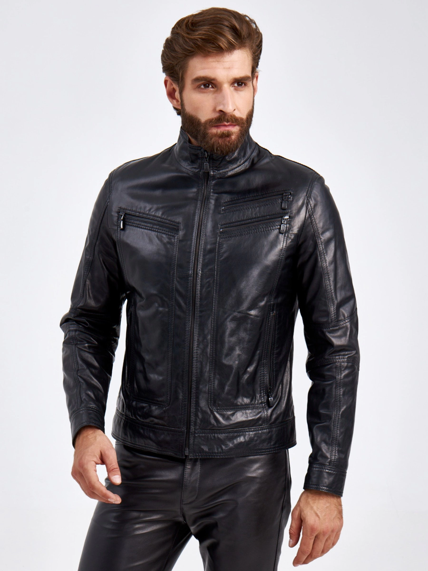 Мужская куртка в универсальном черном цвете. Кожа премиального качества. Воротник-стойка оптимальный по высоте. Застёжка-молния. Рукав втачной. Нагрудные карманы на молниях. Предусмотрены удобные внутренние карманы для документов. Безупречная работа наших портных. Обеспечена идеальная посадка по фигуре и прекрасная свобода движений.