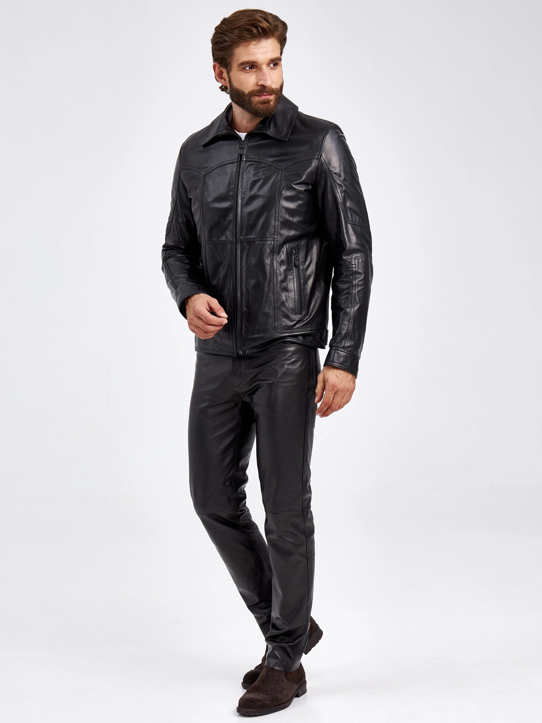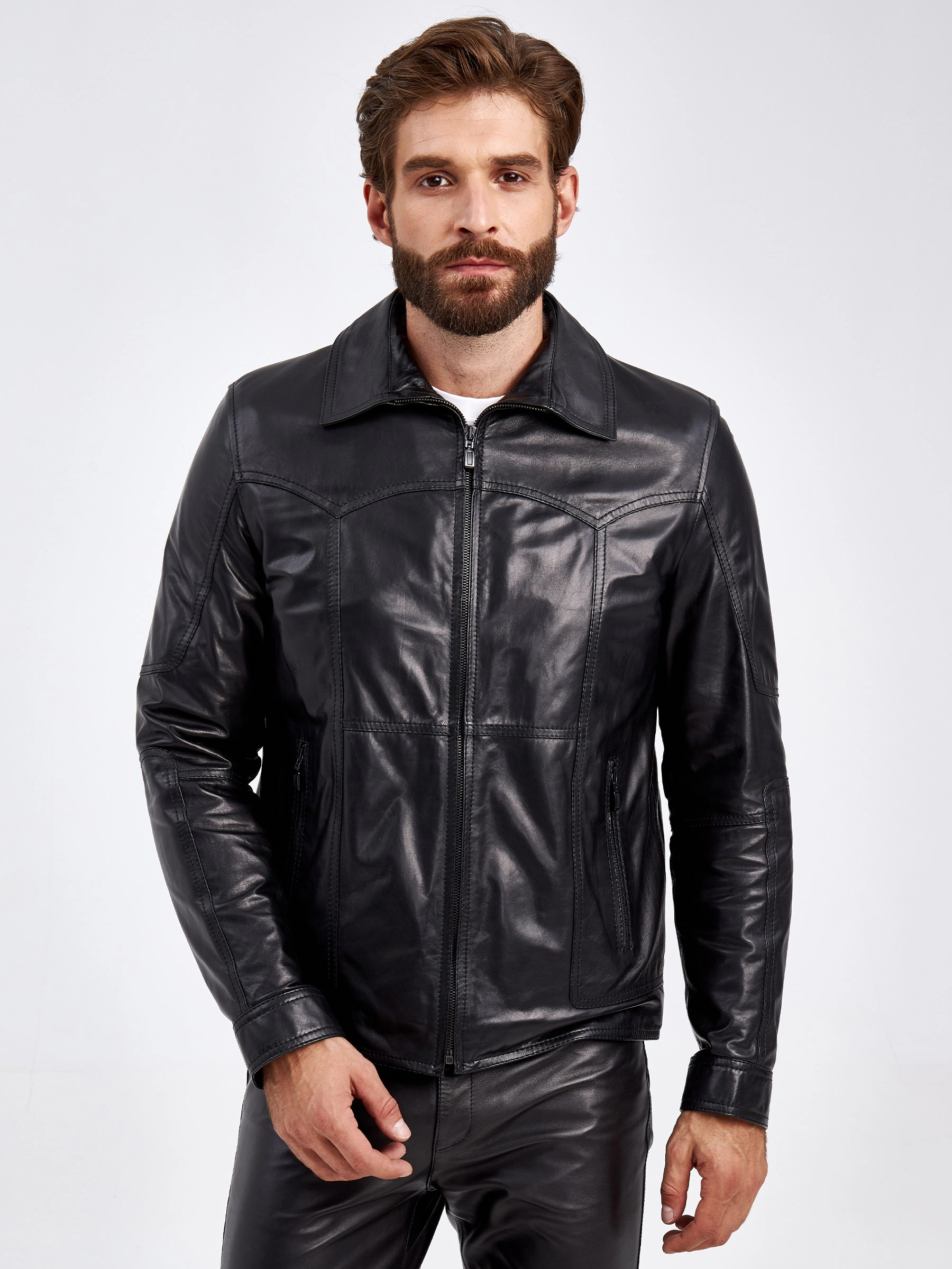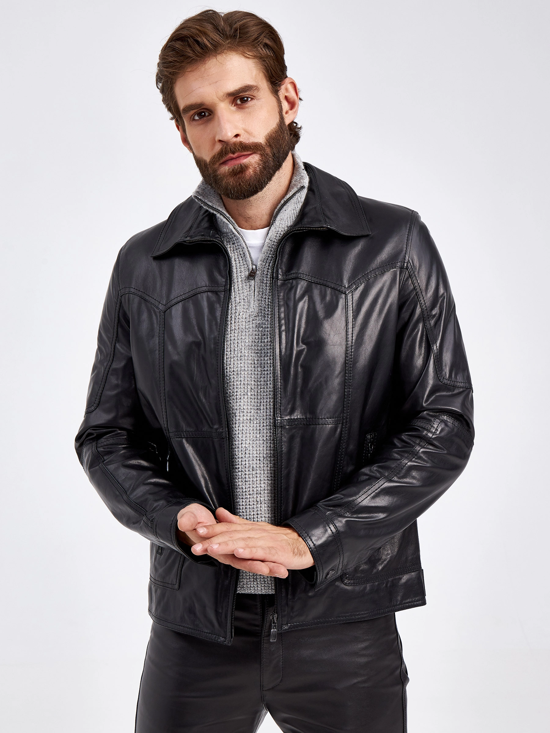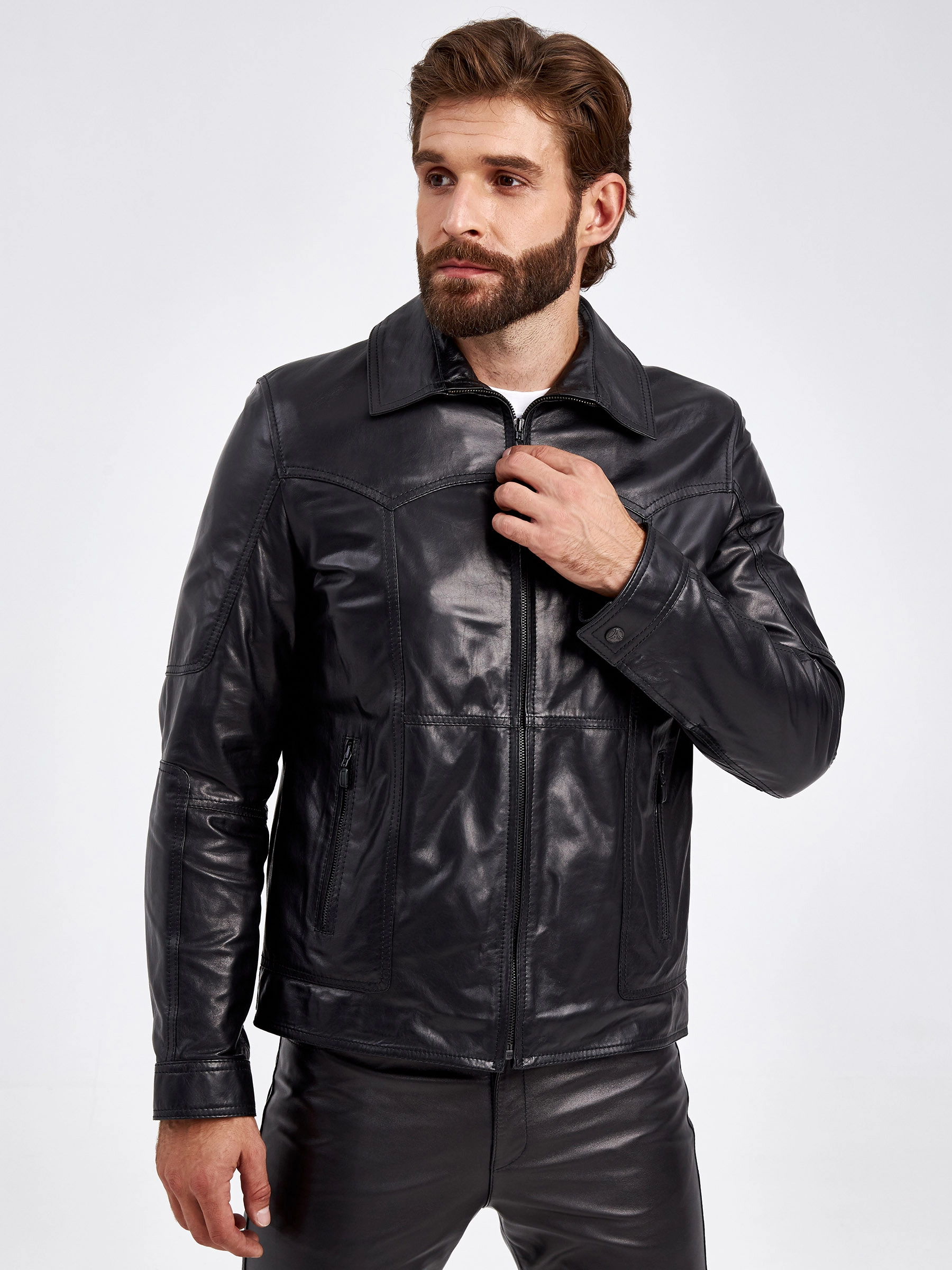 Мужская куртка в универсальном черном цвете. Кожа премиального качества. Воротник-отложной. Застёжка-молния. Рукав втачной. Боковые карманы на молниях. Предусмотрены удобные внутренние карманы для документов. Безупречная работа наших портных. Обеспечена идеальная посадка по фигуре и прекрасная свобода движений.