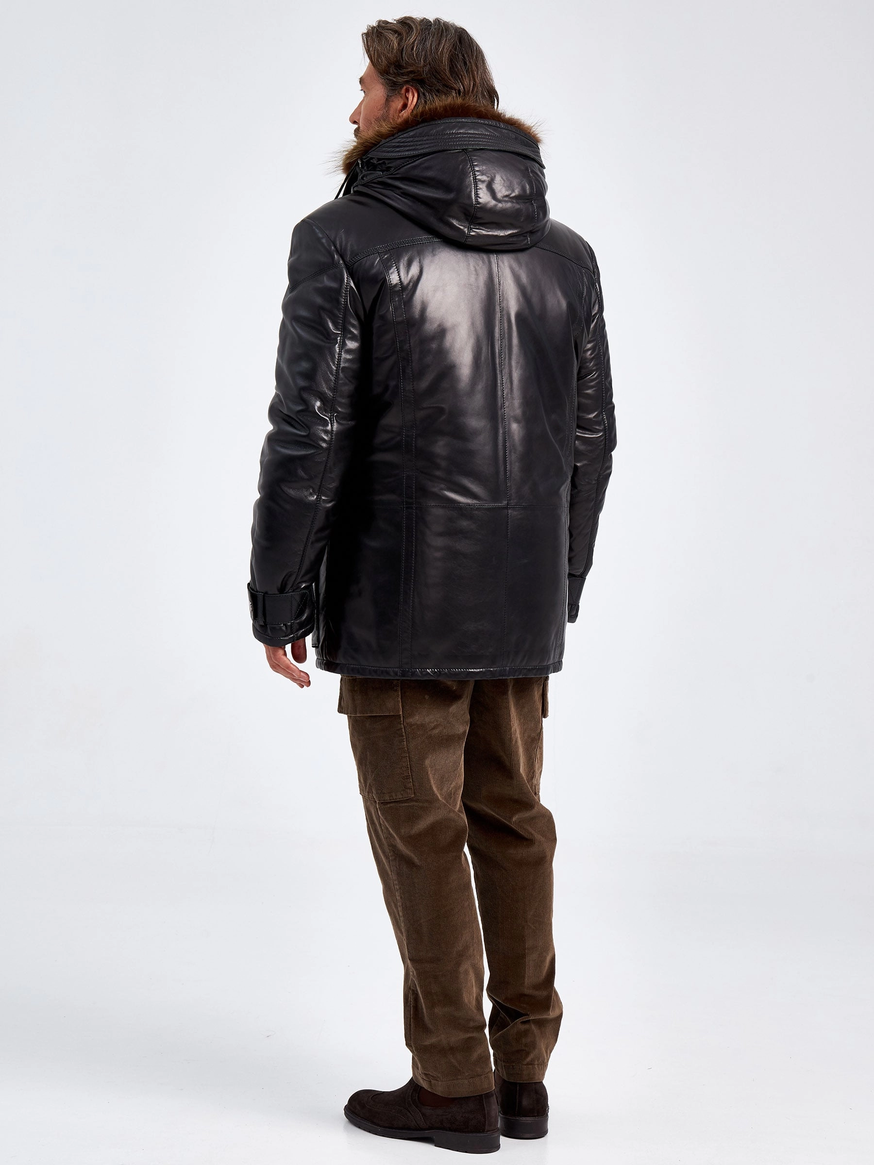 Товар зимняя мужская кожаная куртка с капюшоном на подкладке из меха енота 511, черная, размер 56, артикул 40730 выполнен из натуральной кожи с застежкой молния. Рассчитан на сезон: осень-зима. Длина изделия 75-90 см, силуэт прямой.