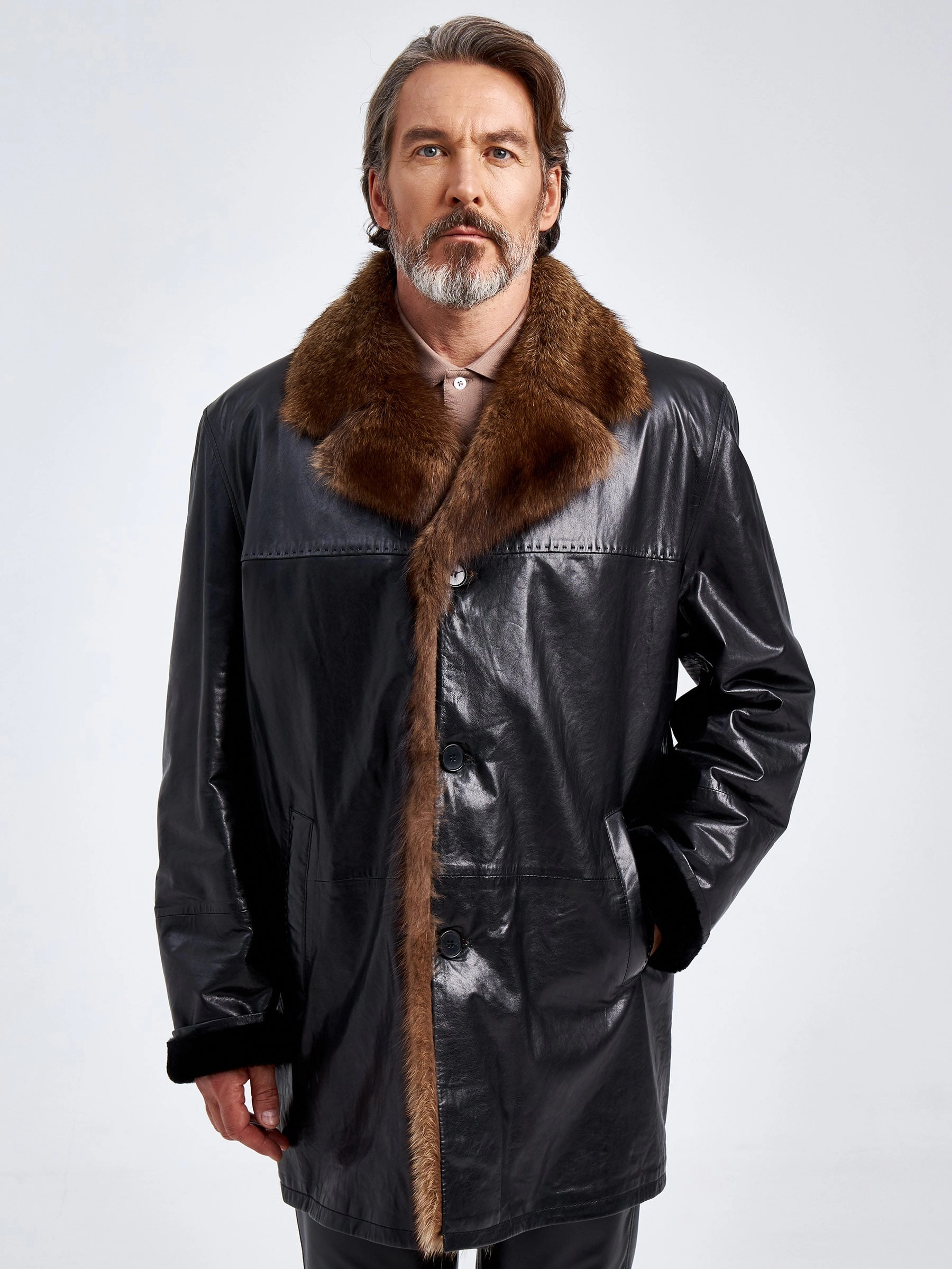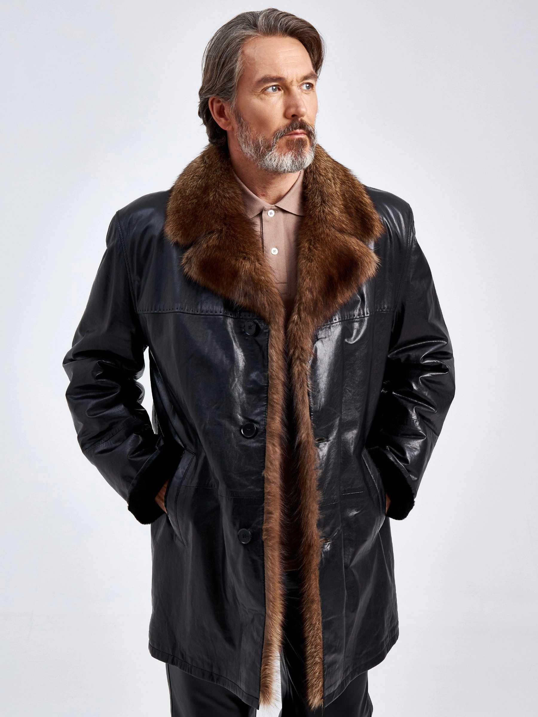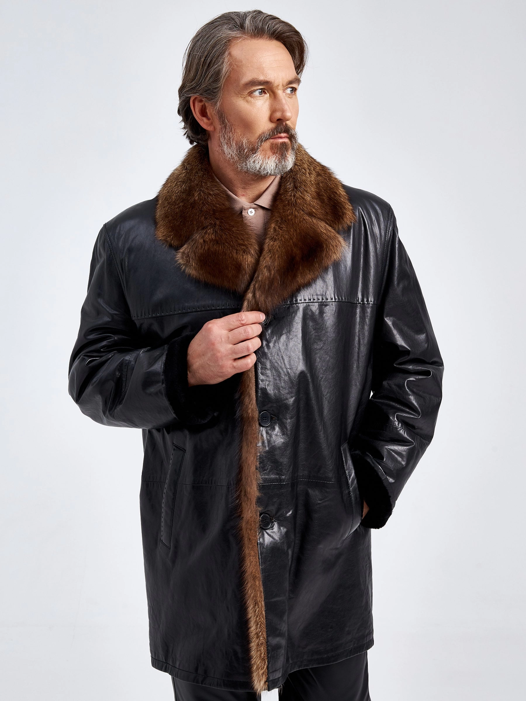 Товар кожаное мужское зимнее полупальто с воротником меха соболя премиум класса 5140, черное, размер 56, артикул 40570 выполнен из натуральной кожи с застежкой пуговицы. Рассчитан на сезон: осень-зима. Длина изделия 87 см, силуэт прямой.