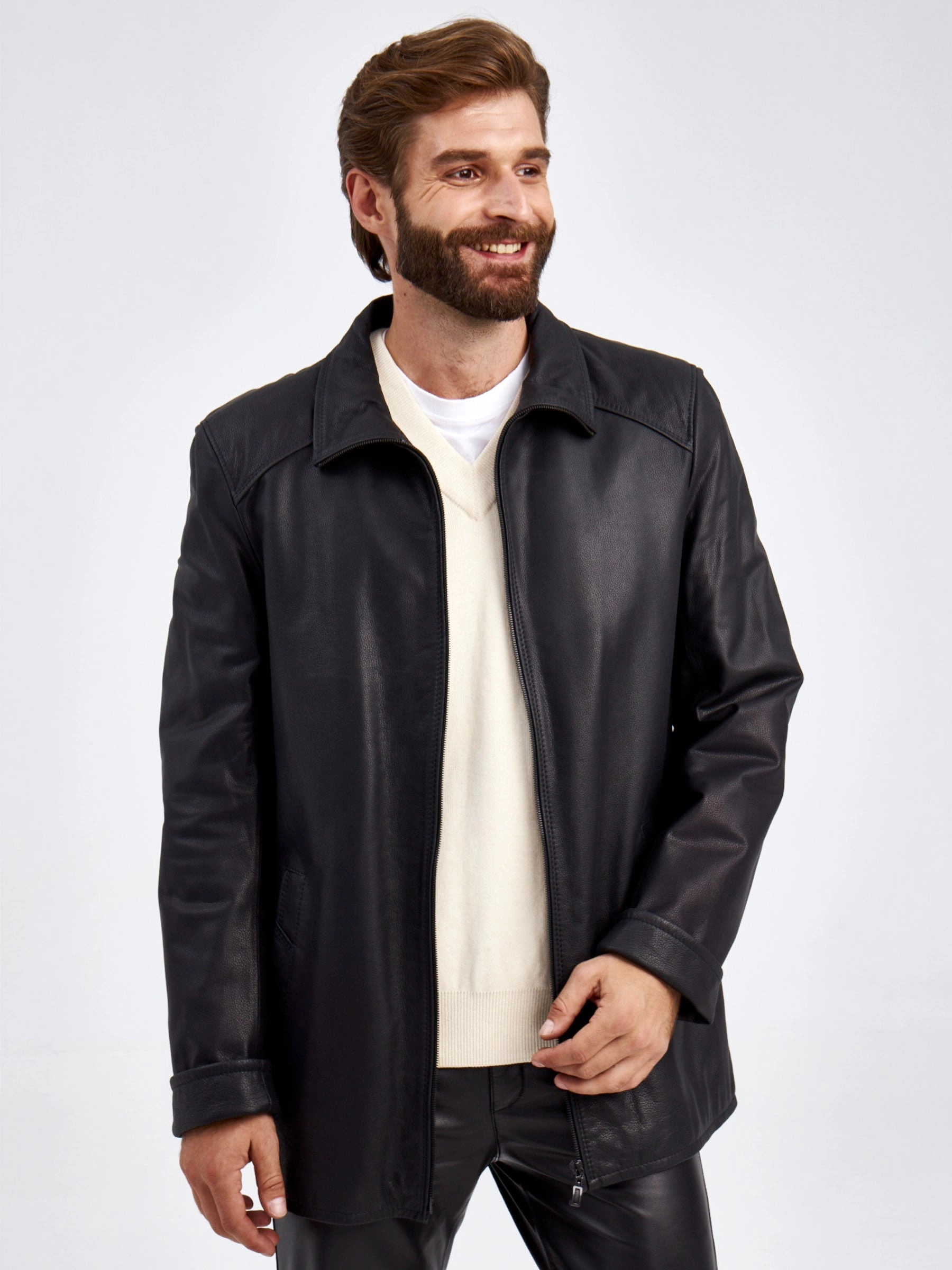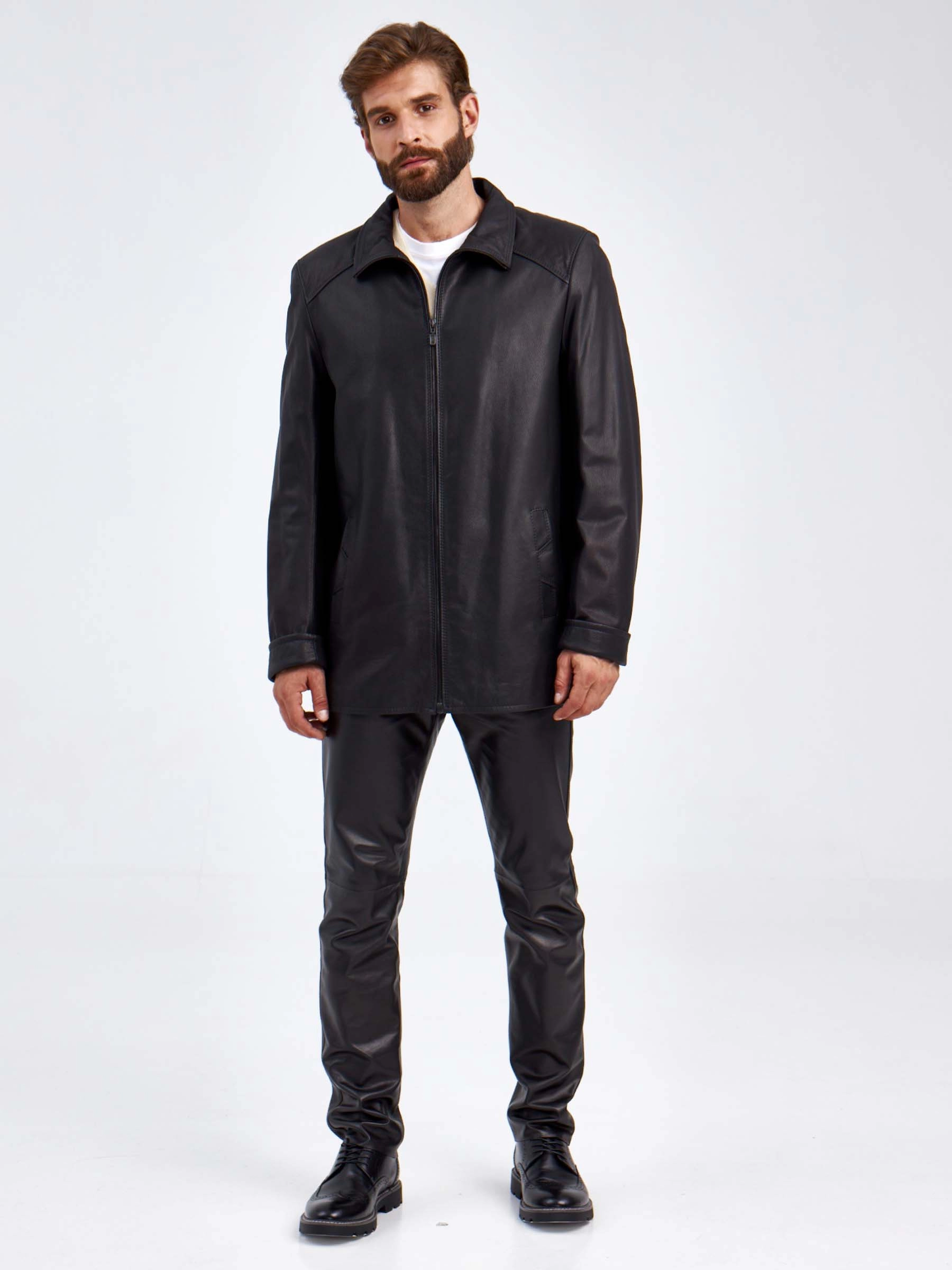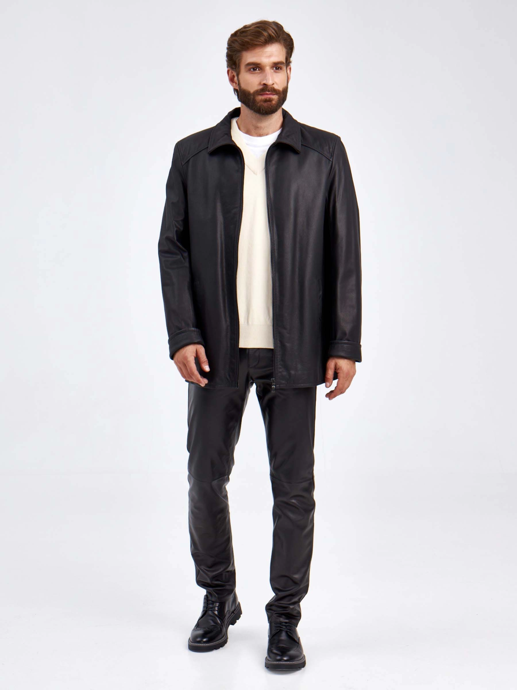 Кожаная мужская куртка прямого силуэта, застегивающаяся на молнию. Отложной воротник плавно трансформируется в стойку. Идеальная посадка по фигуре. Великолепное сочетание как с классическим костюмом, так и с кожаными брюками.