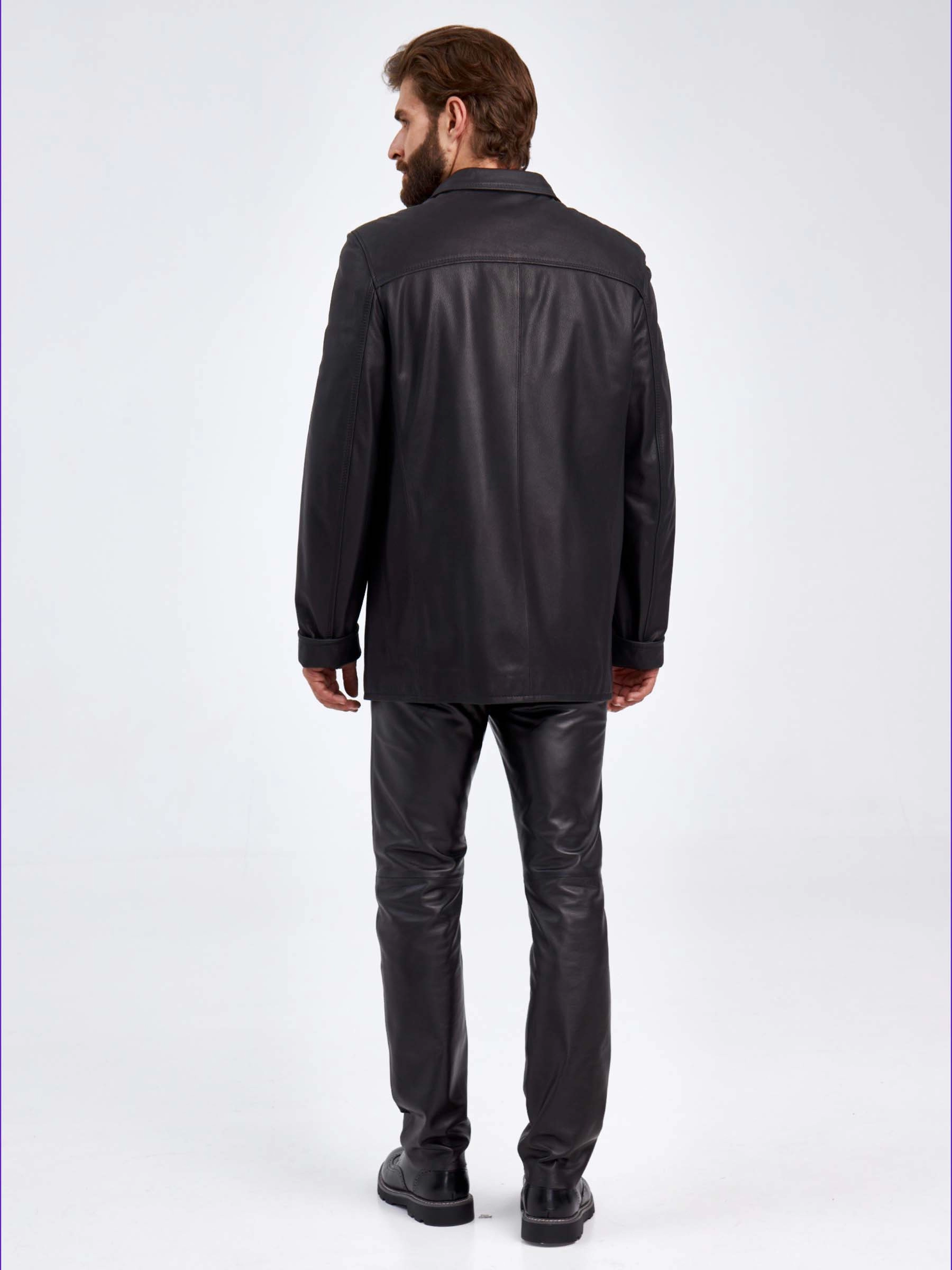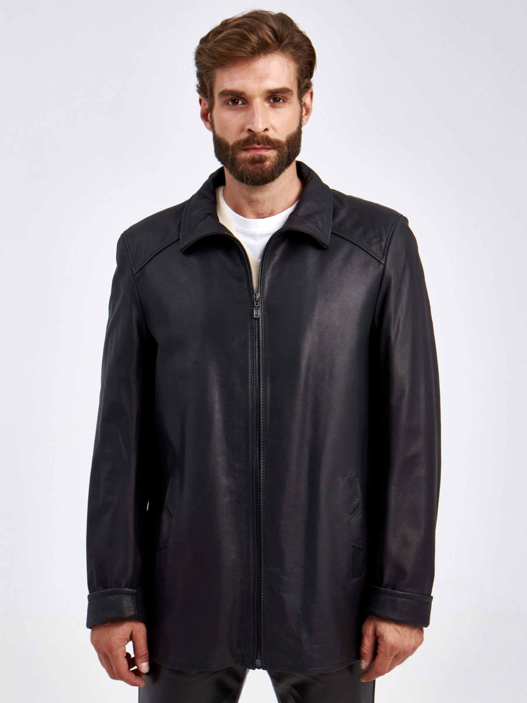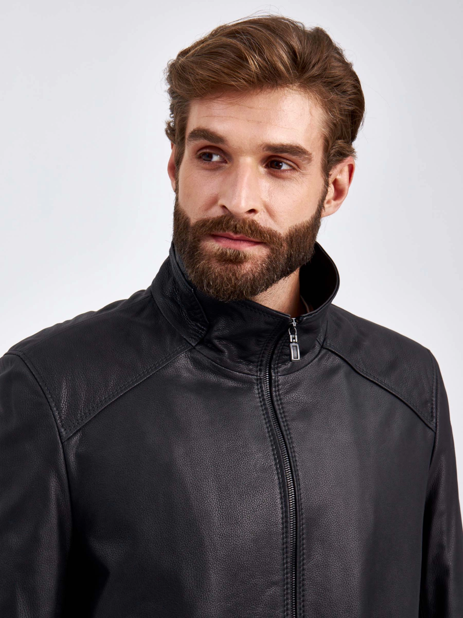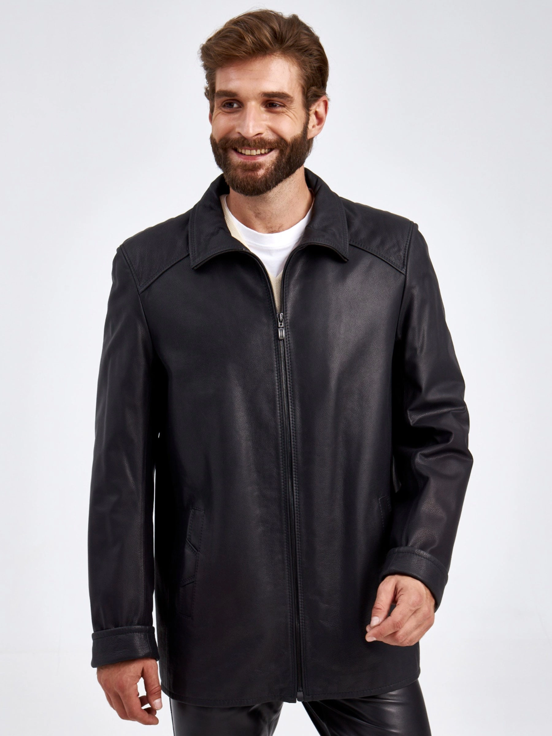 Кожаная мужская куртка прямого силуэта, застегивающаяся на молнию. Отложной воротник плавно трансформируется в стойку. Идеальная посадка по фигуре. Великолепное сочетание как с классическим костюмом, так и с кожаными брюками.