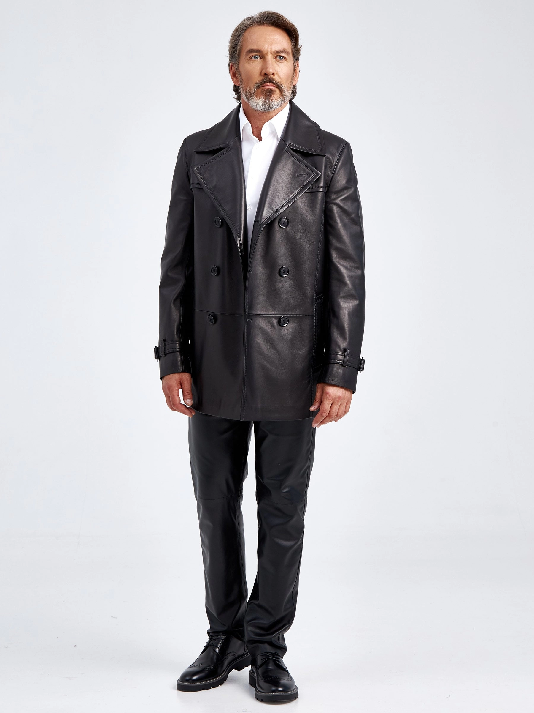 Двубортный мужской кожаный тренч на поясе 525, черный, размер 50, артикул 29060