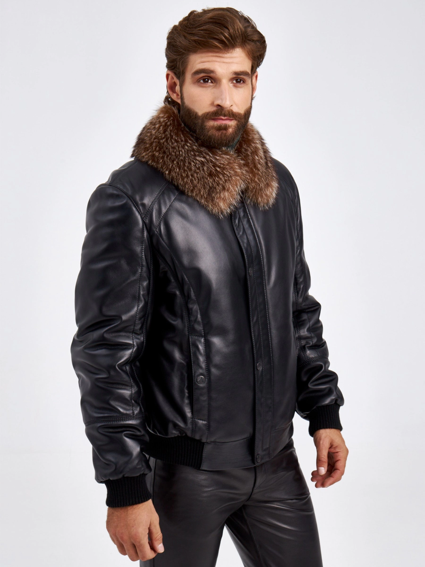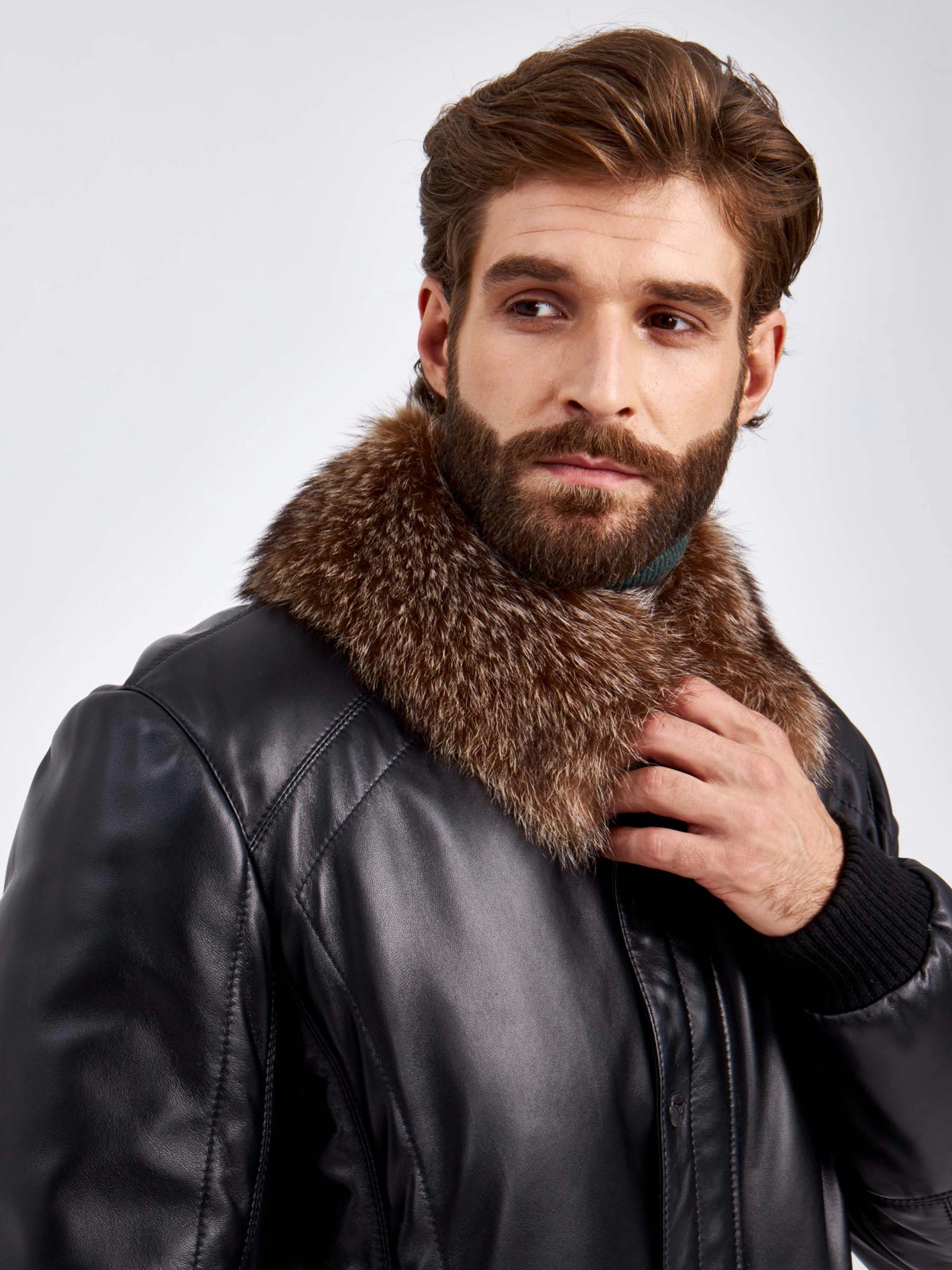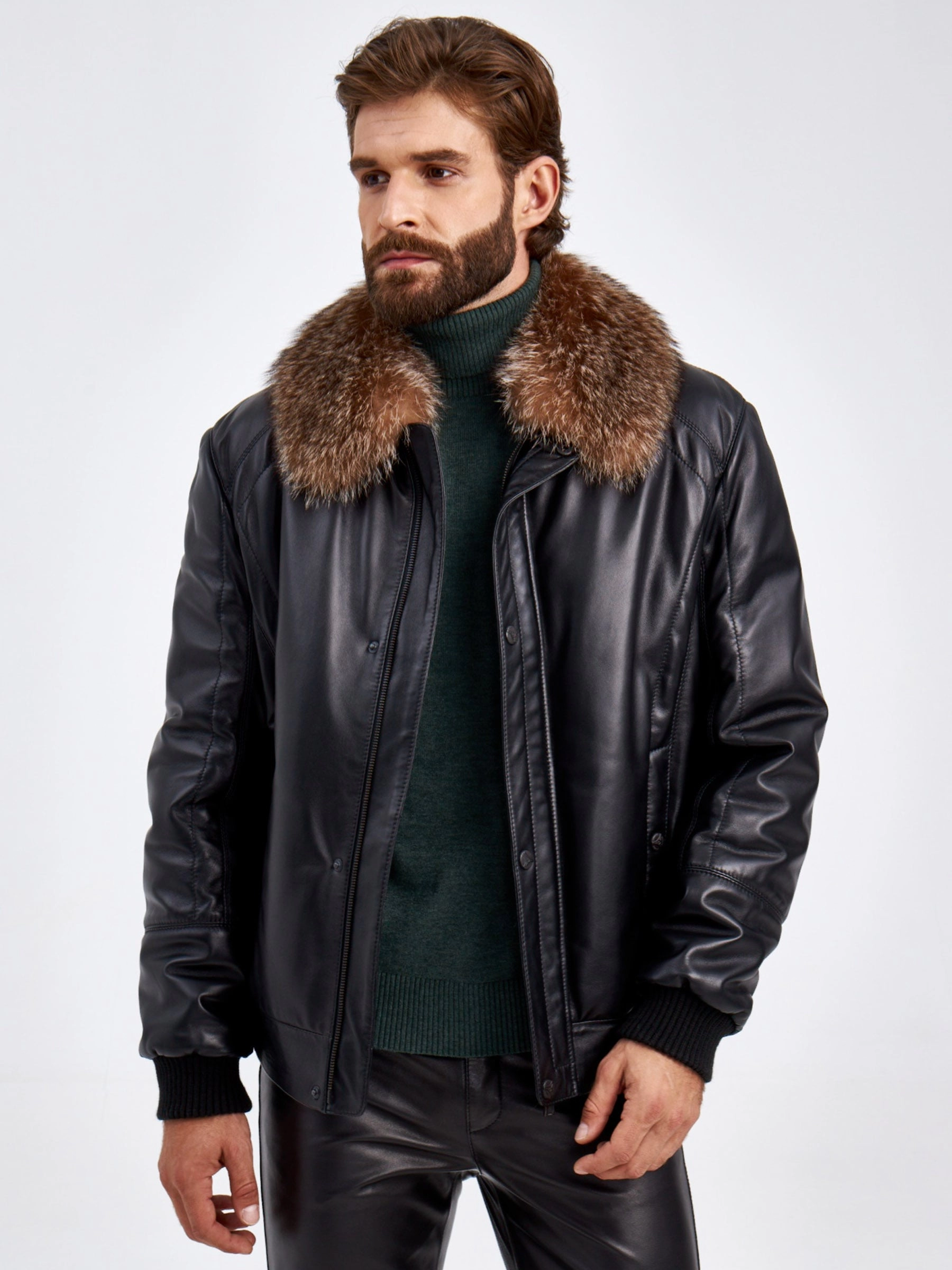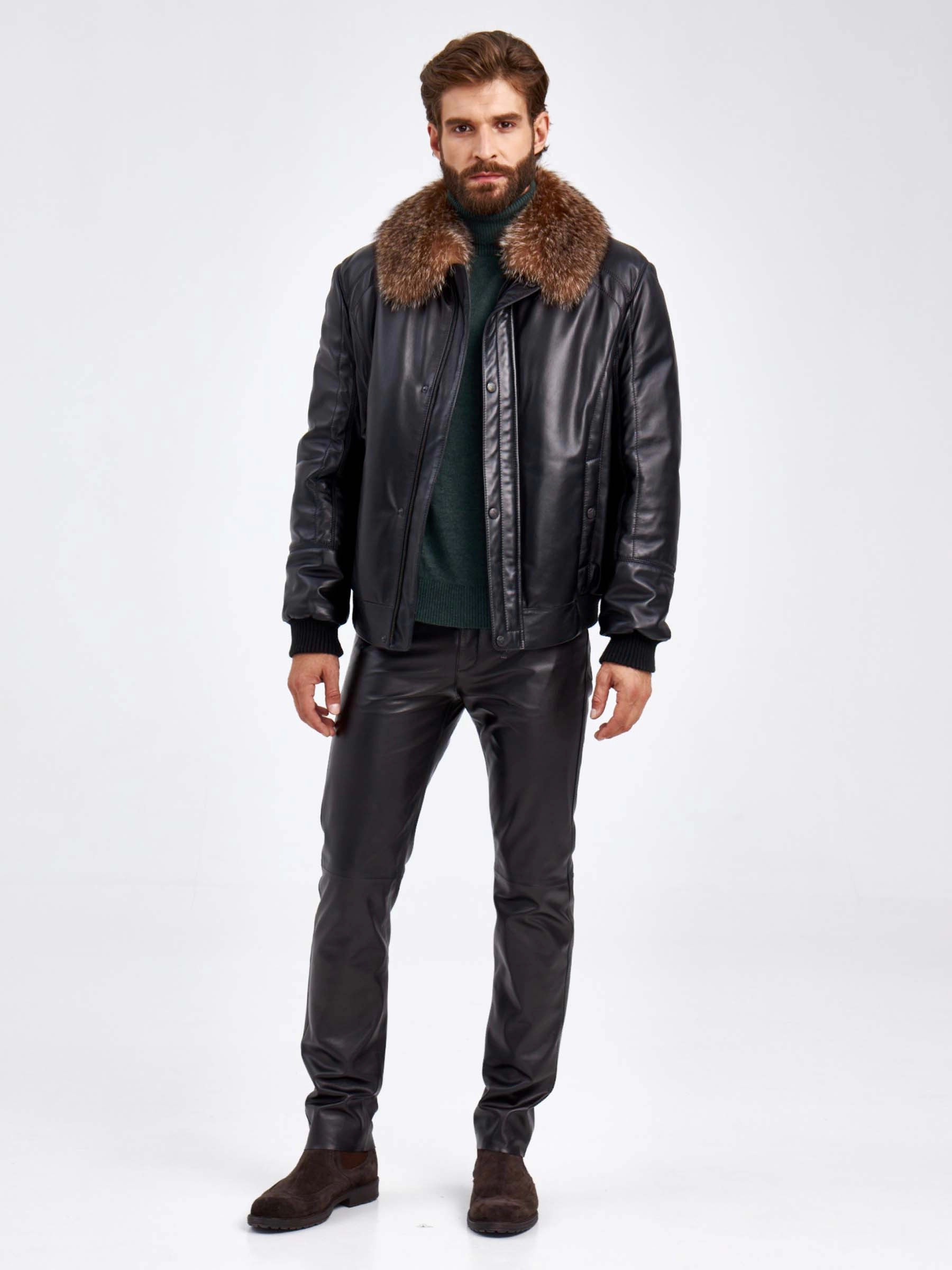 Кожаный утепленный мужской пуховик с воротником из меха енота 532, черный, размер 52, артикул 29210