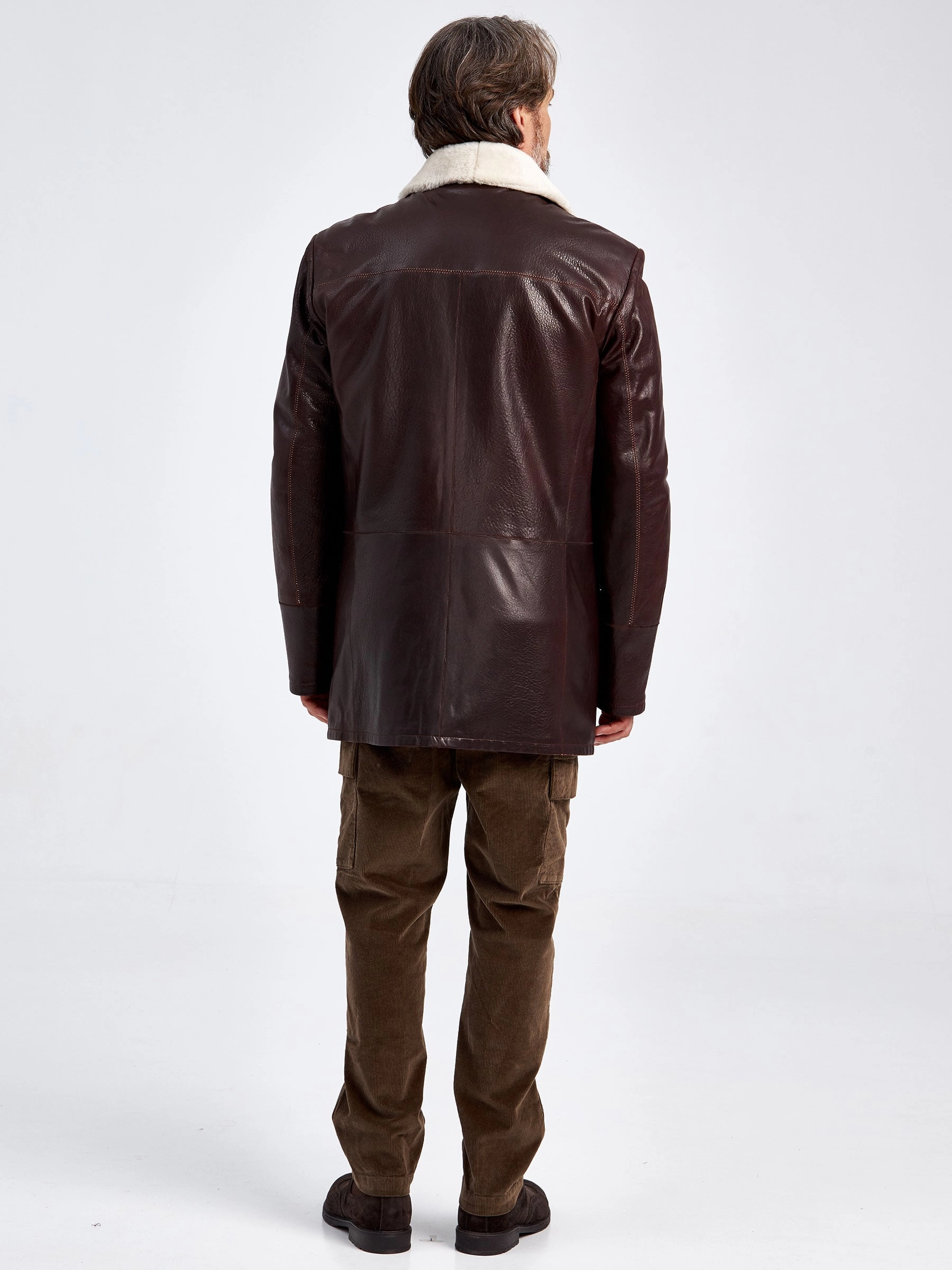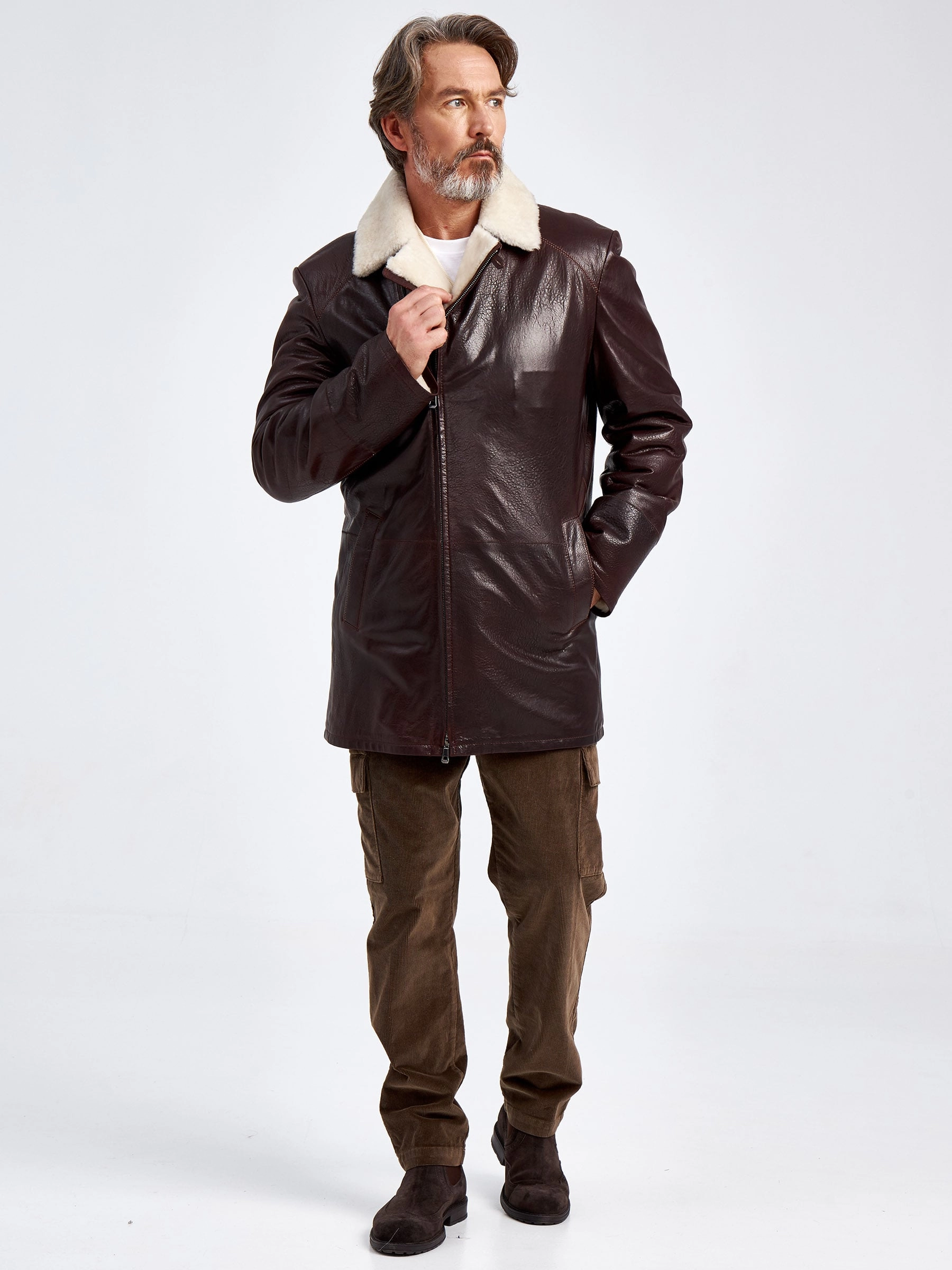 Зимняя мужская кожаная куртка на подкладке из овчины 5449, коричневая, размер 46, артикул 40620