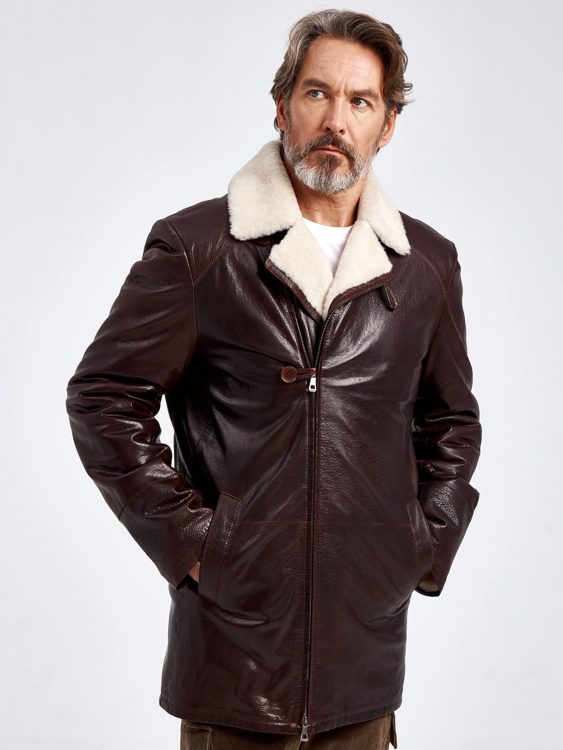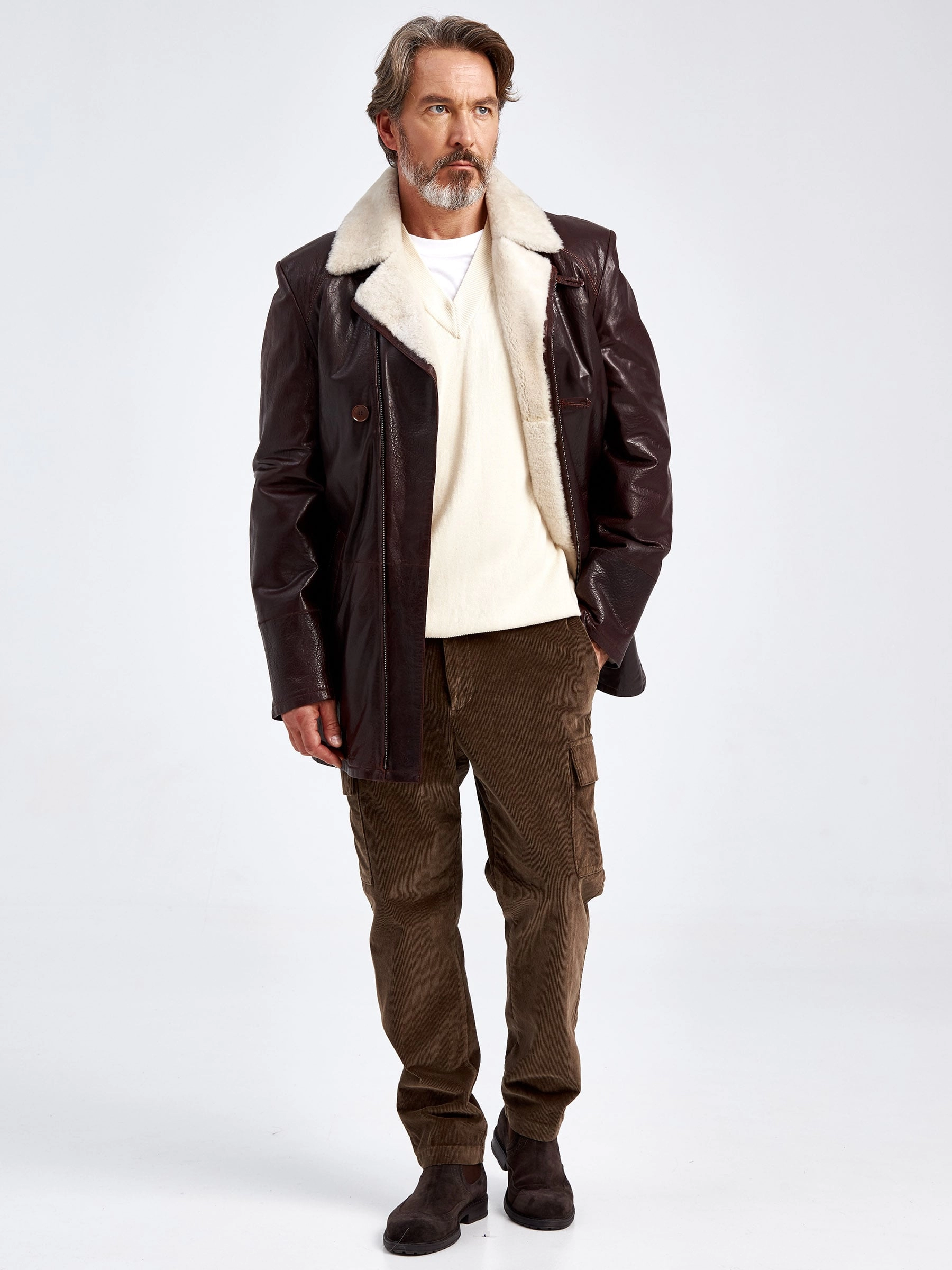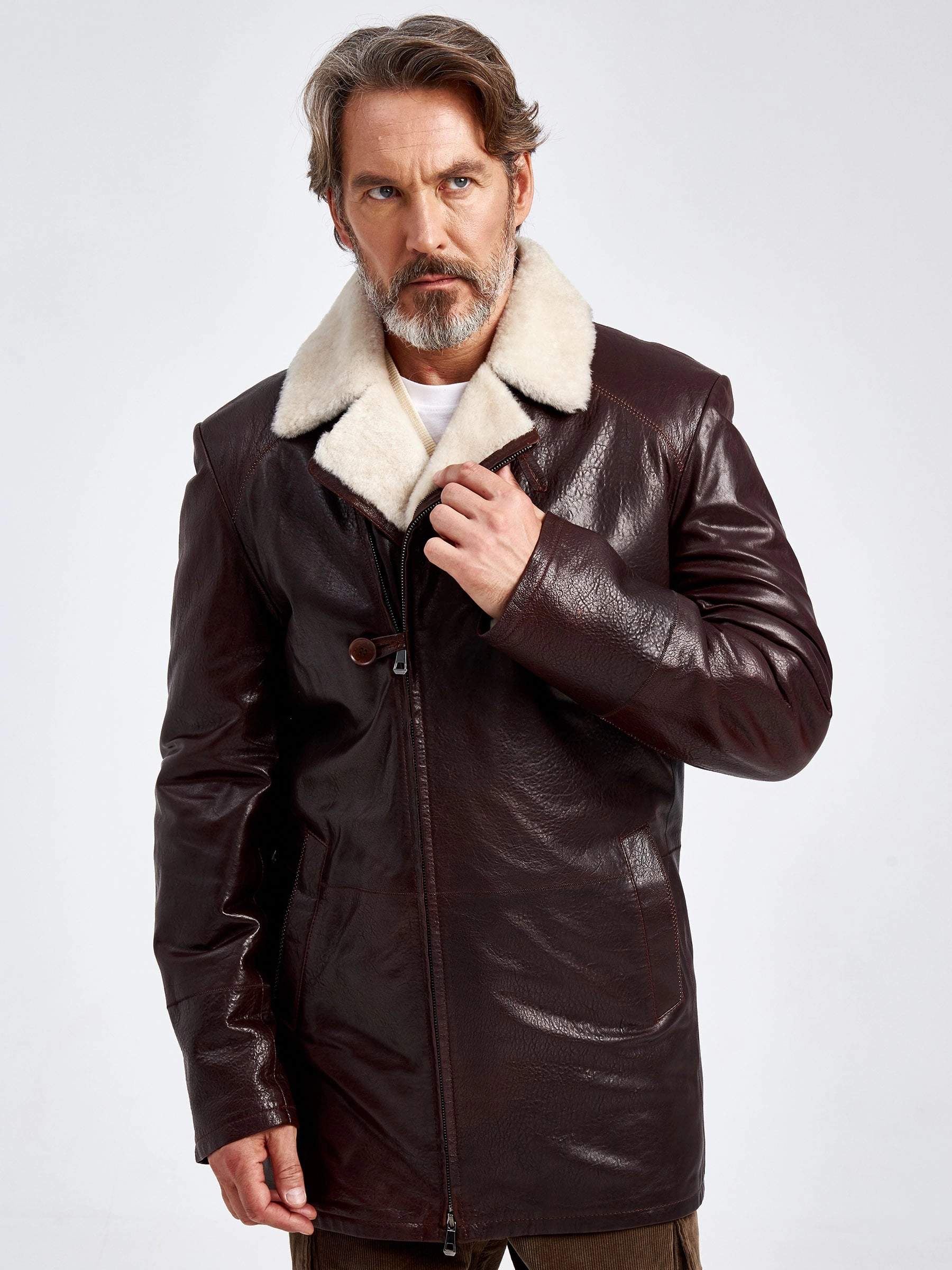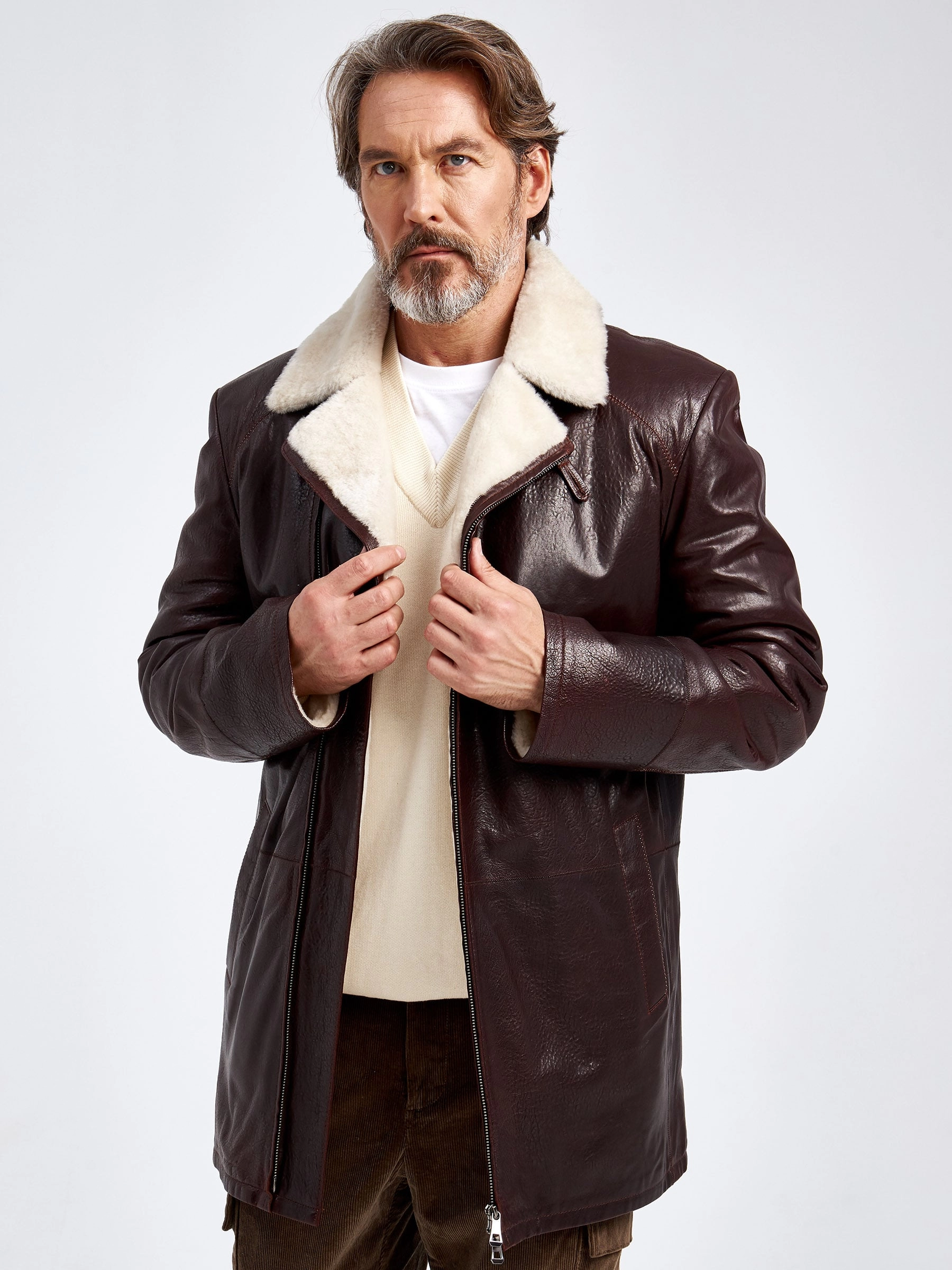 Товар зимняя мужская кожаная куртка на подкладке из овчины 5449, коричневая, размер 46, артикул 40620 выполнен из натуральной кожи с застежкой молния. Рассчитан на сезон: осень-зима. Длина изделия 87 см, силуэт полуприлегающий.