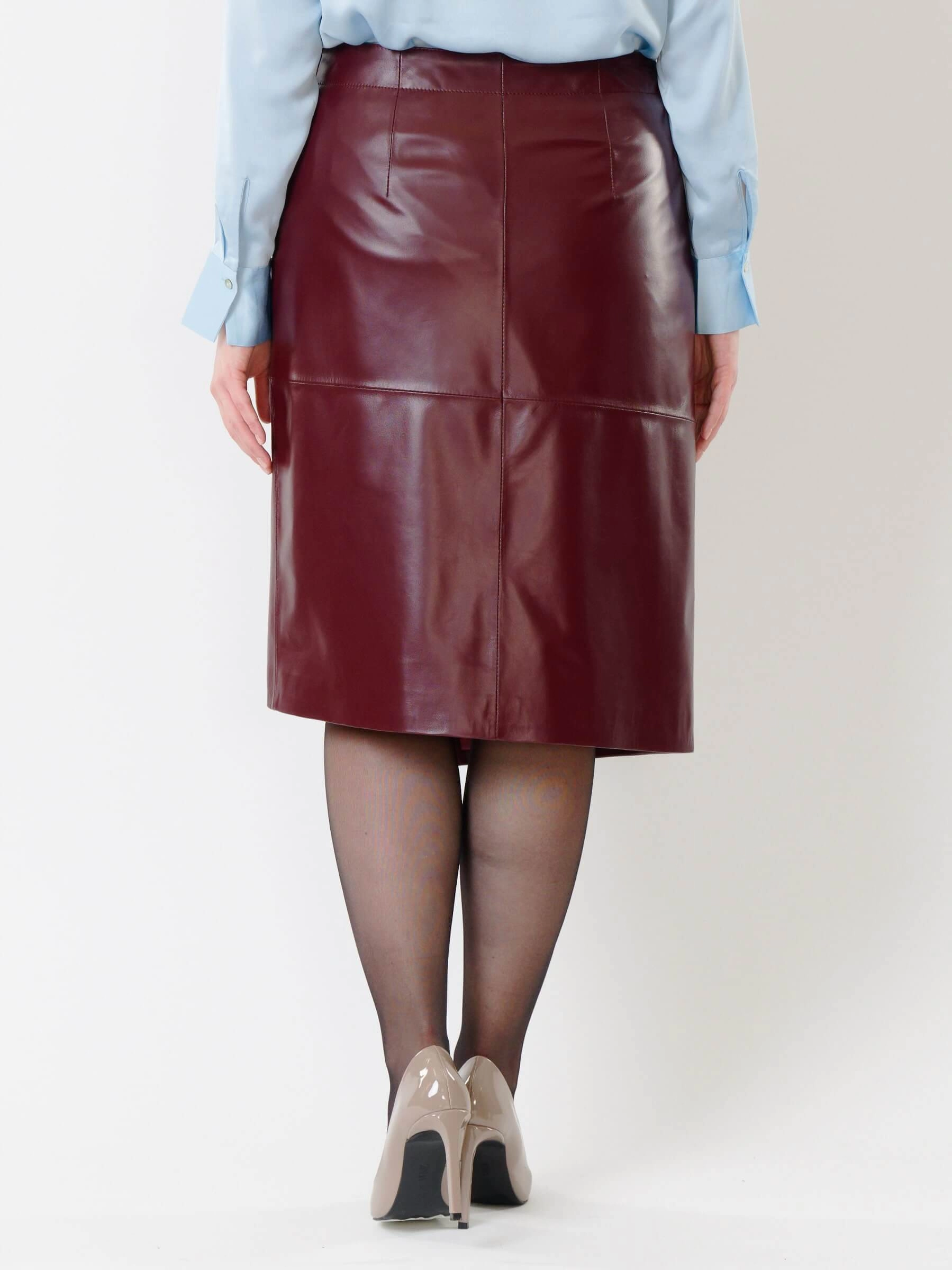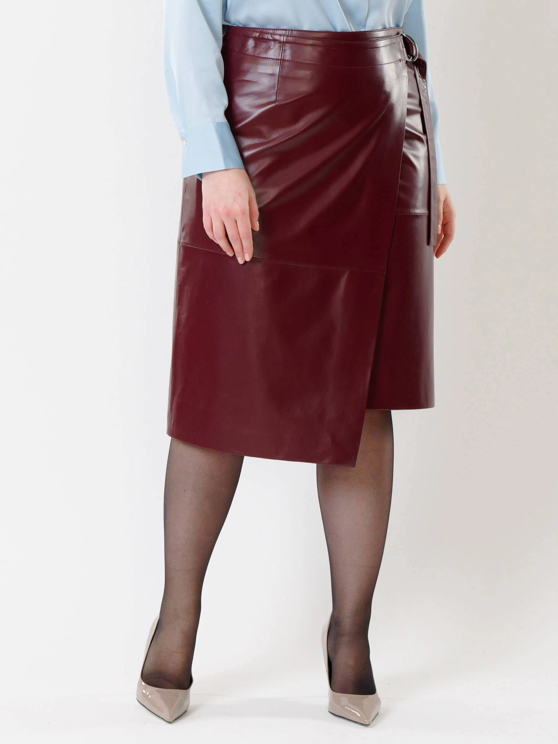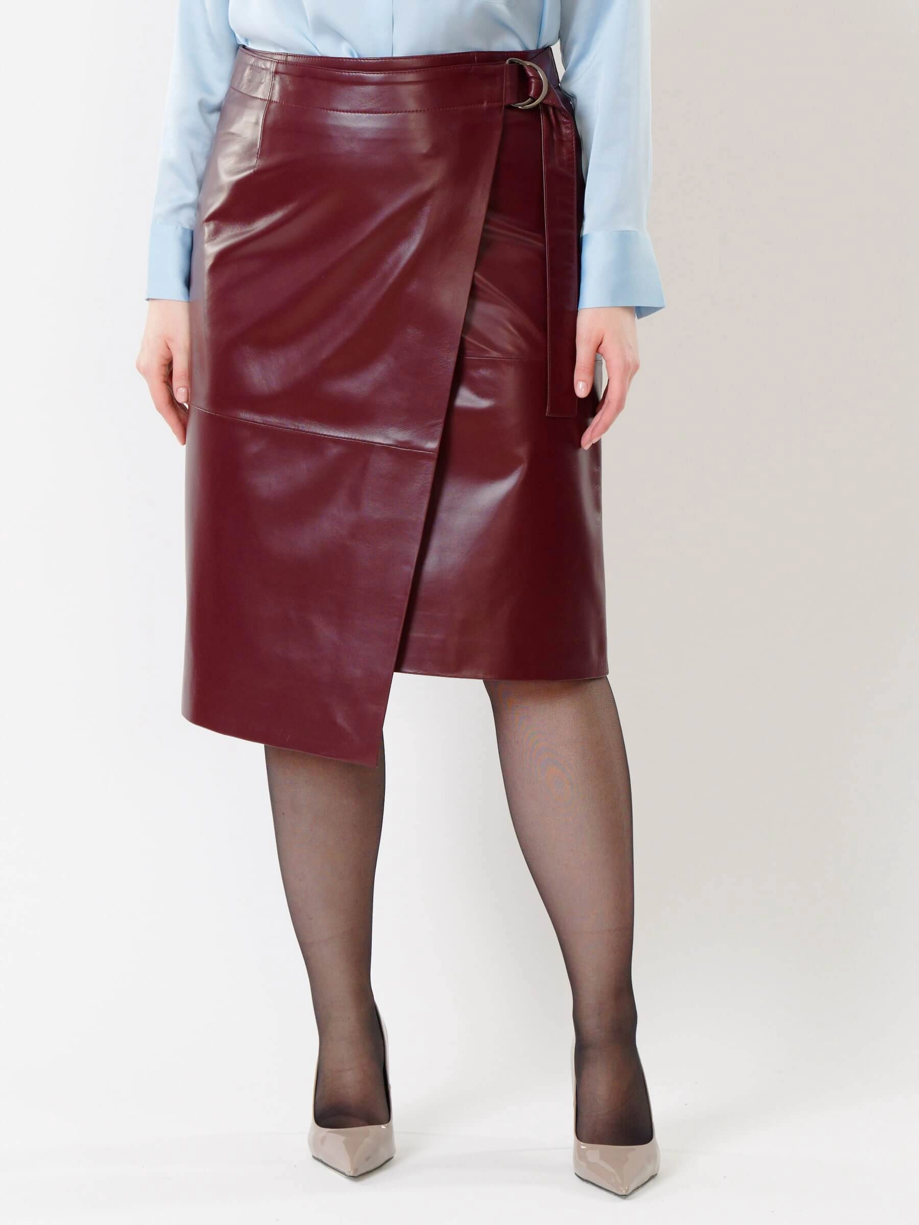 Товар кожаная юбка миди с запахом 07, бордовая, размер 42, артикул 85422 выполнен из натуральной кожи с застежкой молния. Рассчитан на сезон: демисезон. Длина изделия 65 см, силуэт прямой.