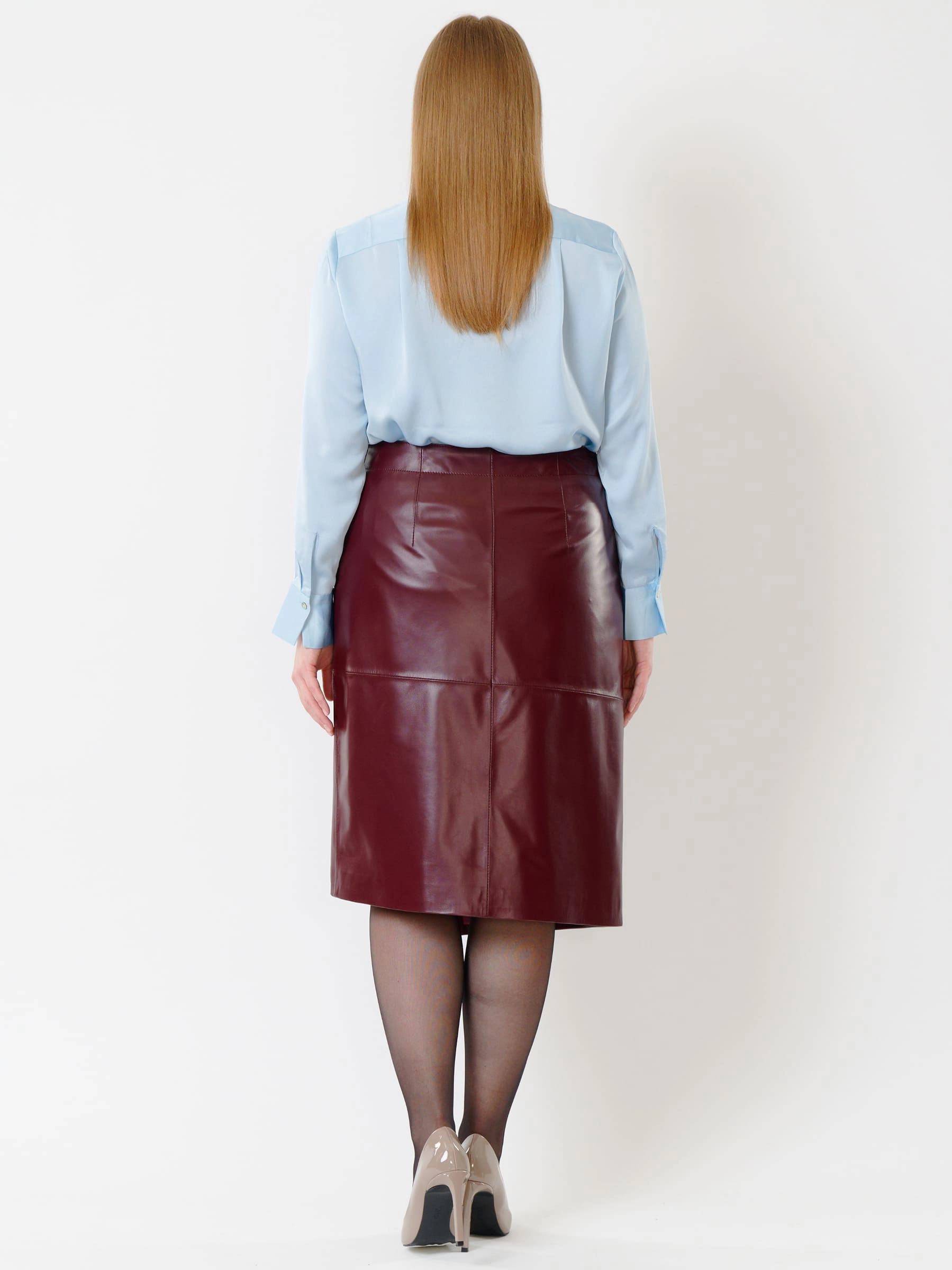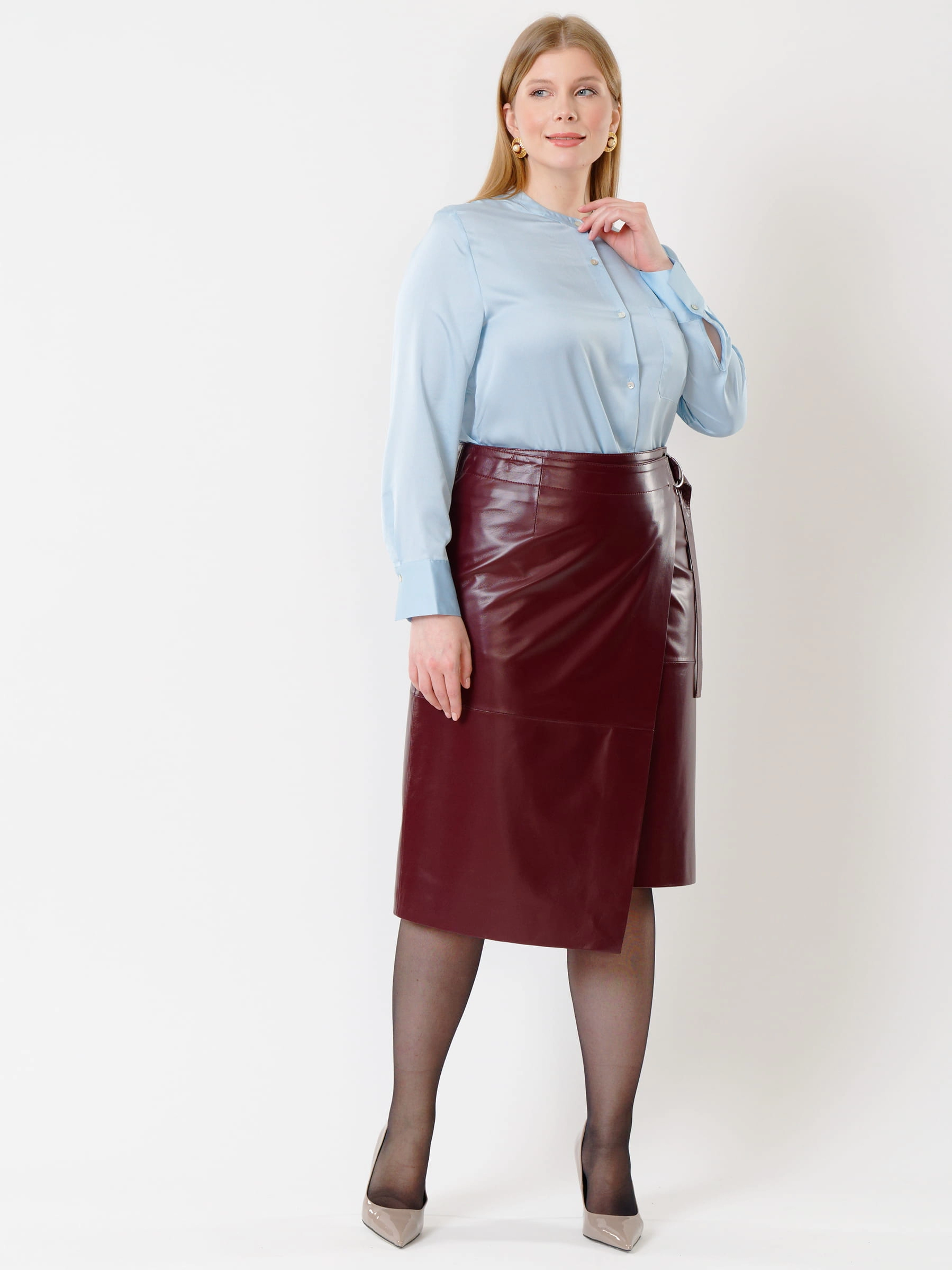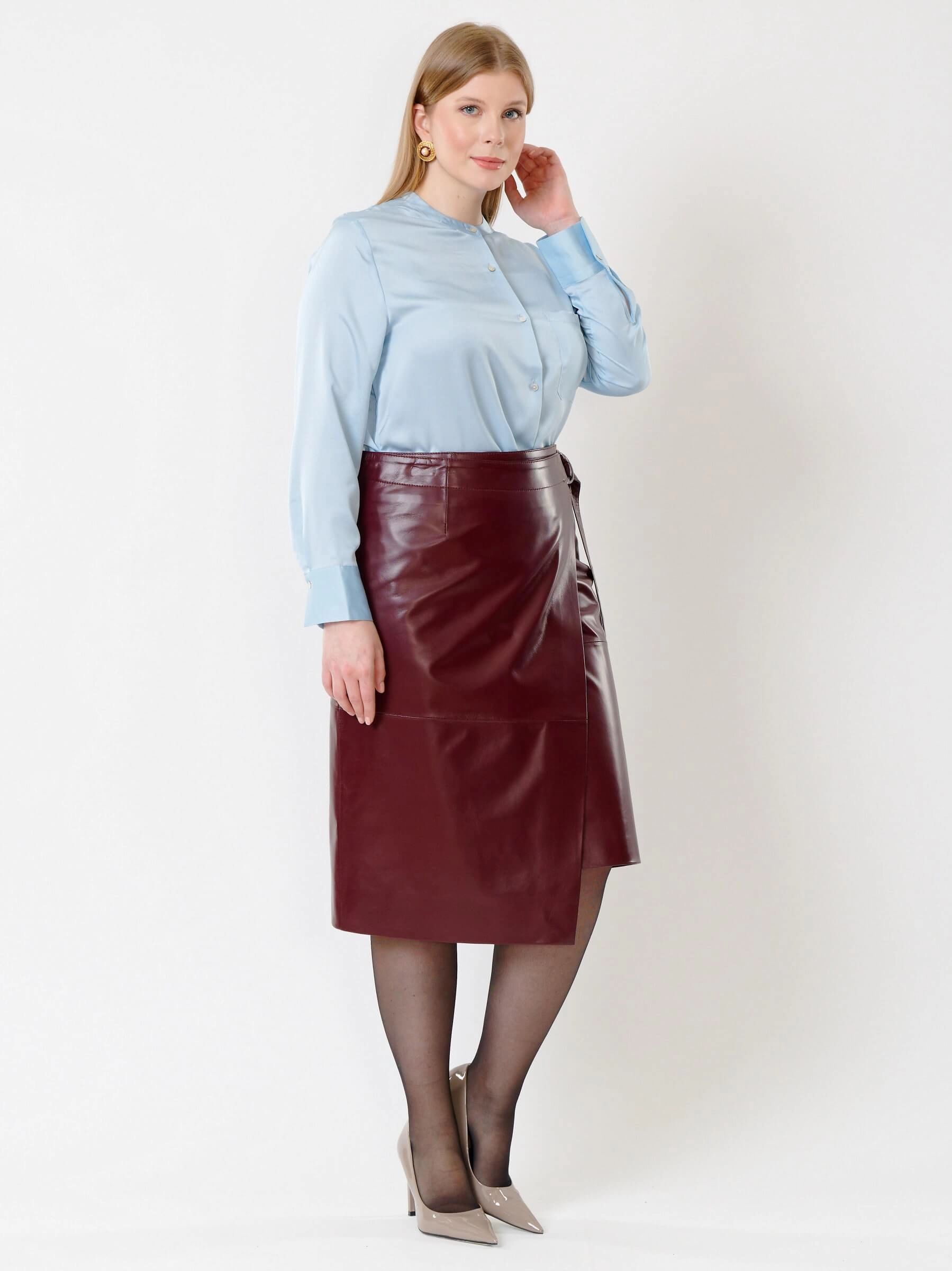 Товар кожаная юбка миди с запахом 07, бордовая, размер 42, артикул 85422 выполнен из натуральной кожи с застежкой молния. Рассчитан на сезон: демисезон. Длина изделия 65 см, силуэт прямой.