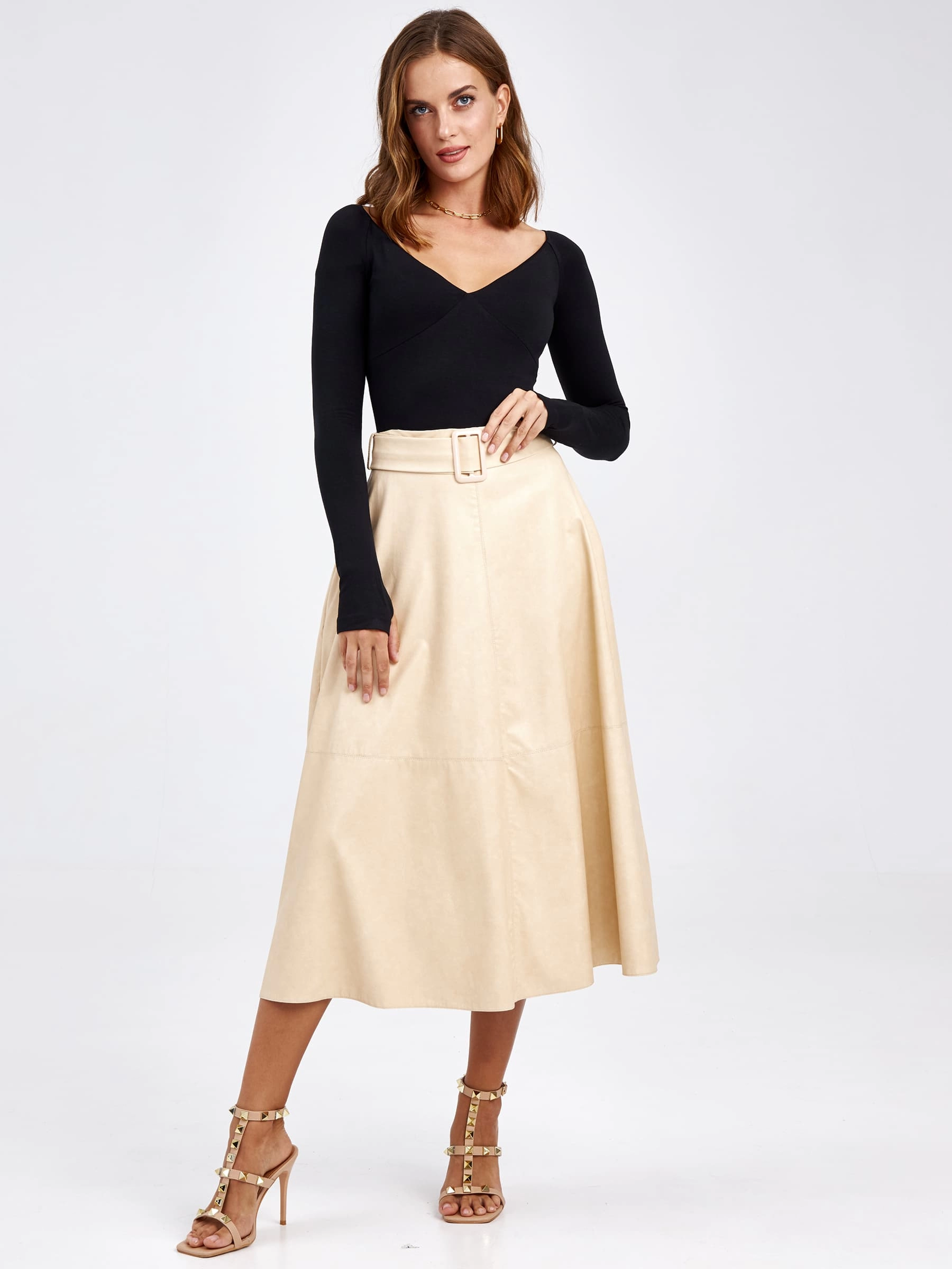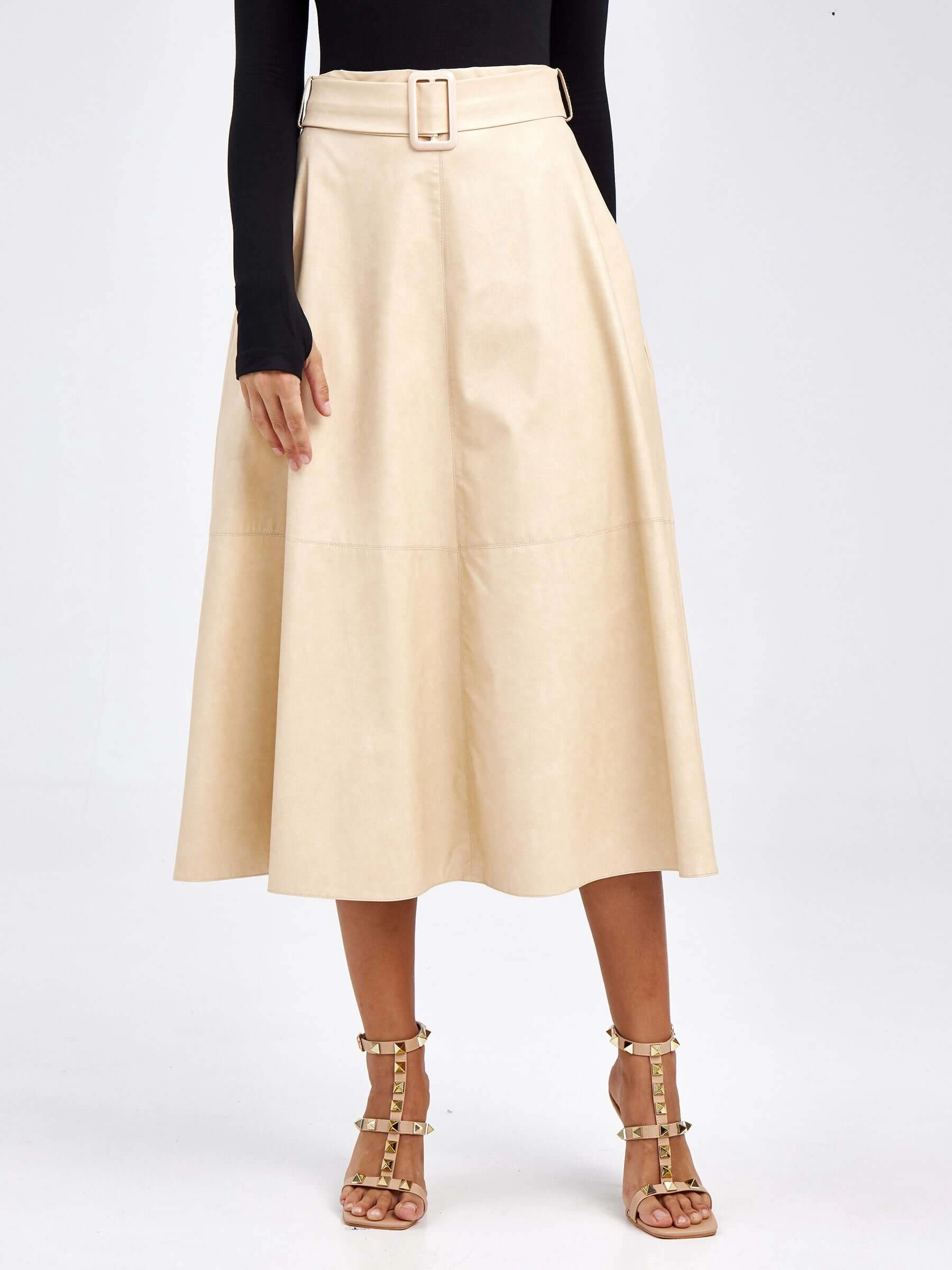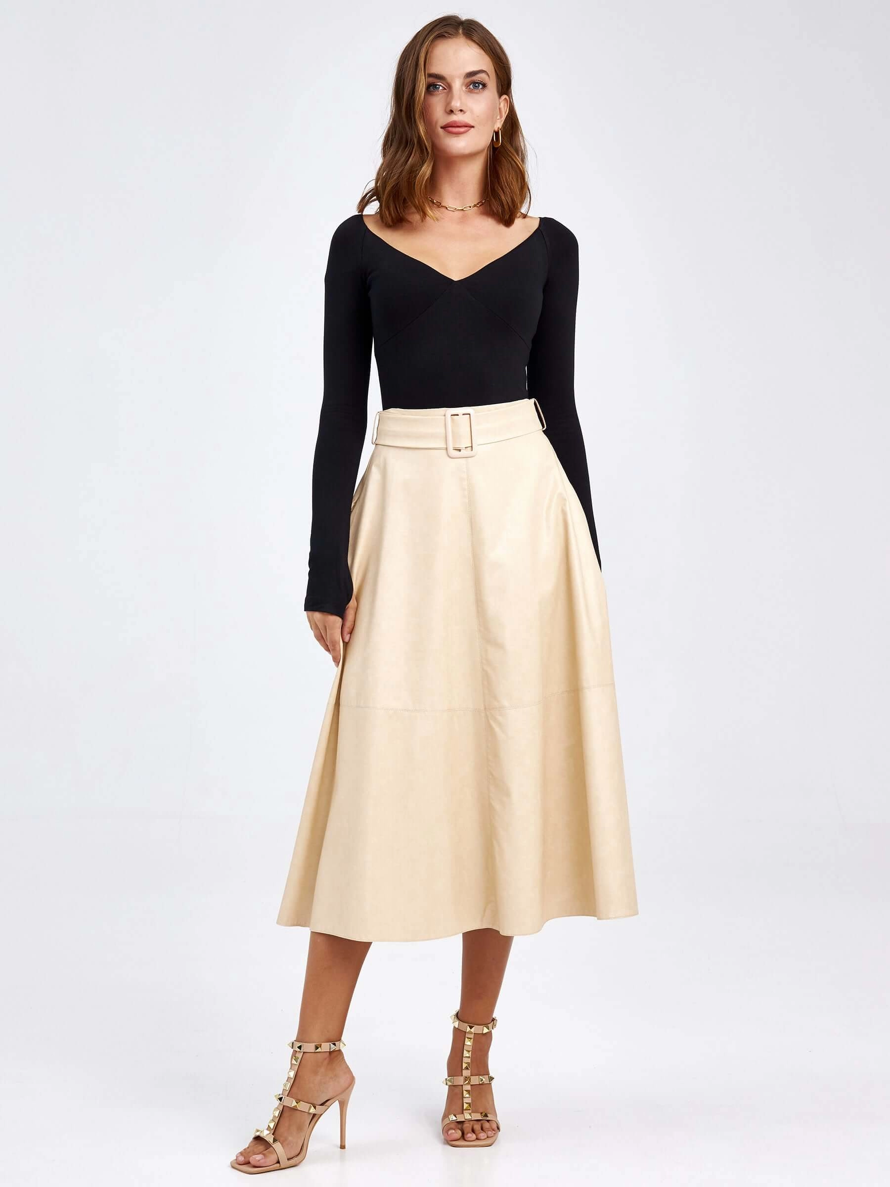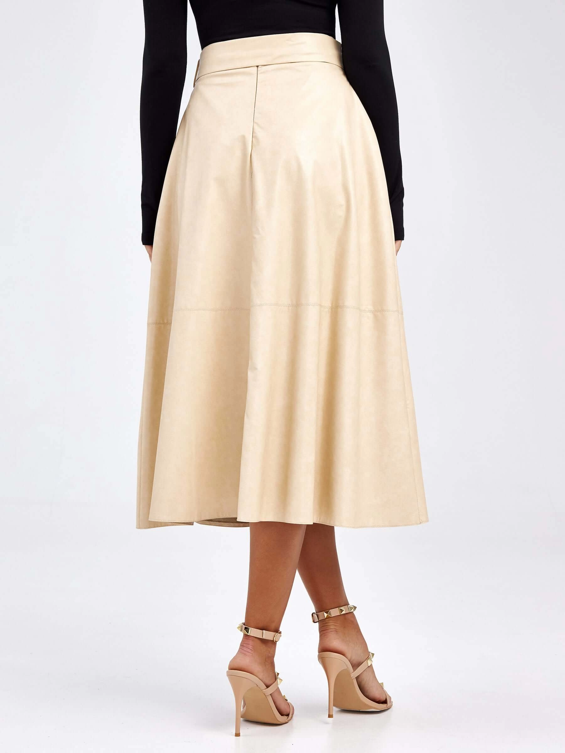 Эта классическая расклешённая юбка миди из экокожи длиной 75-90 см создаёт элегантный женственный силуэт. Благодаря лаконичному дизайну без отделки и подкладки вся фокусная точка сосредоточена на идеальном расклешённом крое и благородной фактуре материала, который обеспечивает красивые плавные линии. Удобная застёжка-молния гарантирует аккуратную посадку, а универсальный стиль делает эту модель отличным выбором для демисезонного гардероба, позволяя сочетать её как с водолазками и балетками для офиса, так и с шёлковыми блузами и каблуками для особого случая.