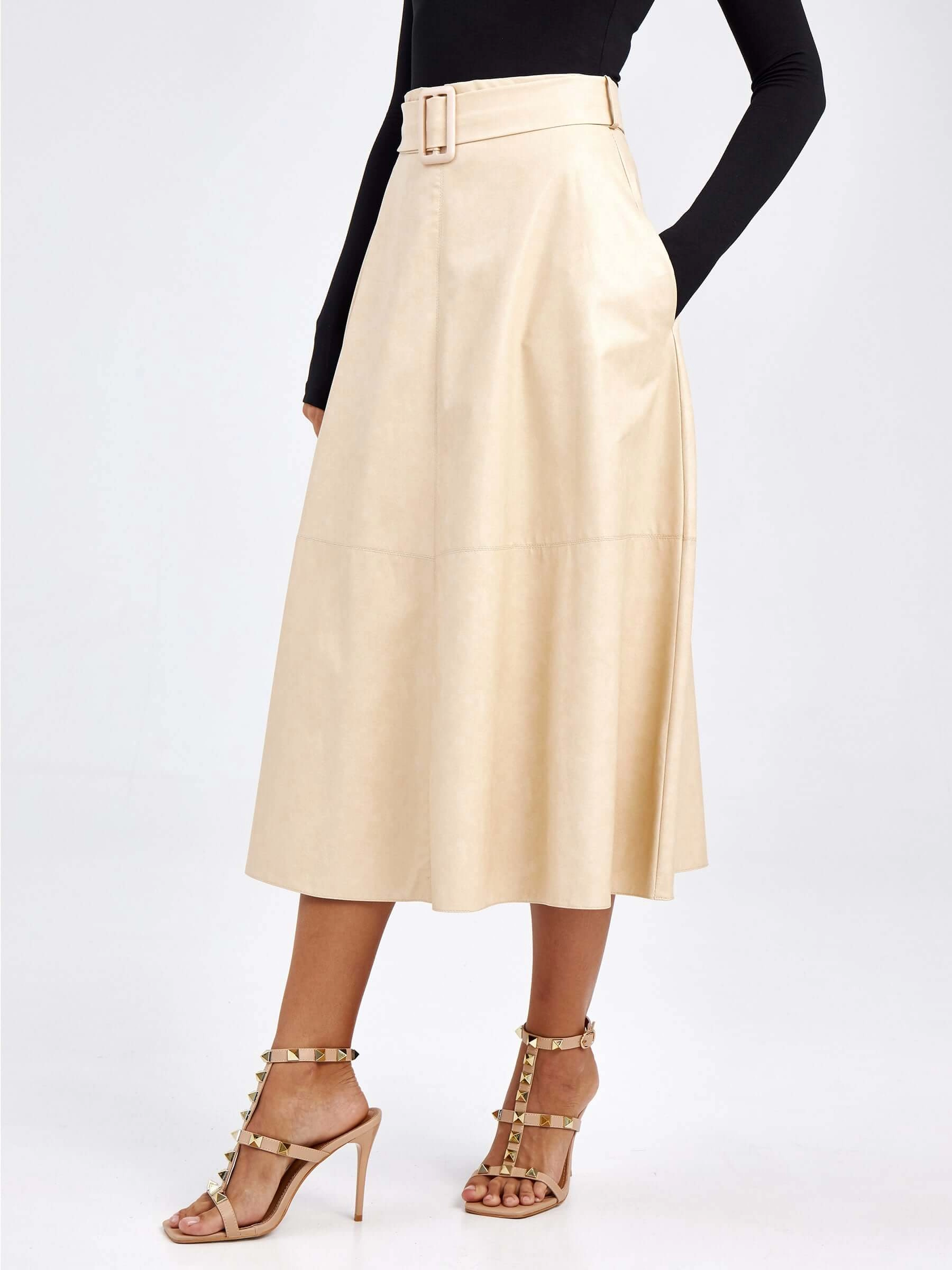 Товар женские кожаная юбка из экокожи 4820752, молочная, размер 46, артикул 85800 выполнен из экокожи с застежкой молния. Рассчитан на сезон: демисезон. Длина изделия 75-90 см, силуэт расклешенный.