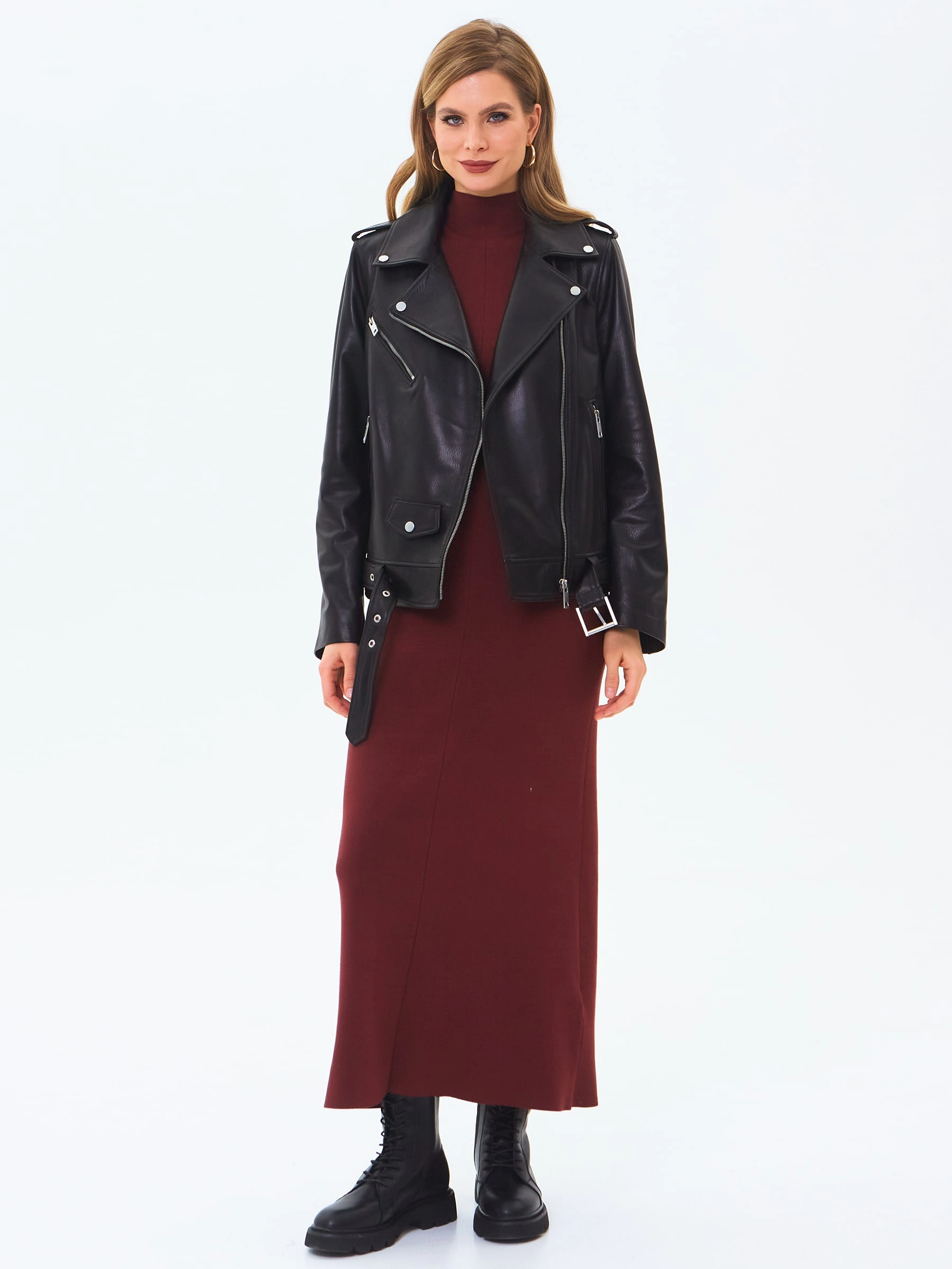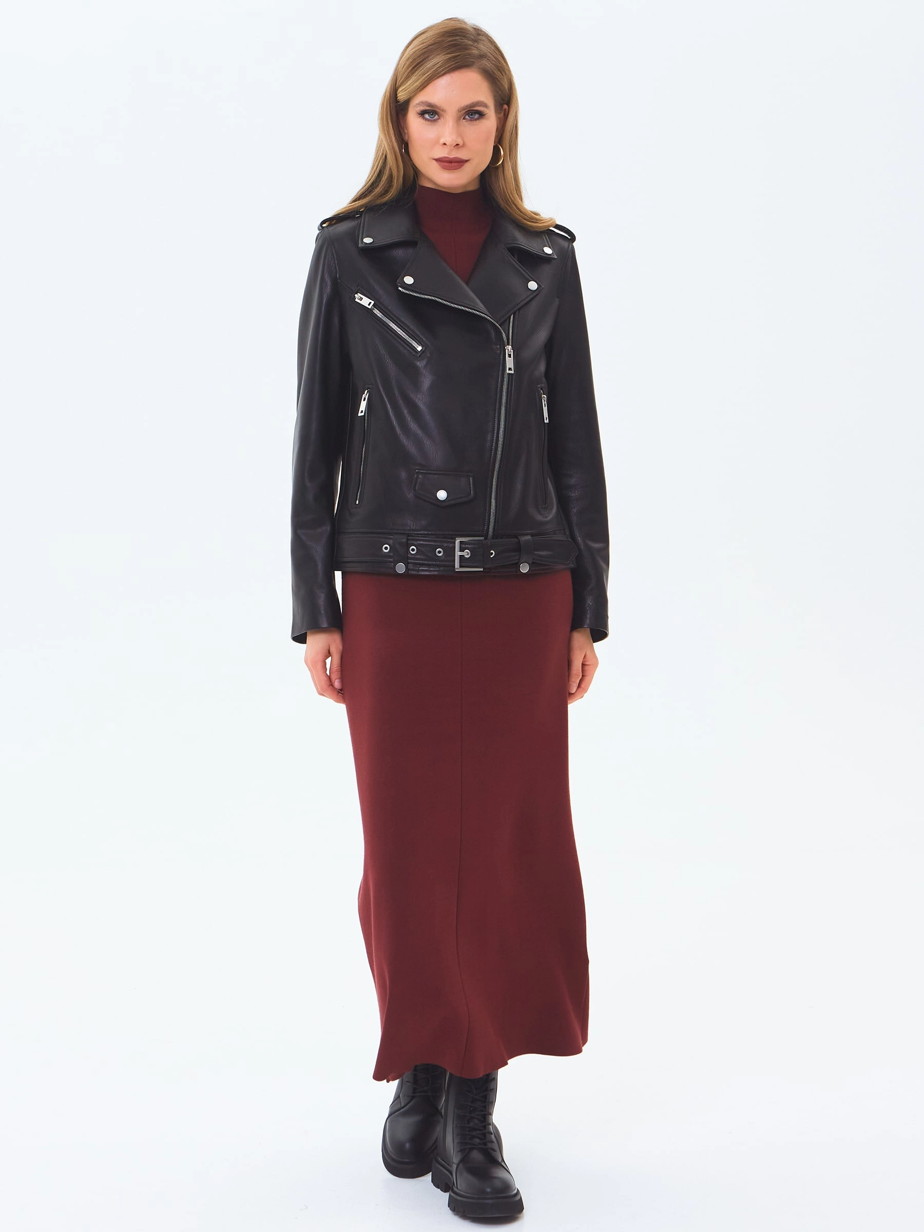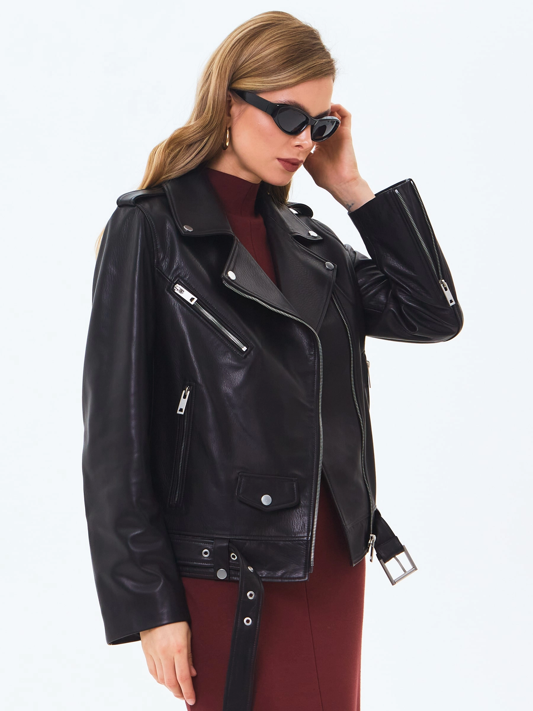Куртку с широкими лацканами выполнили из мягкой натуральной кожи черного цвета. Сама модель, манжеты и три кармана застегиваются крупными молниями. Косуху прямого силуэта дополнили съемным ремнем с пряжкой.