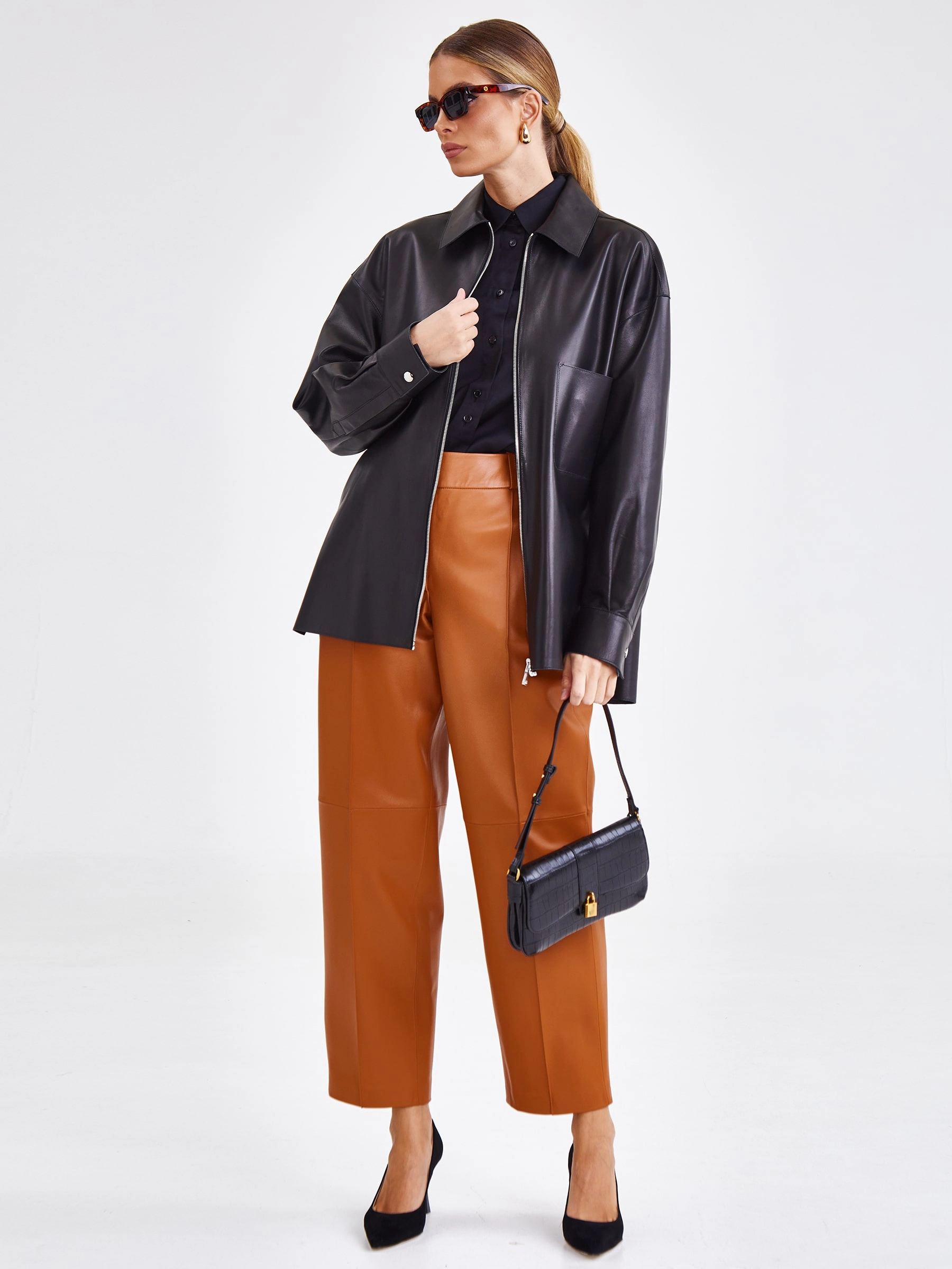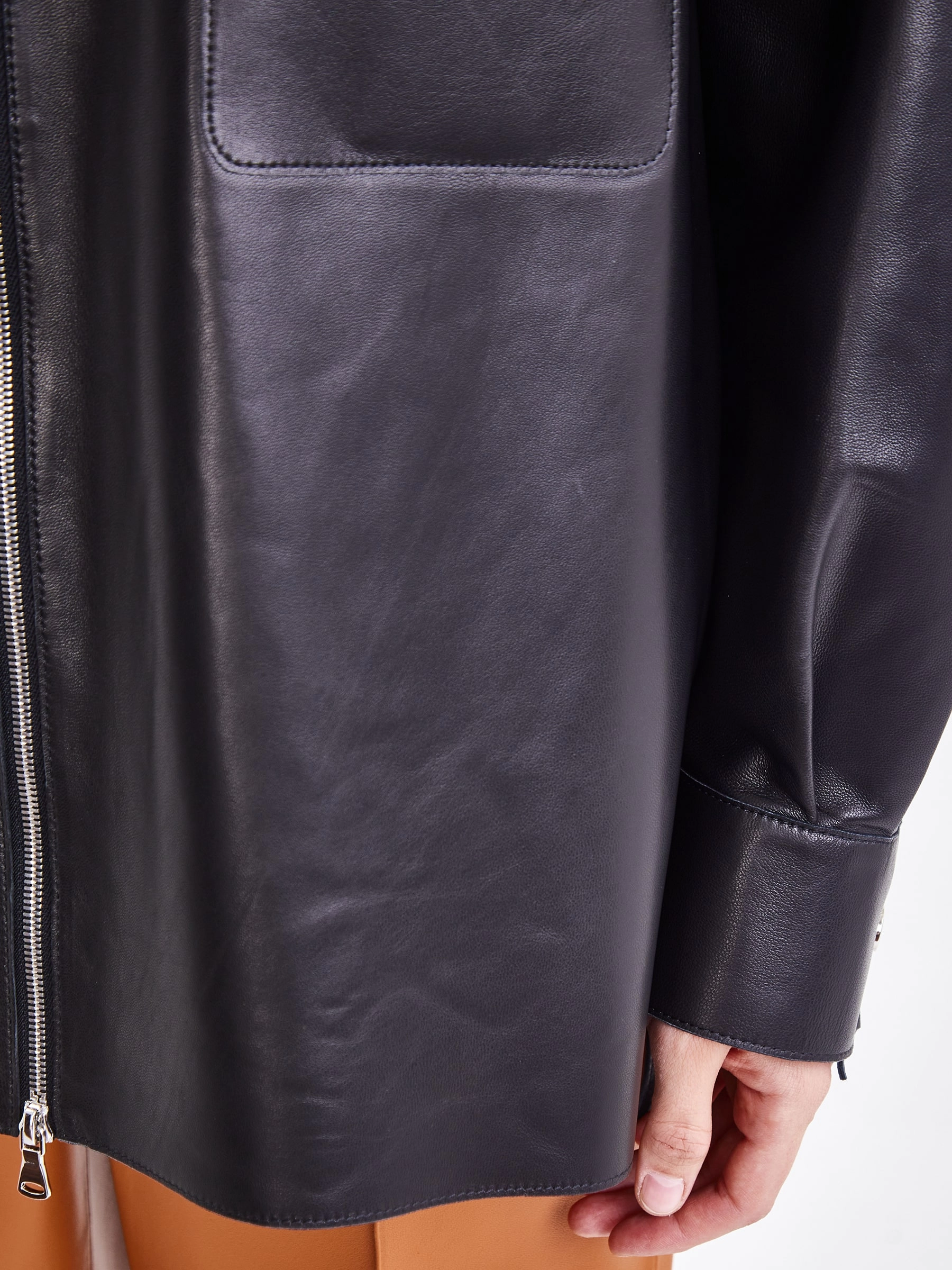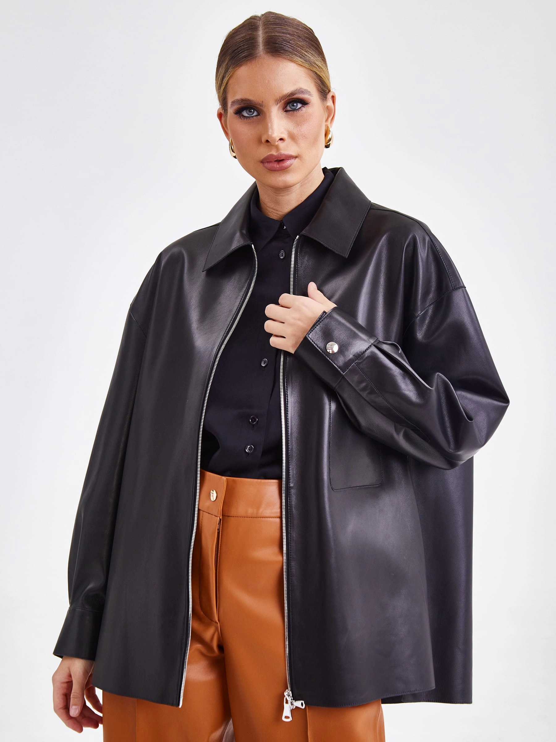 Куртка прямого кроя, с отложным воротником и длинными рукавами. Это альтернатива легкой куртки в прохладные дни. Модель выполнили из тонкой натуральной кожи премиум класса, дополнив боковыми разрезами на молниях.
