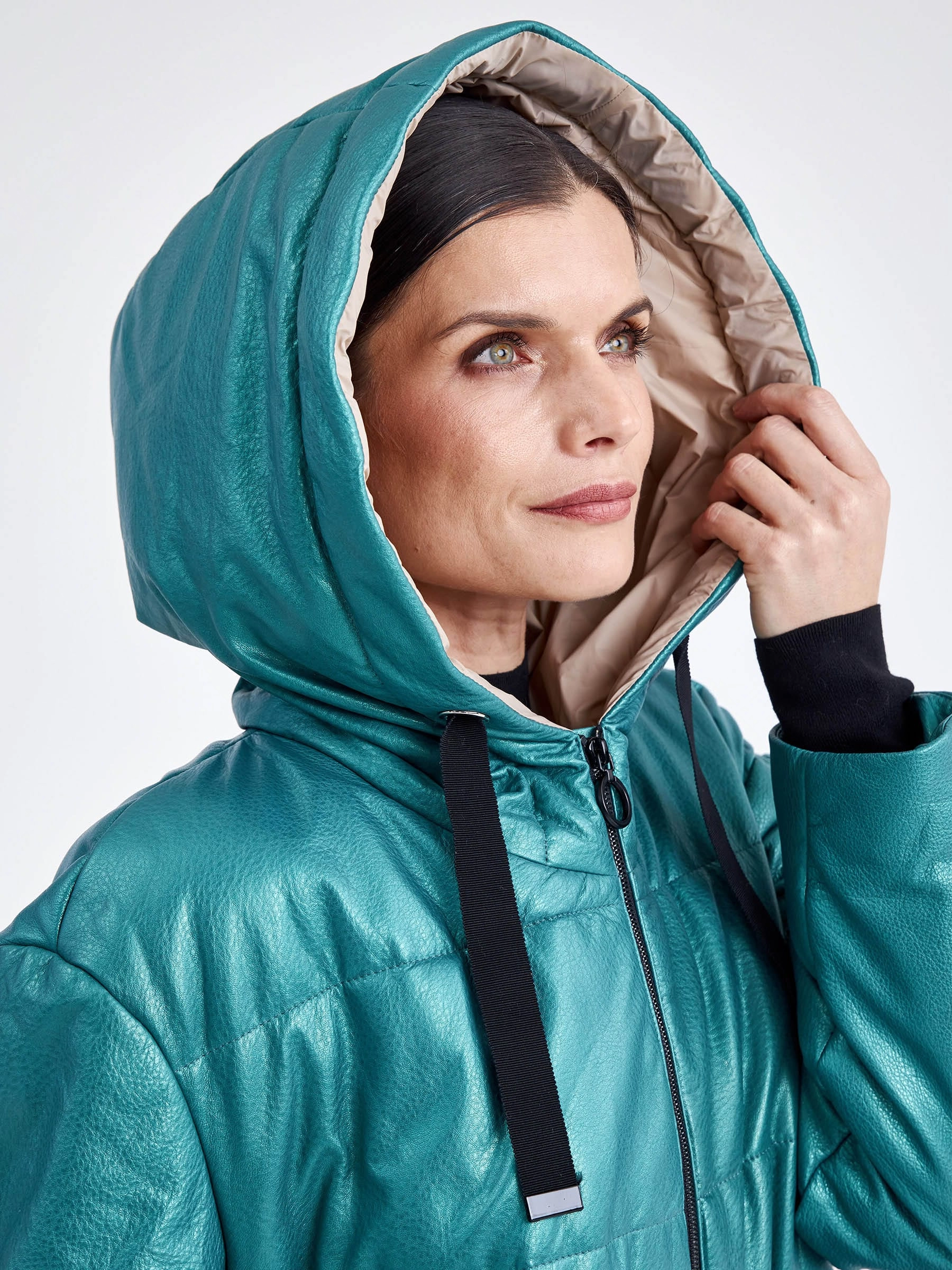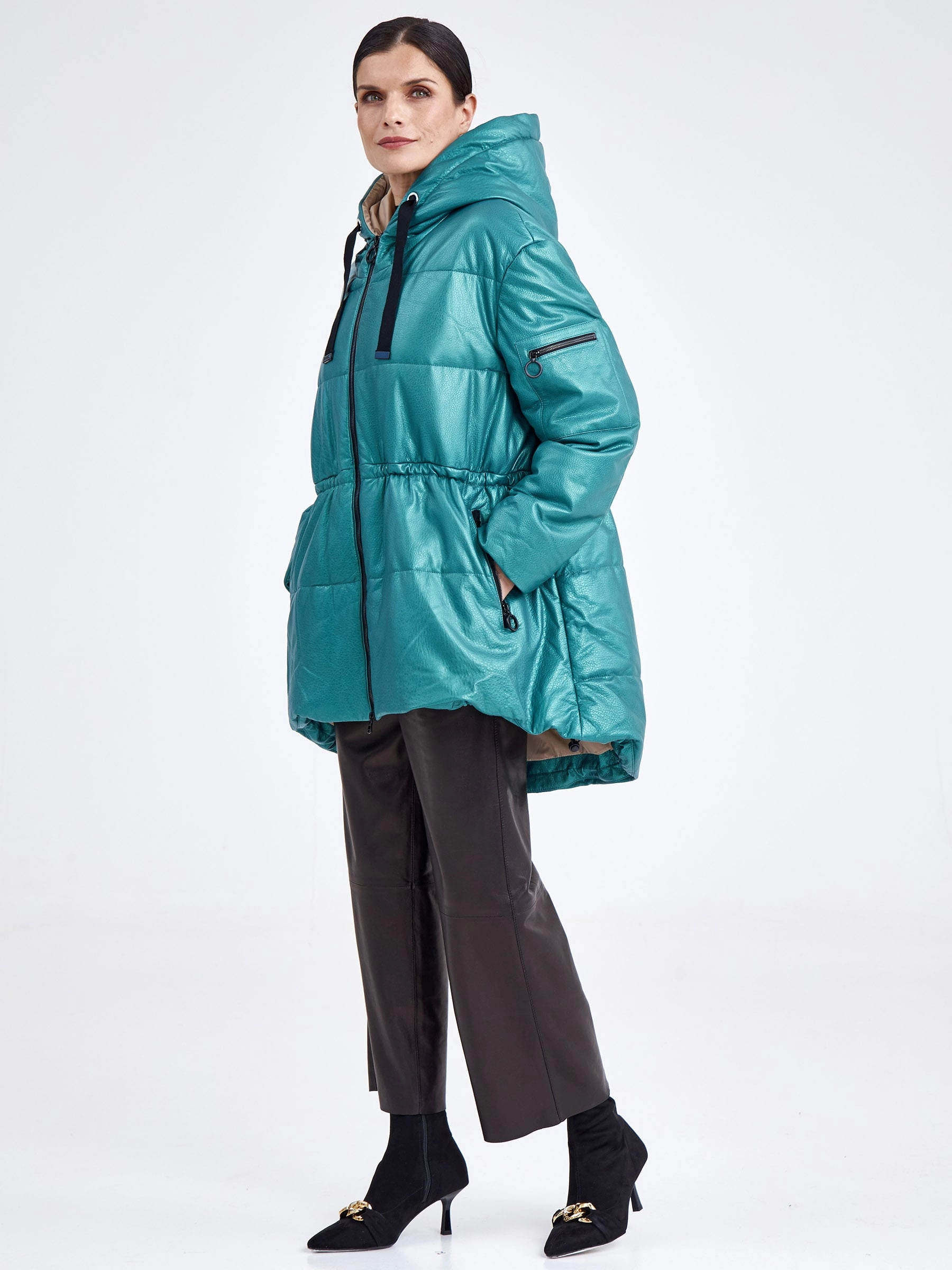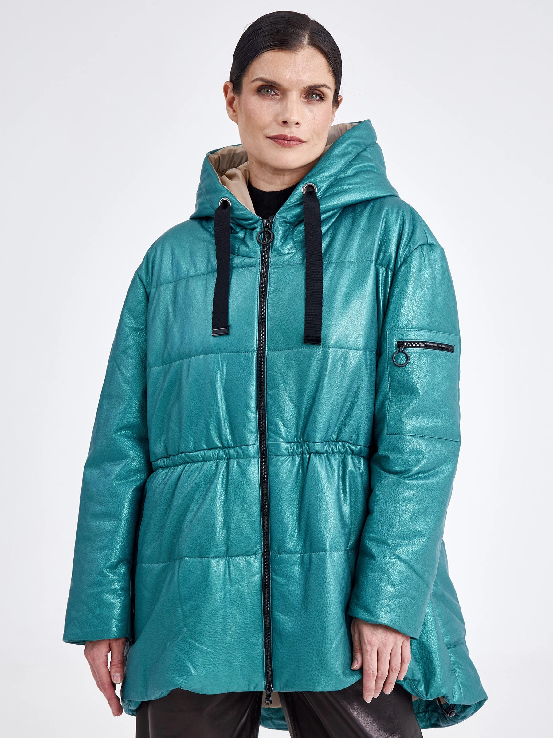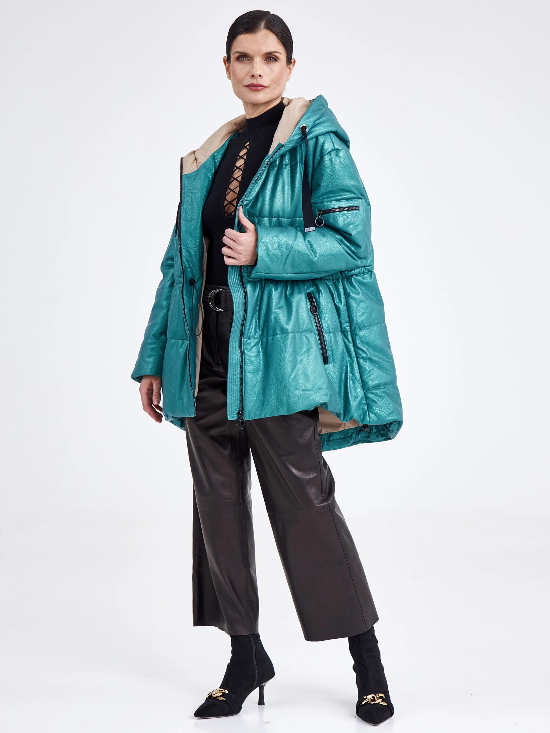 Элегантная утеплённая куртка-пуховик свободного кроя из натуральной кожи премиального класса в благородном зелено-перламутровом оттенке станет ключевым элементом вашего осенне-весеннего гардероба. Совет стилиста: эту модель легко интегрировать в повседневные и расслабленно-умные (smart casual) образы. Сочетайте её с базой нейтральных тонов — например, свитером или водолазкой песочного, серого или кремового цвета, прямыми джинсами или утеплёнными брюками-чинос. Объёмный крой куртки прекрасно сбалансируют облегающие снизу брюки или узкие джинсы с высокими ботинками или кедами. Для создания более элегантного лука добавьте тонкое трикотажное платье-миди и замшевые ботильоны на каблуке. Длина 75–90 см позволяет играть с пропорциями, а внутренний регулируемый пояс помогает подчеркнуть талию. Немецкий синтепон Freudenberg обеспечивает тепло и комфорт, а универсальный цвет делает куртку идеальным компаньоном для большинства вещей в вашем шкафу.