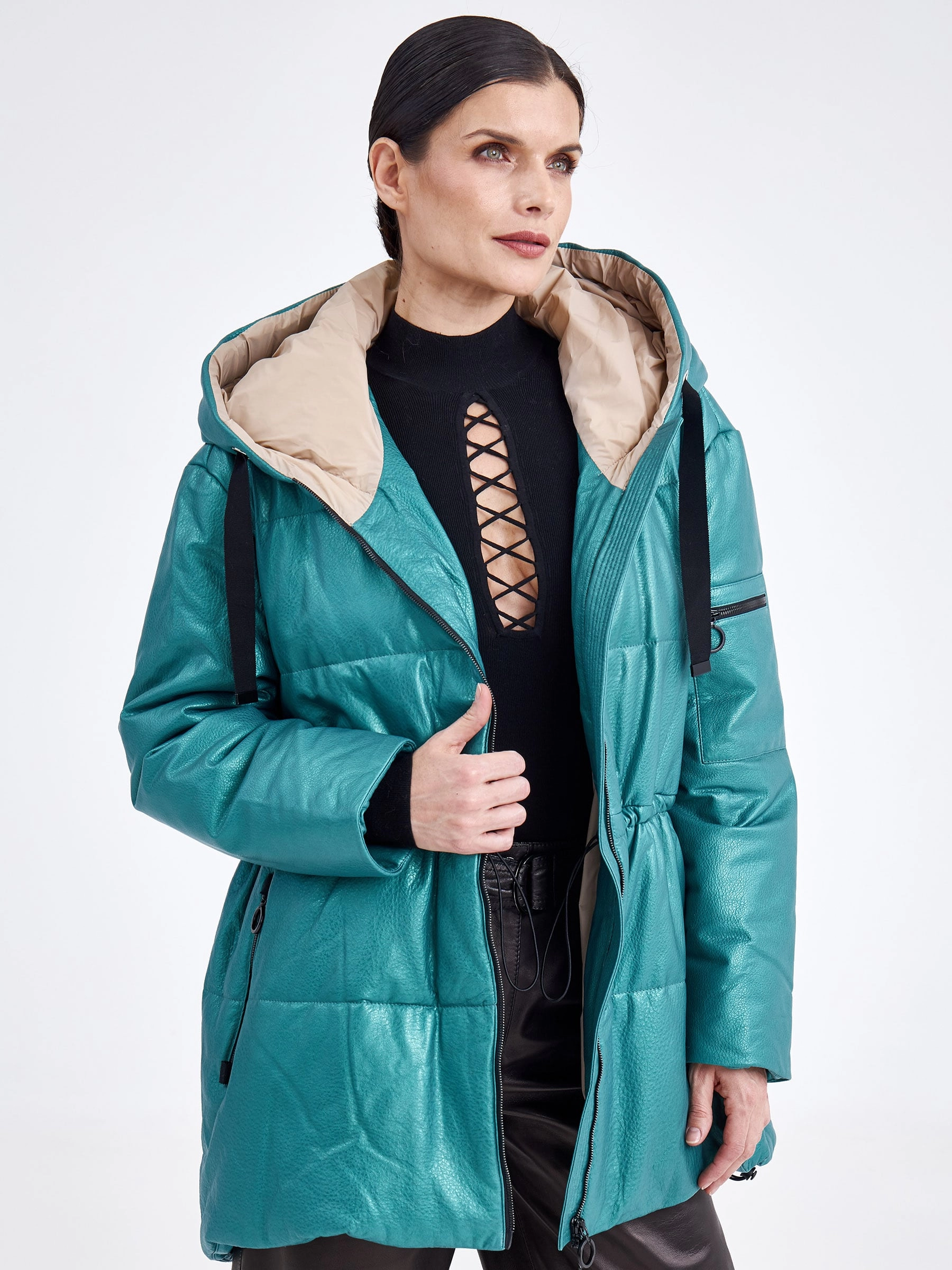 Кожаная женская куртка оверсайз с капюшоном премиум класса 3021, зеленая, размер 48, артикул 25470
