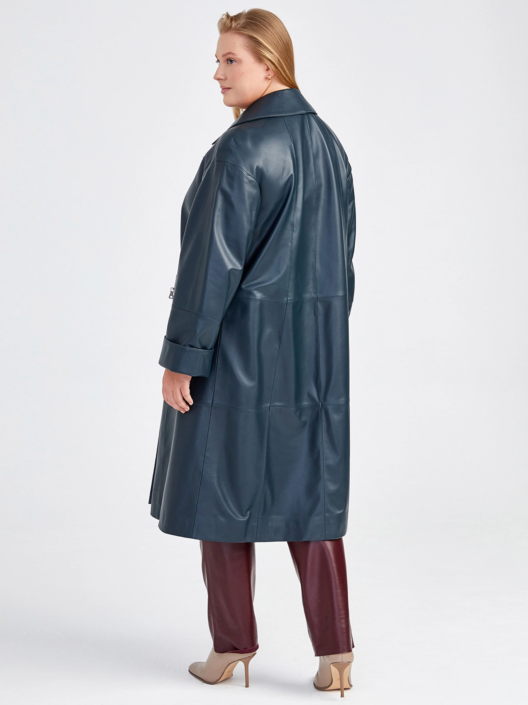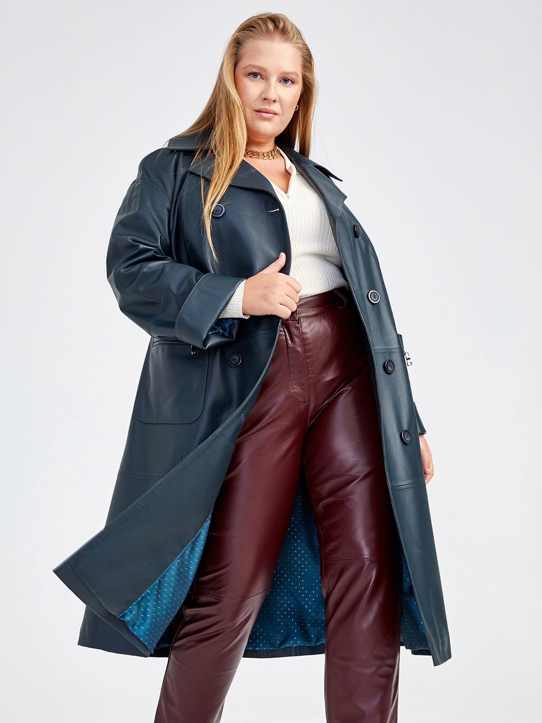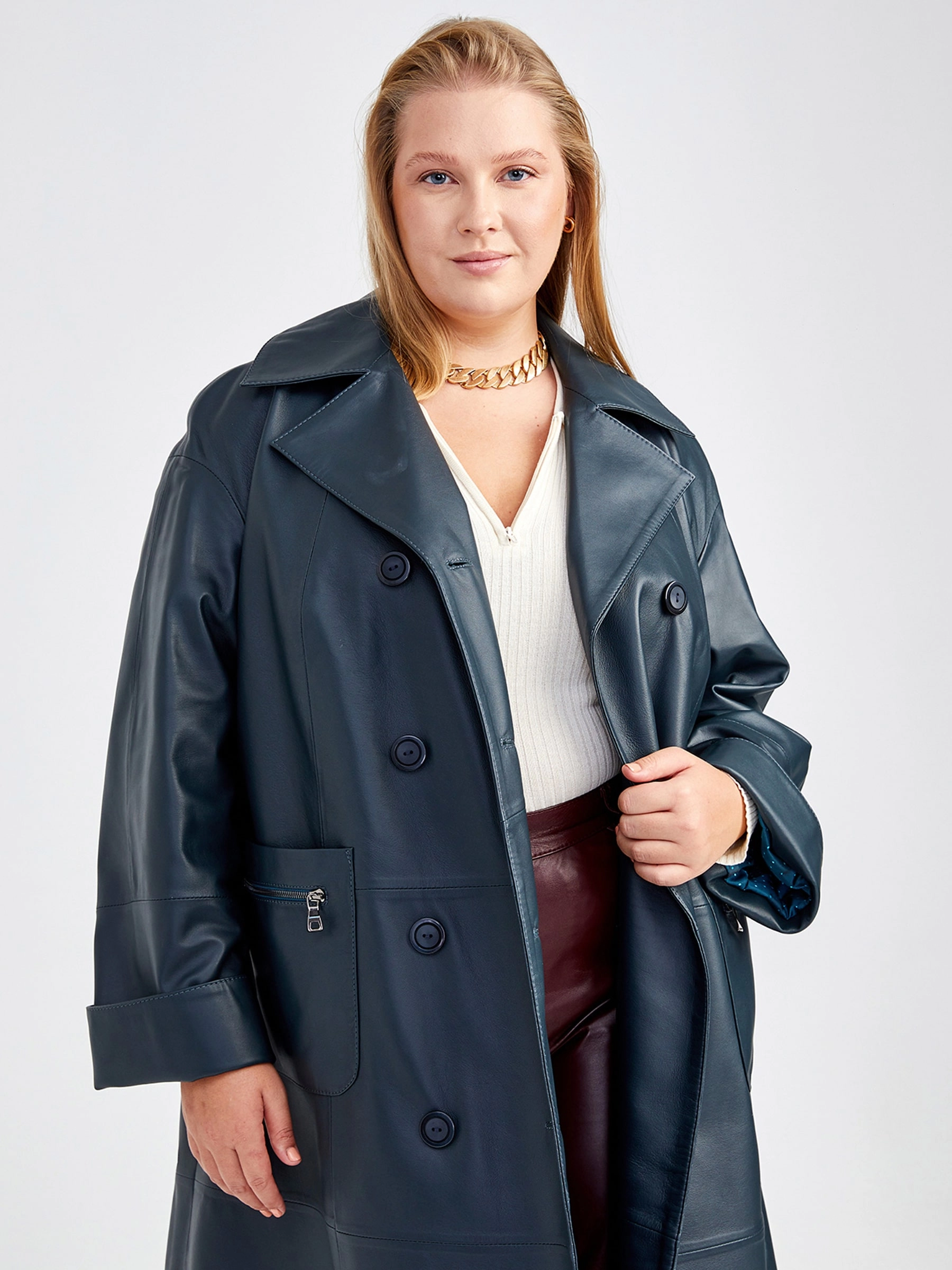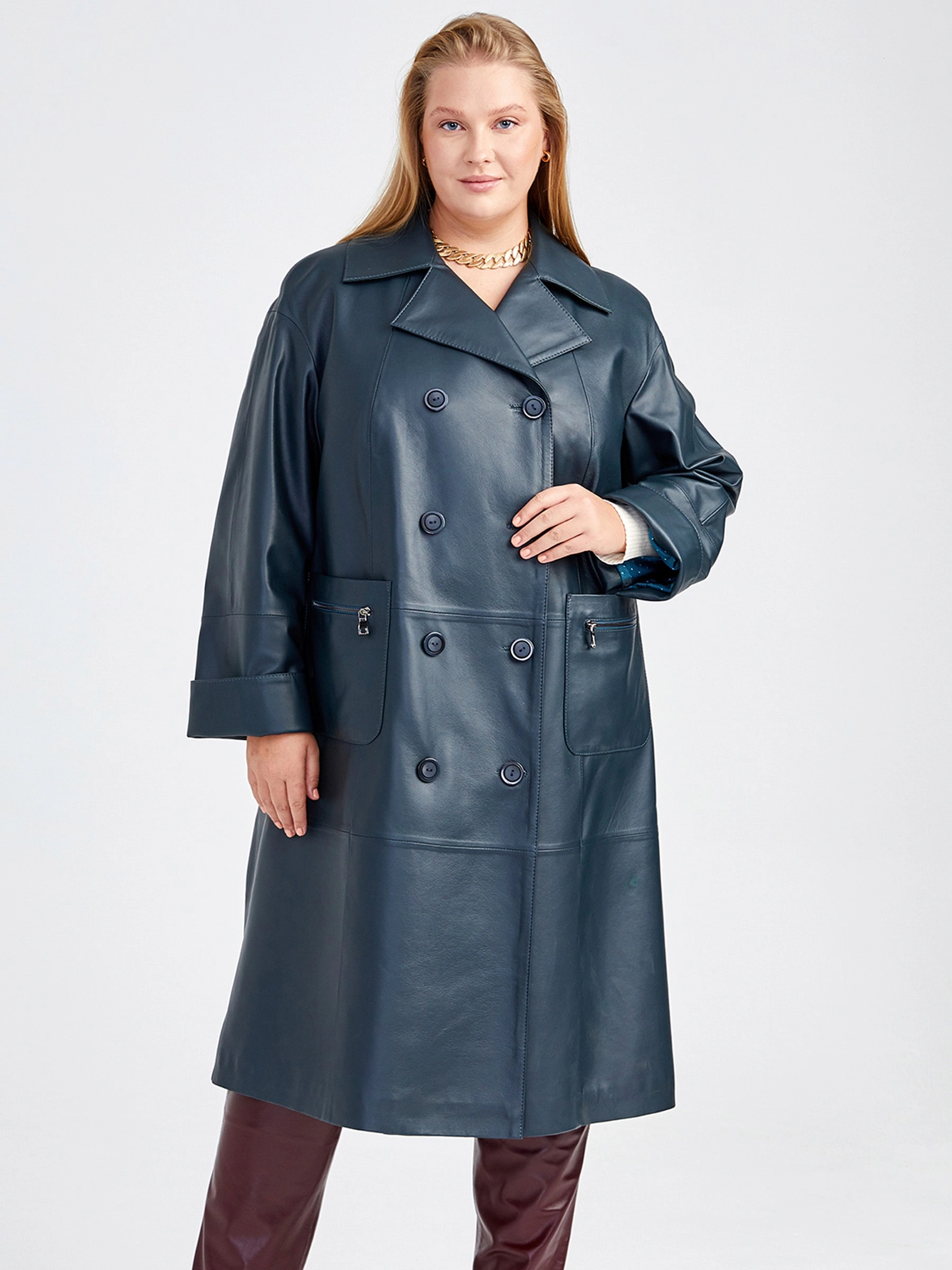 Длинное женское пальто премиум-класса из легендарной кожи Primo Vello: свободный силуэт и элегантный двубортный крой на пуговицах создают образ непринужденной роскоши. Классический английский воротник, втачные рукава с регулируемыми отворотами и стильные накладные карманы на молниях подчеркивают безупречный дизайн. Натуральная кожа исключительного качества гарантирует долговечность и мгновенно узнаваемый шик — сочетайте с объемным белым свитером, узкими джинсами и кожаными сапогами-чулками для образа невесомой элегантности.