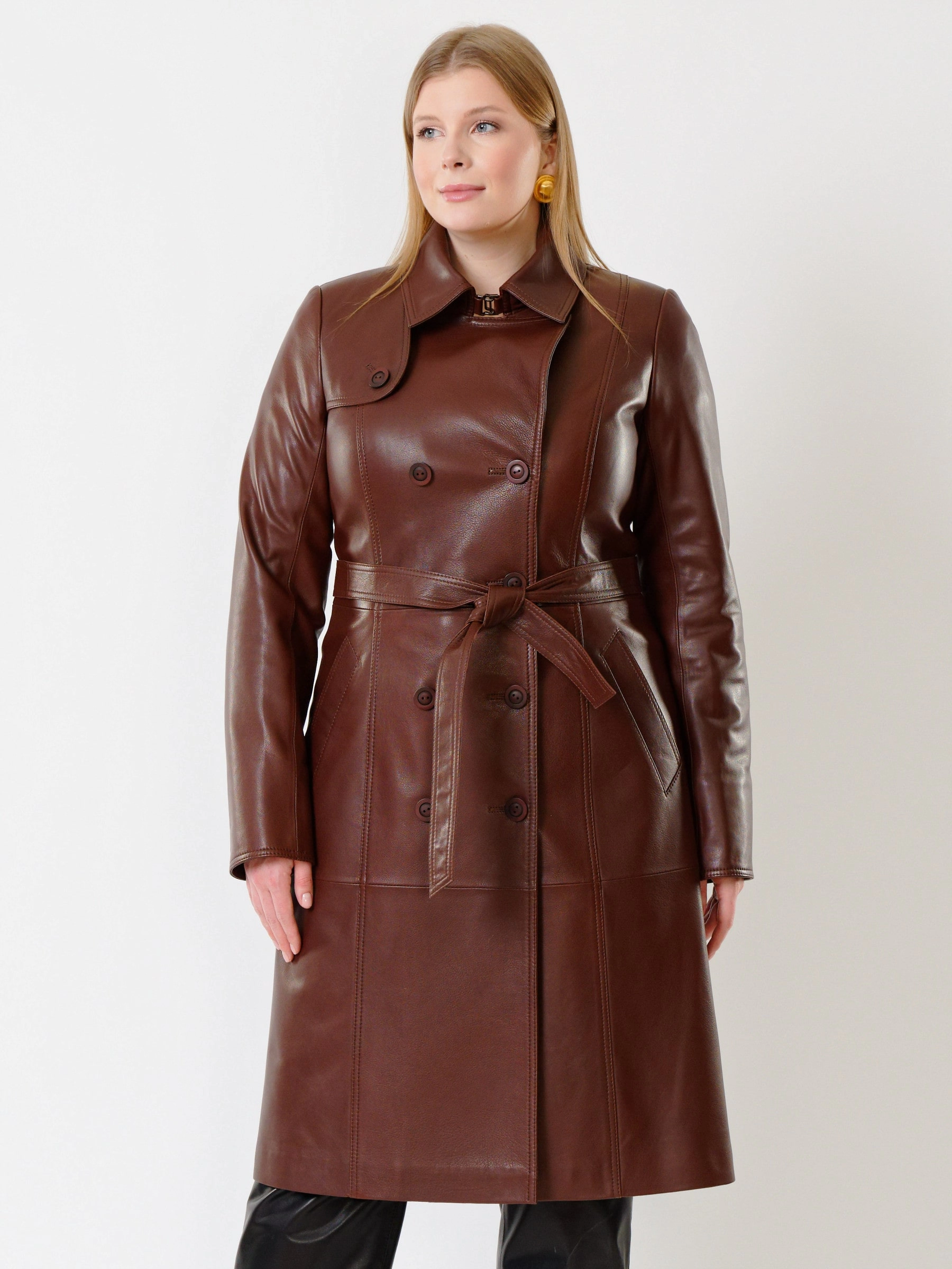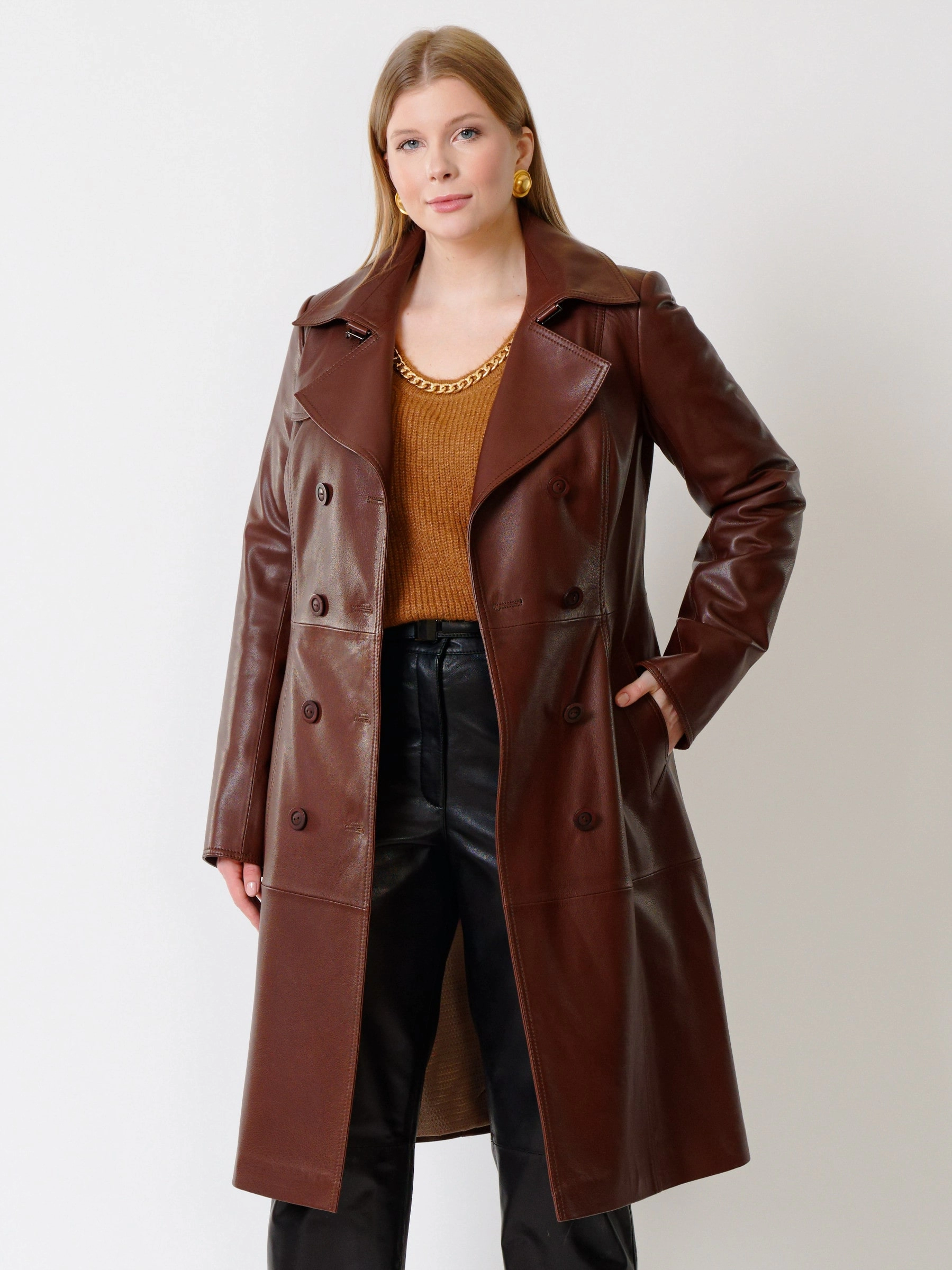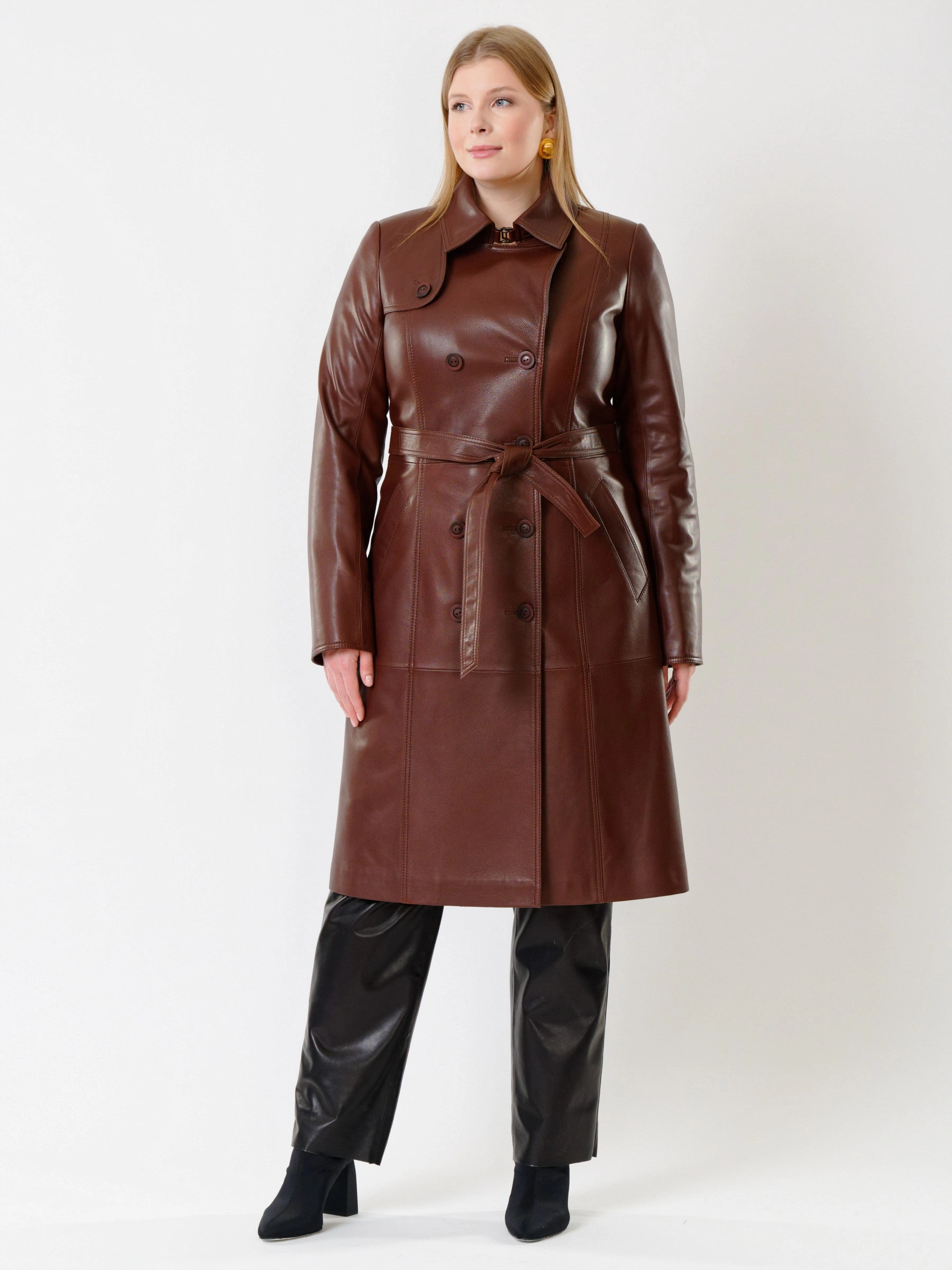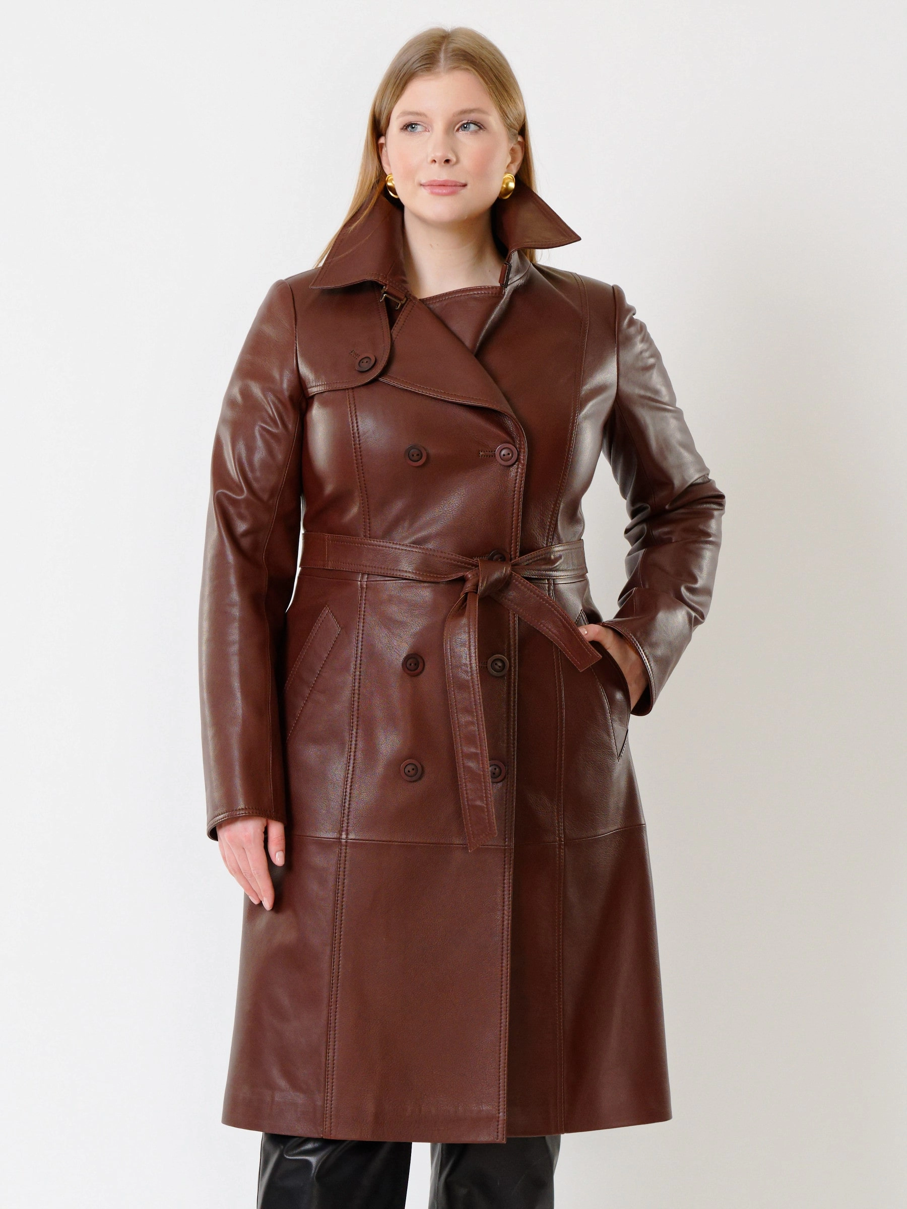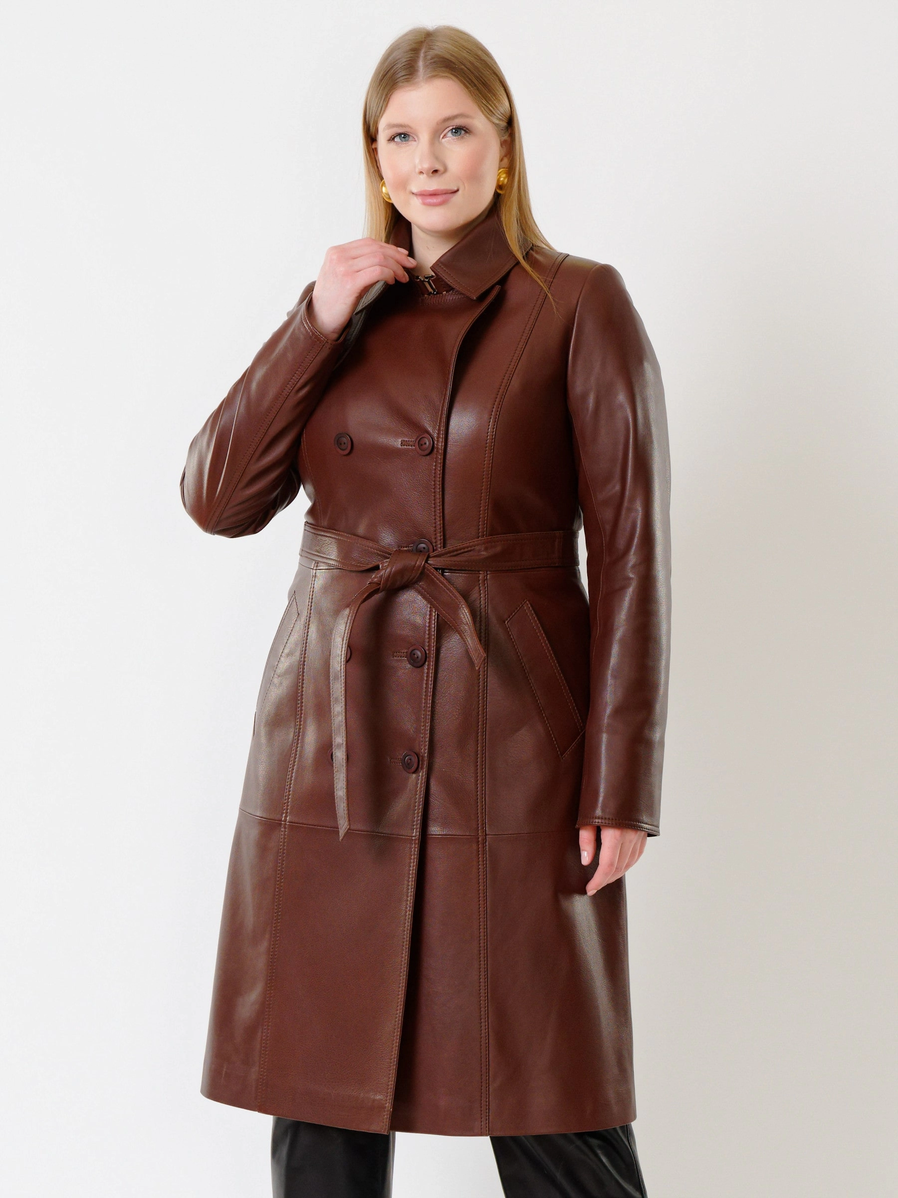 Товар кожаное двубортное женское пальто с поясом премиум класса 3003, ореховое, размер 48, артикул 63490 выполнен из натуральной кожи с застежкой пуговицы. Рассчитан на сезон: демисезон. Длина изделия 108 см, силуэт полуприлегающий.