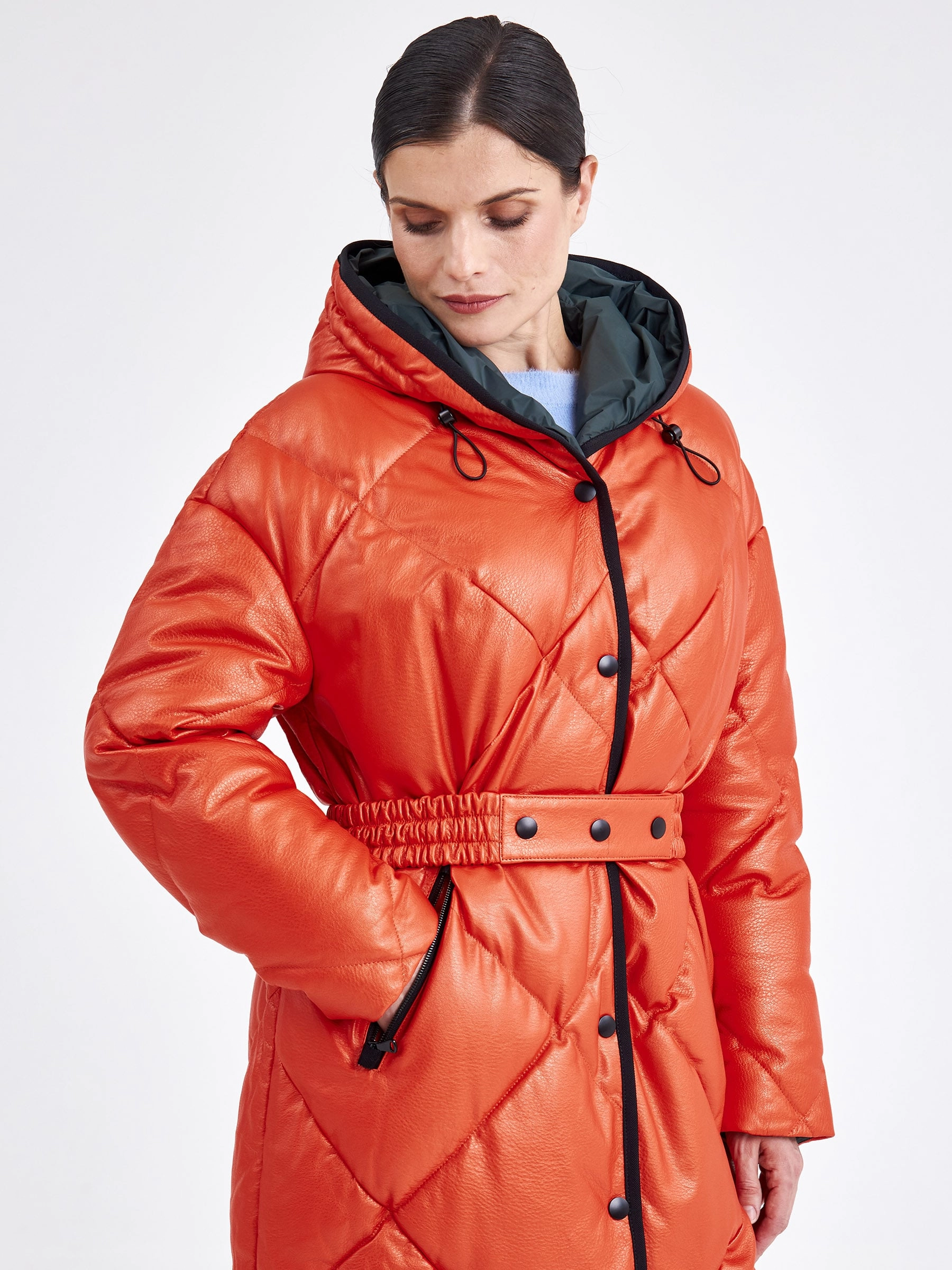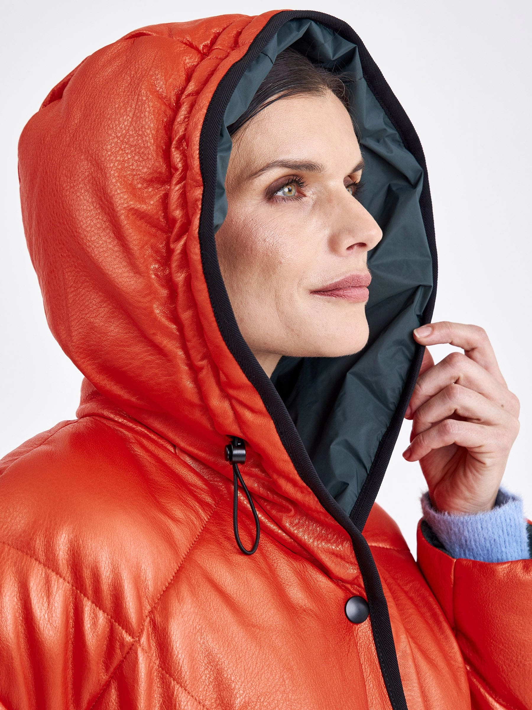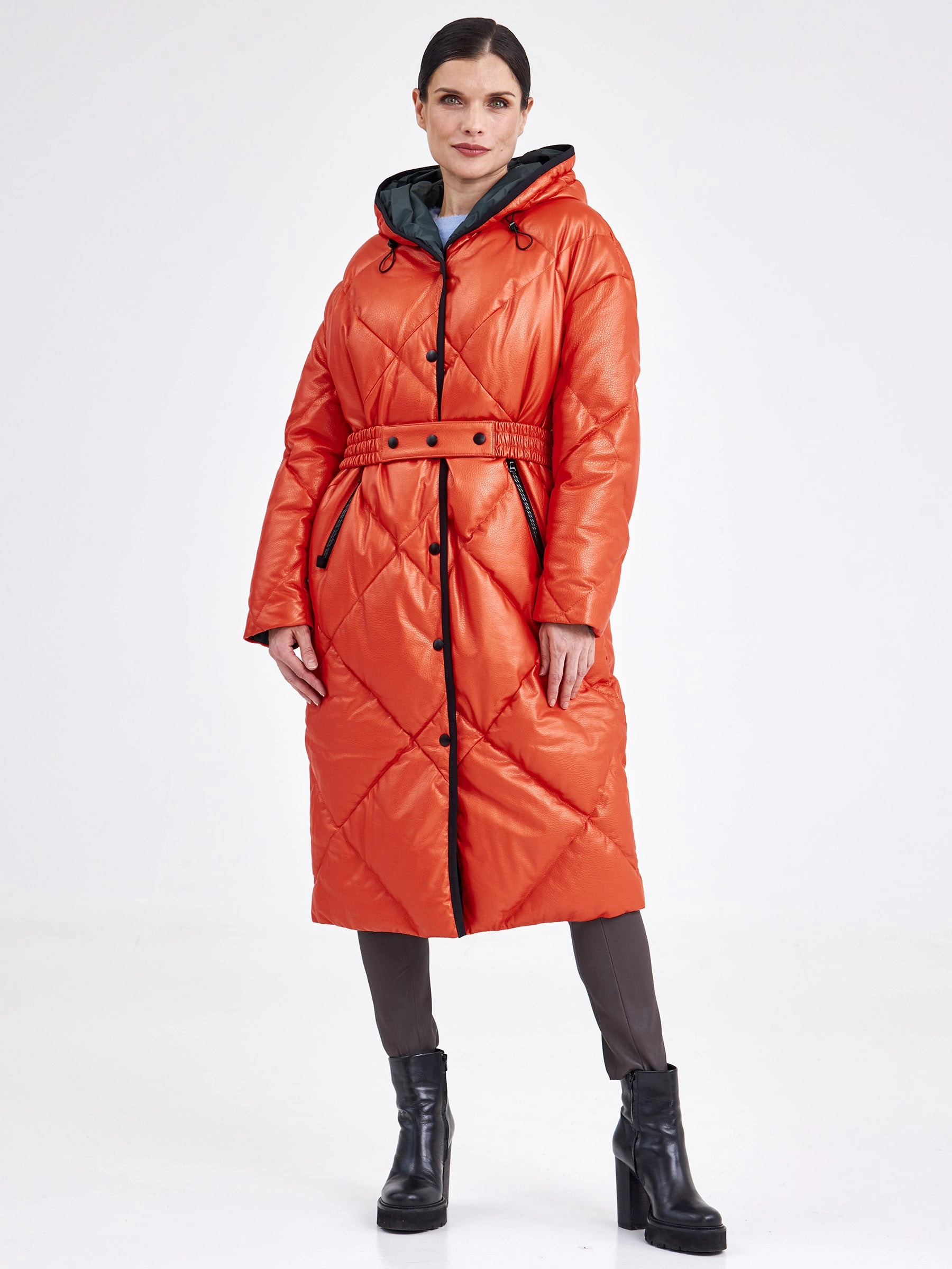 Товар кожаное женское стеганое пальто с капюшоном премиум класса 3026, оранжевое, размер 48, артикул 25410 выполнен из натуральной кожи с застежкой кнопки. Рассчитан на сезон: осень-зима. Длина изделия свыше 90 см, силуэт прямой.