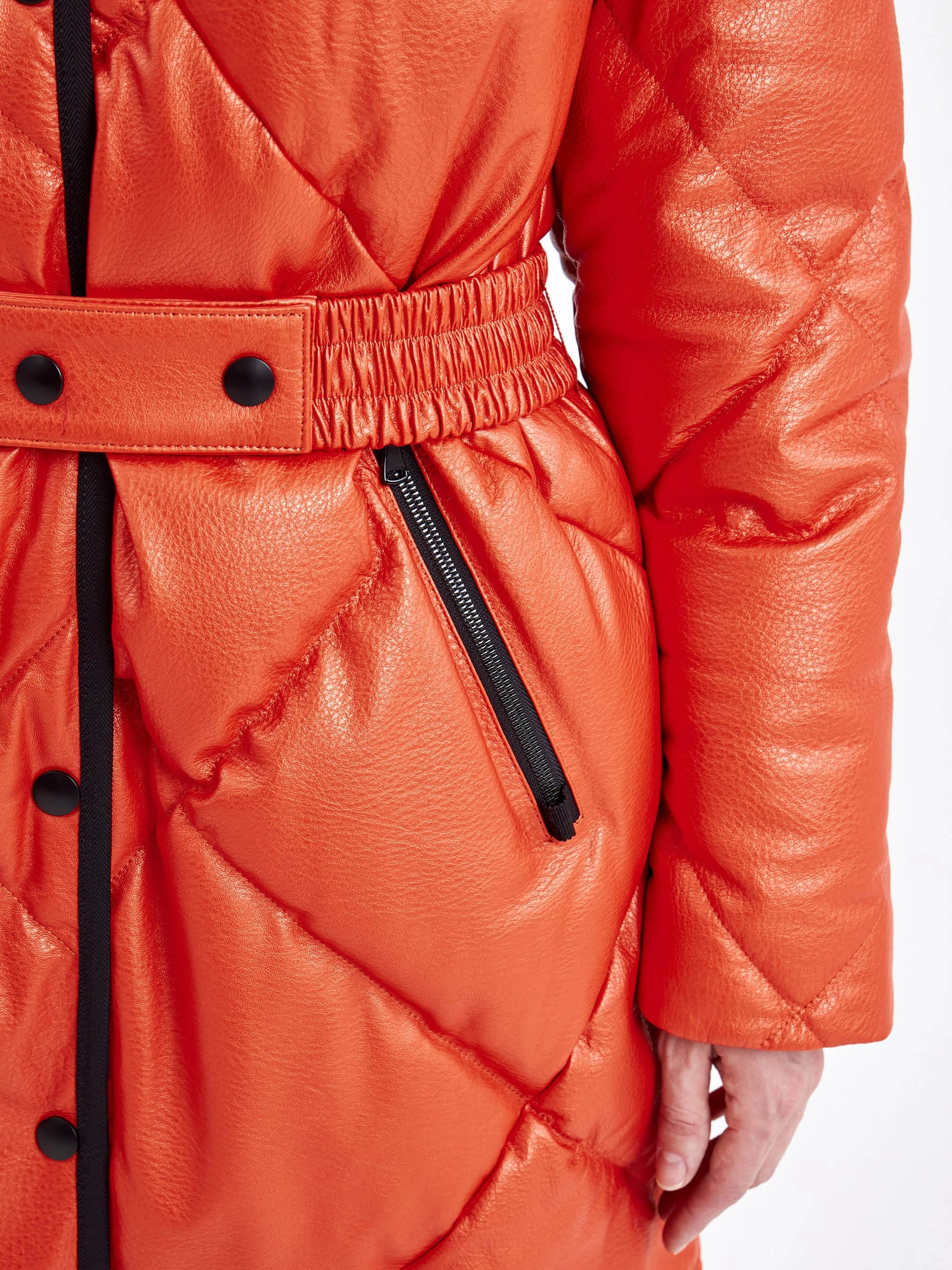 Кожаное женское стеганое пальто с капюшоном премиум класса 3026, оранжевое, размер 48, артикул 25410