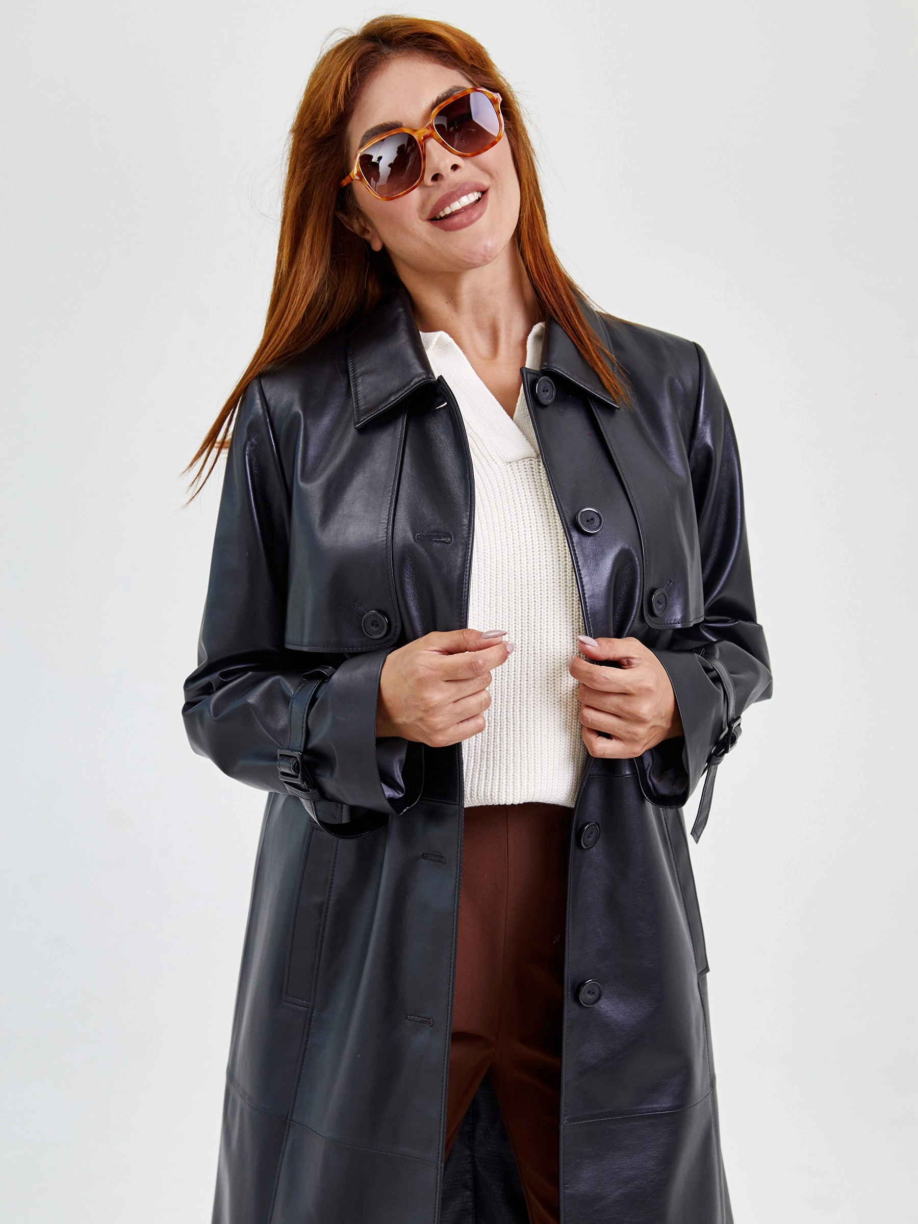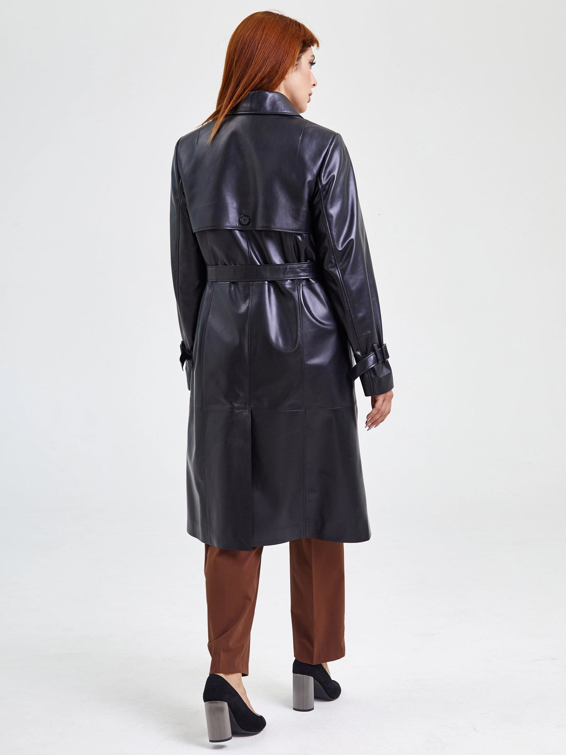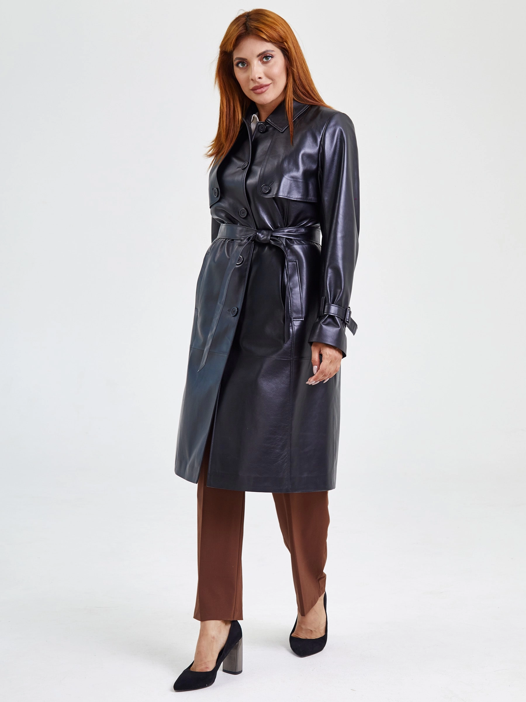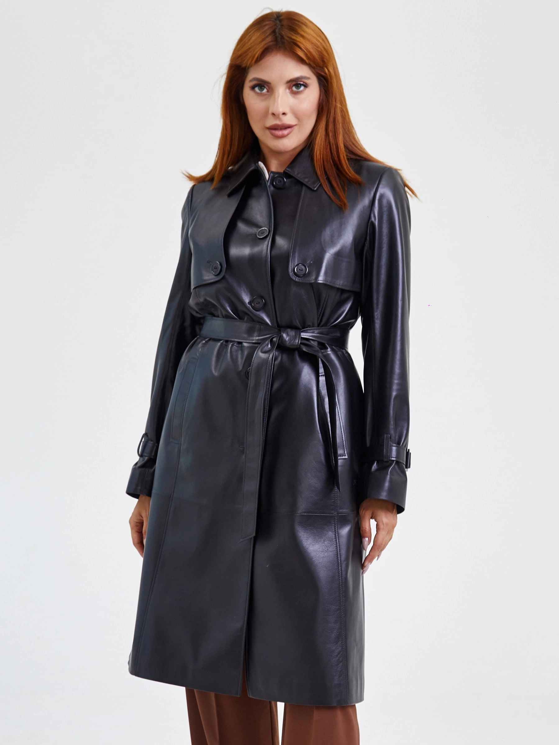 Товар кожаное женское пальто тренч с поясом премиум класса 3018, черное, размер 48, артикул 25660 выполнен из натуральной кожи с застежкой пуговицы. Рассчитан на сезон: демисезон. Длина изделия 108 см, силуэт прямой.