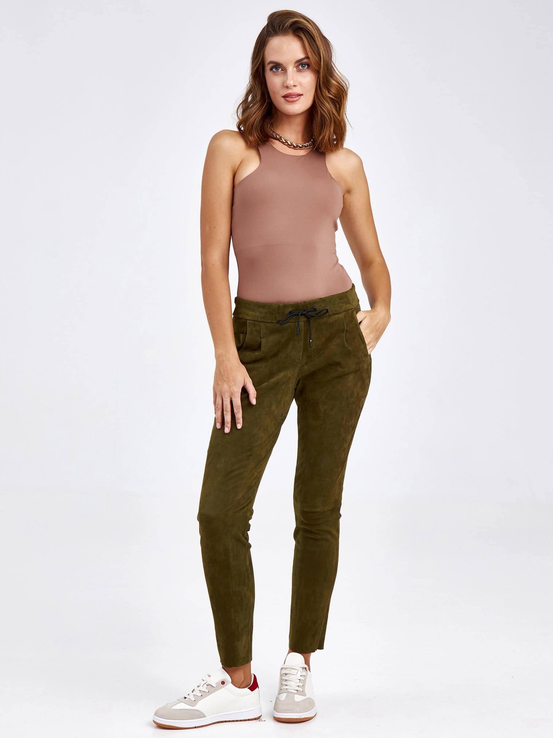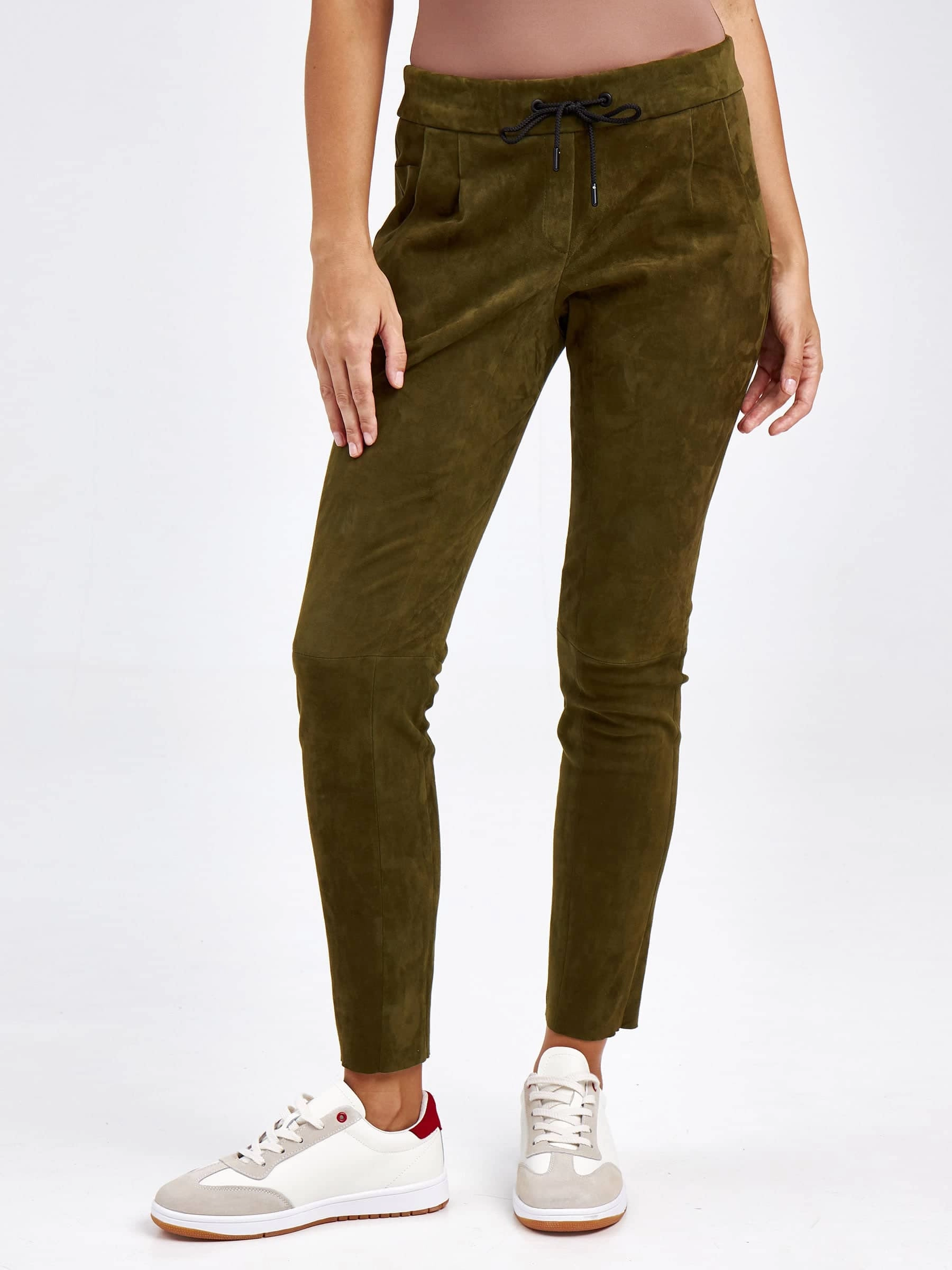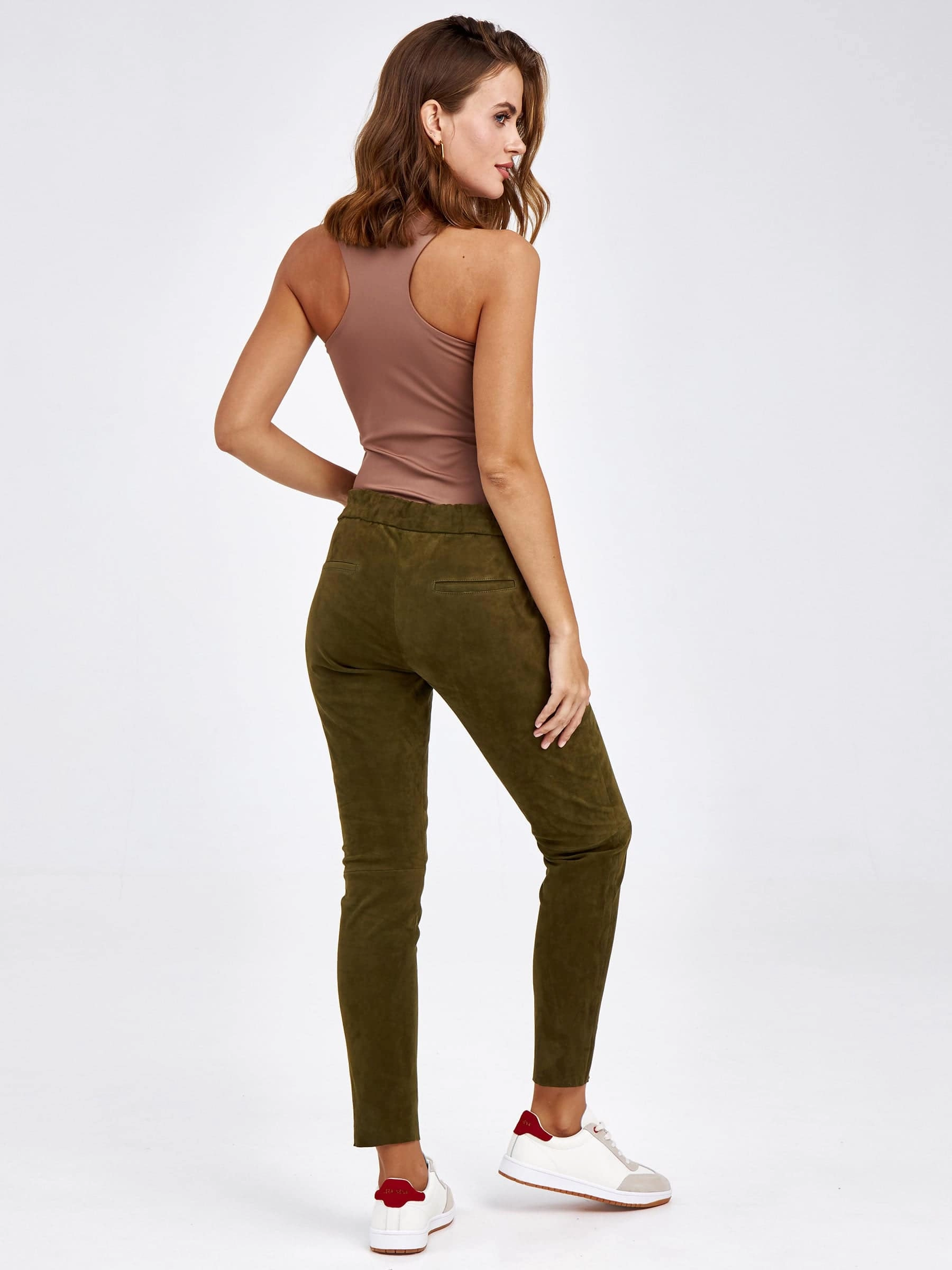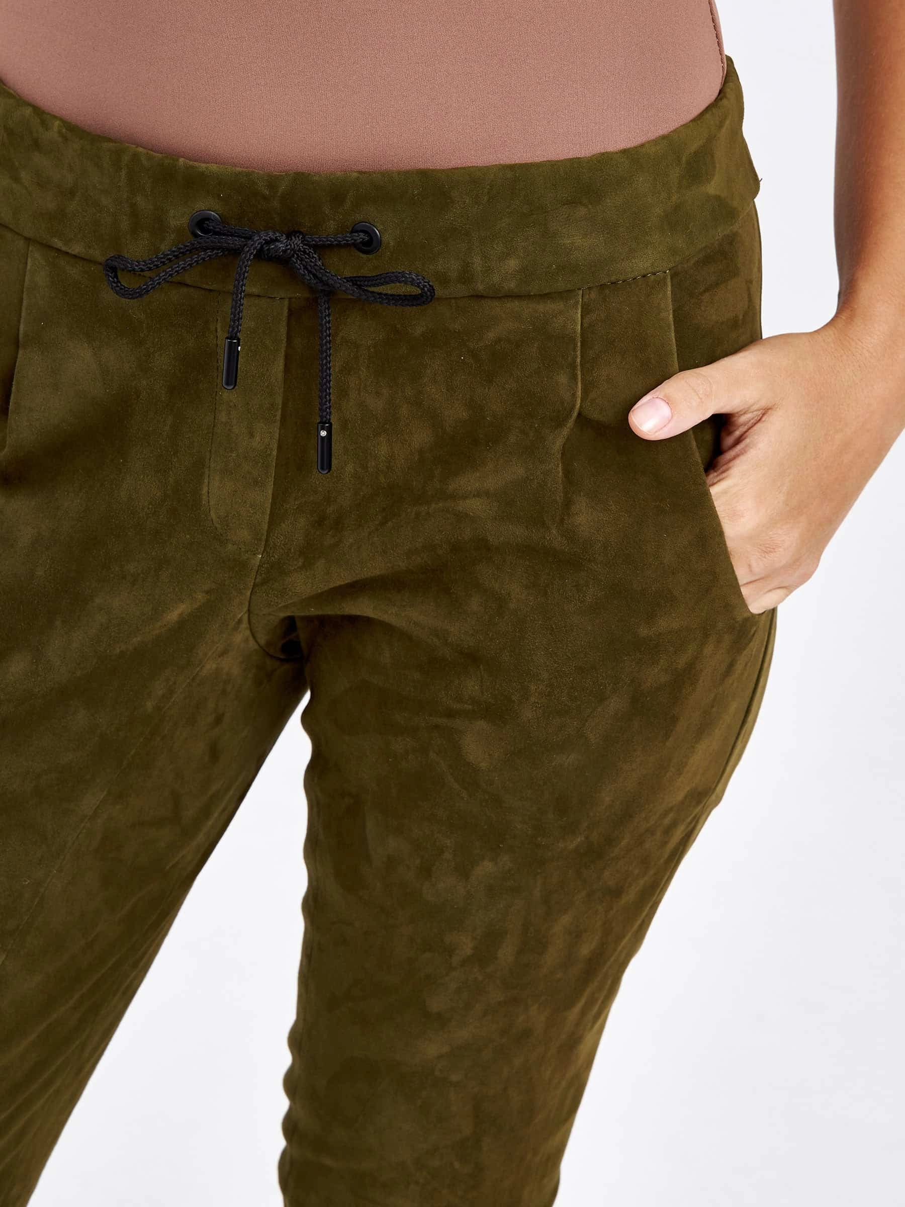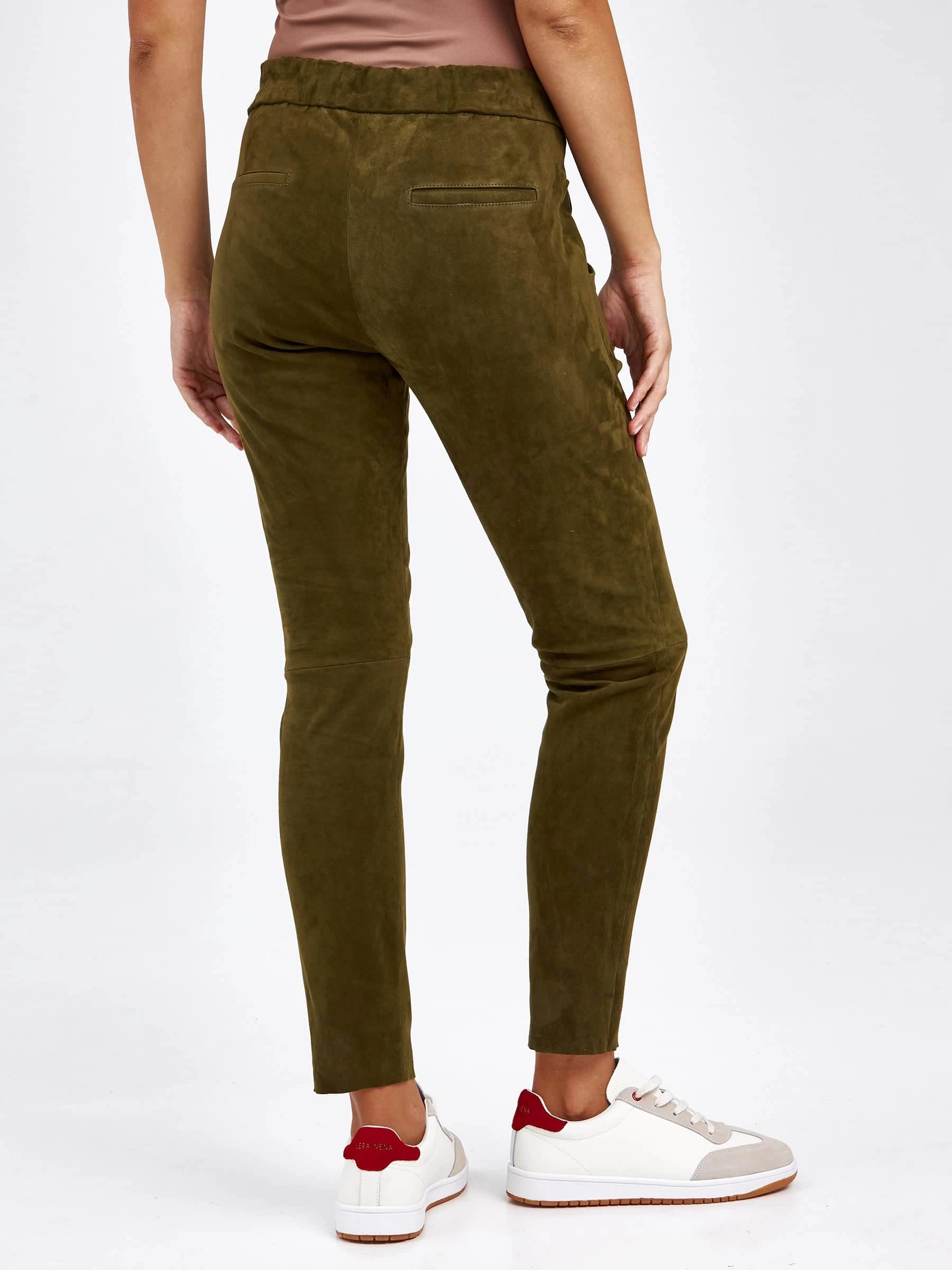 Товар кожаные женские брюки из натуральной замши 07_1, зеленые, размер 44, артикул 85620 выполнен из натуральной замши стрейч с застежкой резинка. Рассчитан на сезон: демисезон. Длина изделия свыше 90 см, силуэт облегающий.
