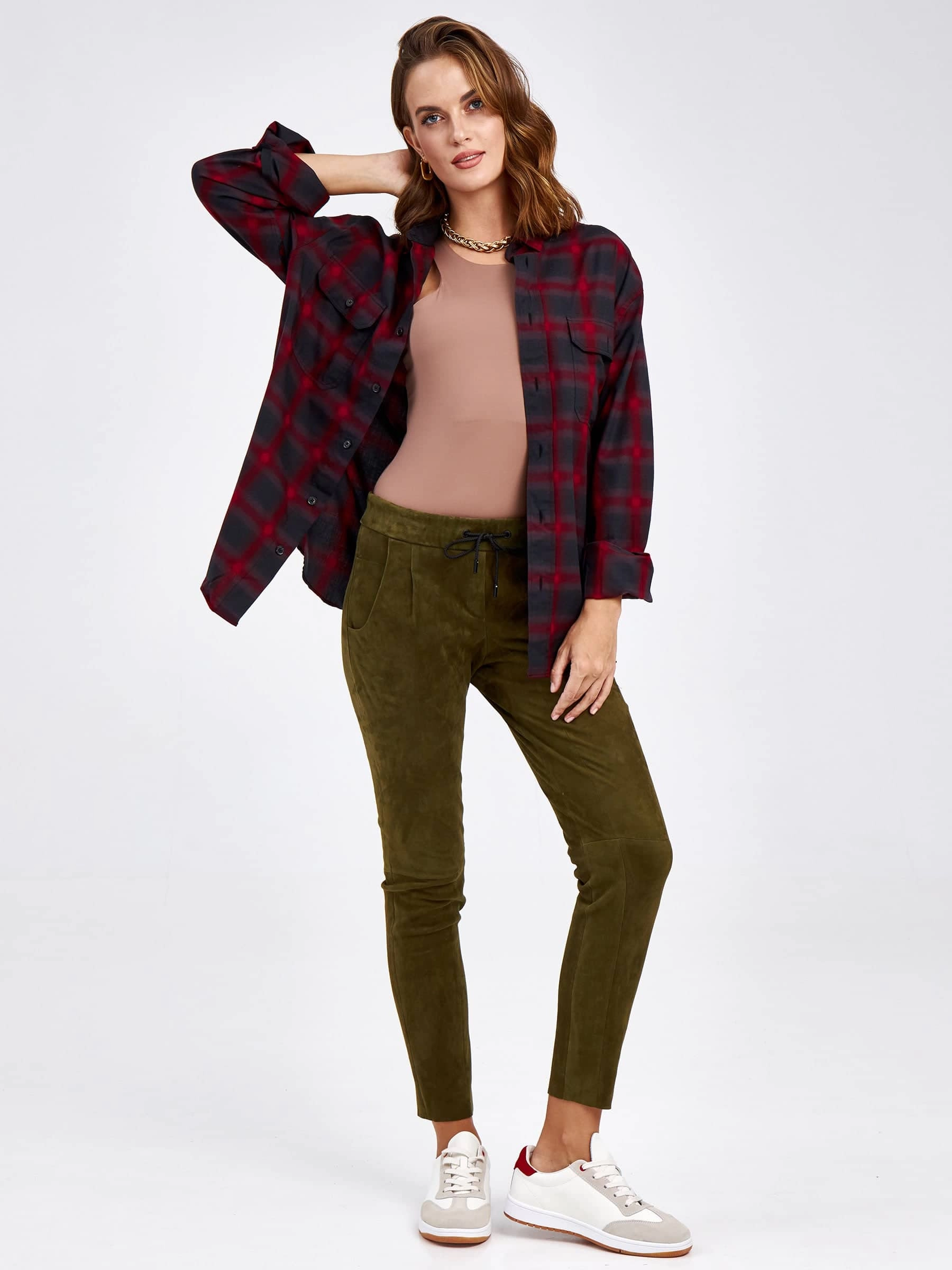 Эти облегающие брюки-стрейч из мягкой натуральной замши стали воплощением современной базовой вещи для ценителей тактильной роскоши. Модель лаконичного повседневного кроя, длиной свыше 90 см, мягко облегает фигуру, создавая вытянутый и безупречный силуэт с благородной матовой фактурой. Отсутствие отделки и подкладки подчёркивает качество материала, его бархатистую глубину и чистоту линий. Удобный пояс на широкой резинке со шнурком обеспечивает идеальную посадку, а эластичность материала гарантирует полную свободу движений. Эти универсальные брюки — идеальный выбор для демисезона, который с лёгкостью дополнит ваш образ от повседневных выходов до неформальных встреч, добавляя ему уютной текстуры и статусности.