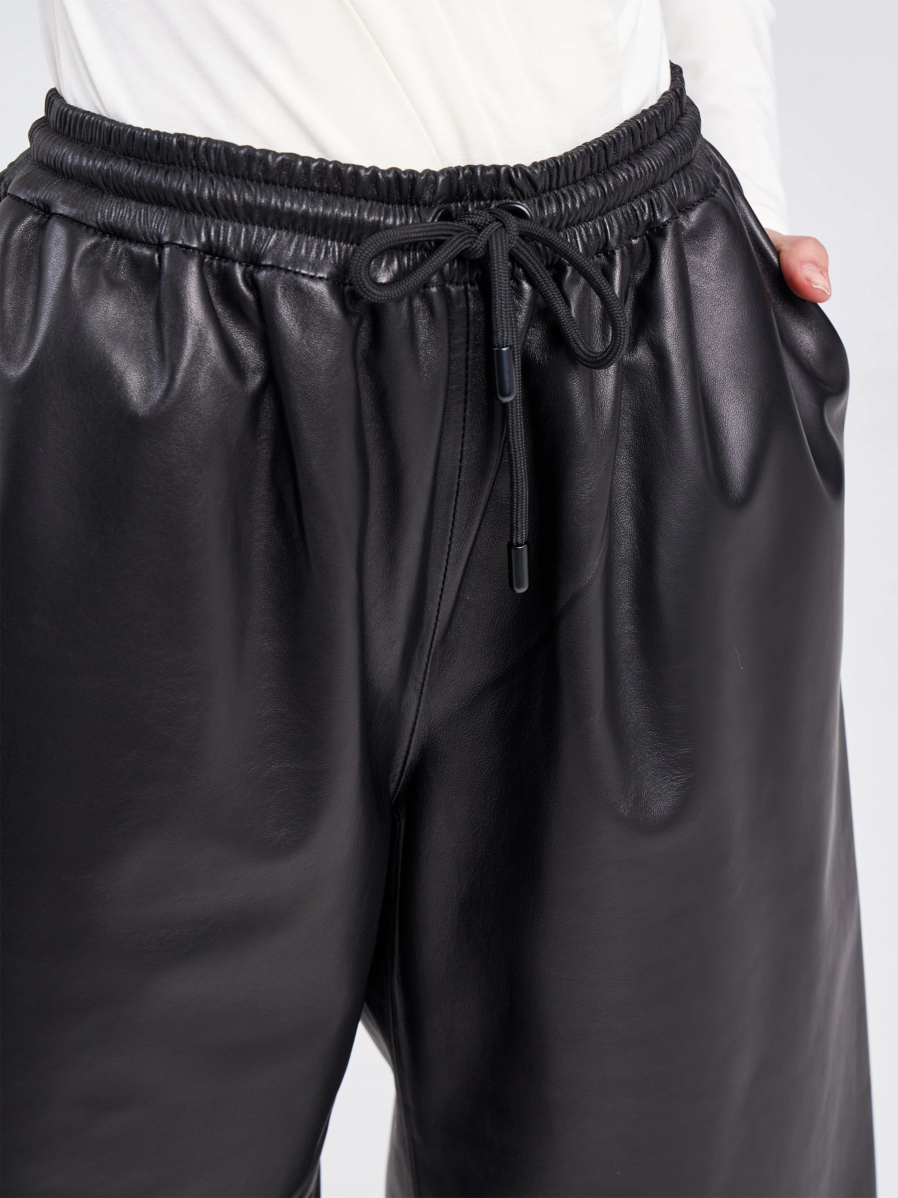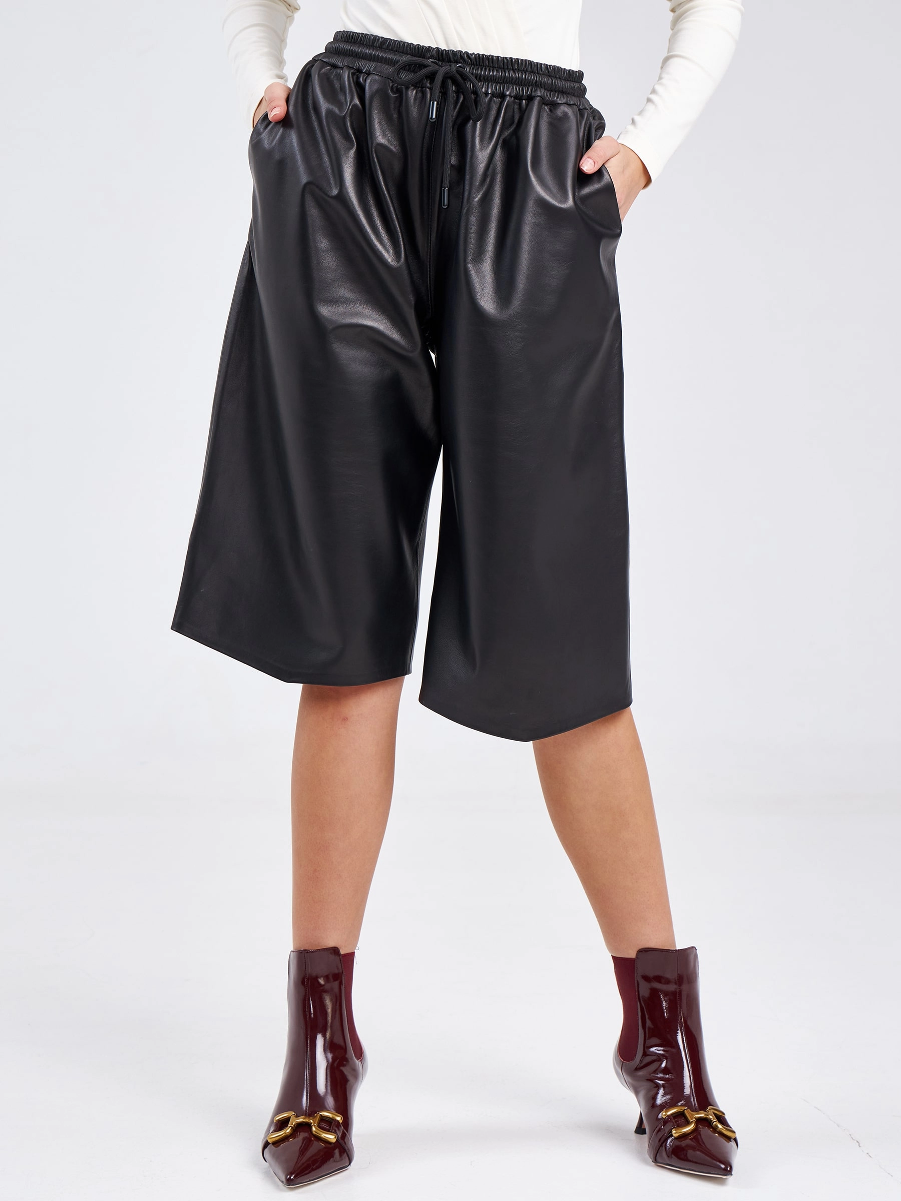 Товар женские кожаные шорты удлиненные 02, черные, размер 44, артикул 85950 выполнен из натуральной кожи с застежкой резинка. Рассчитан на сезон: весна-лето. Длина изделия 65 см, силуэт прямой.