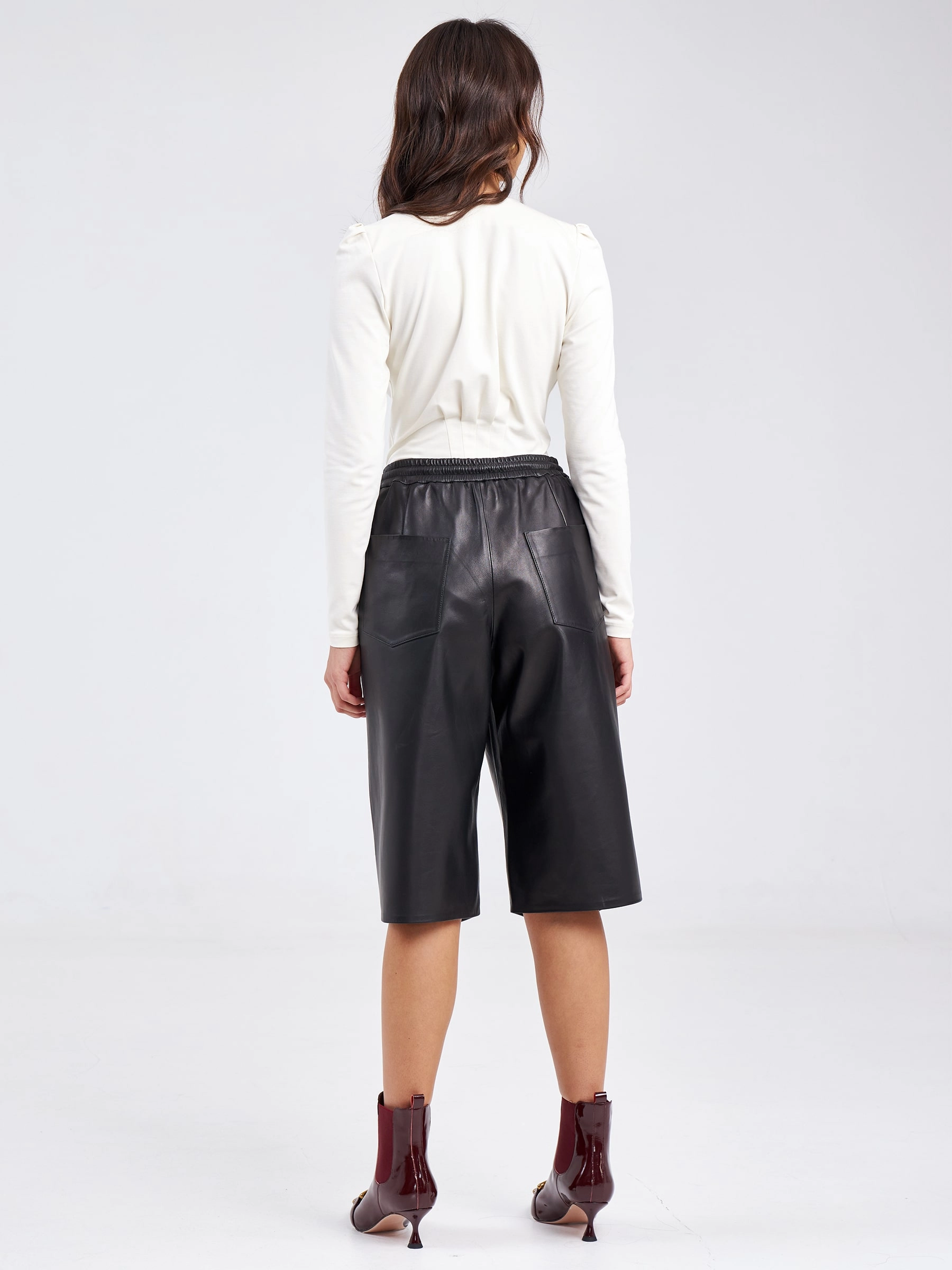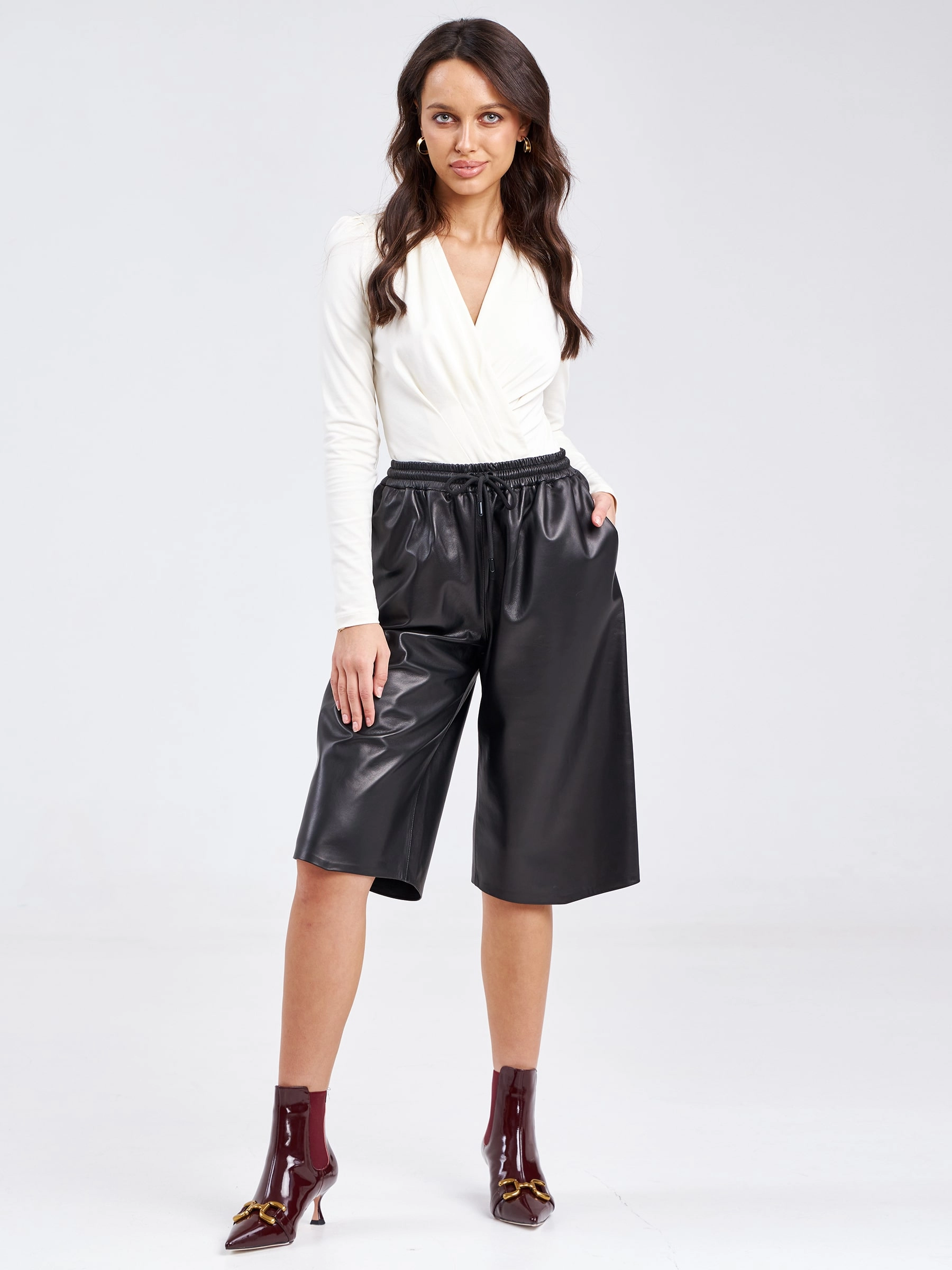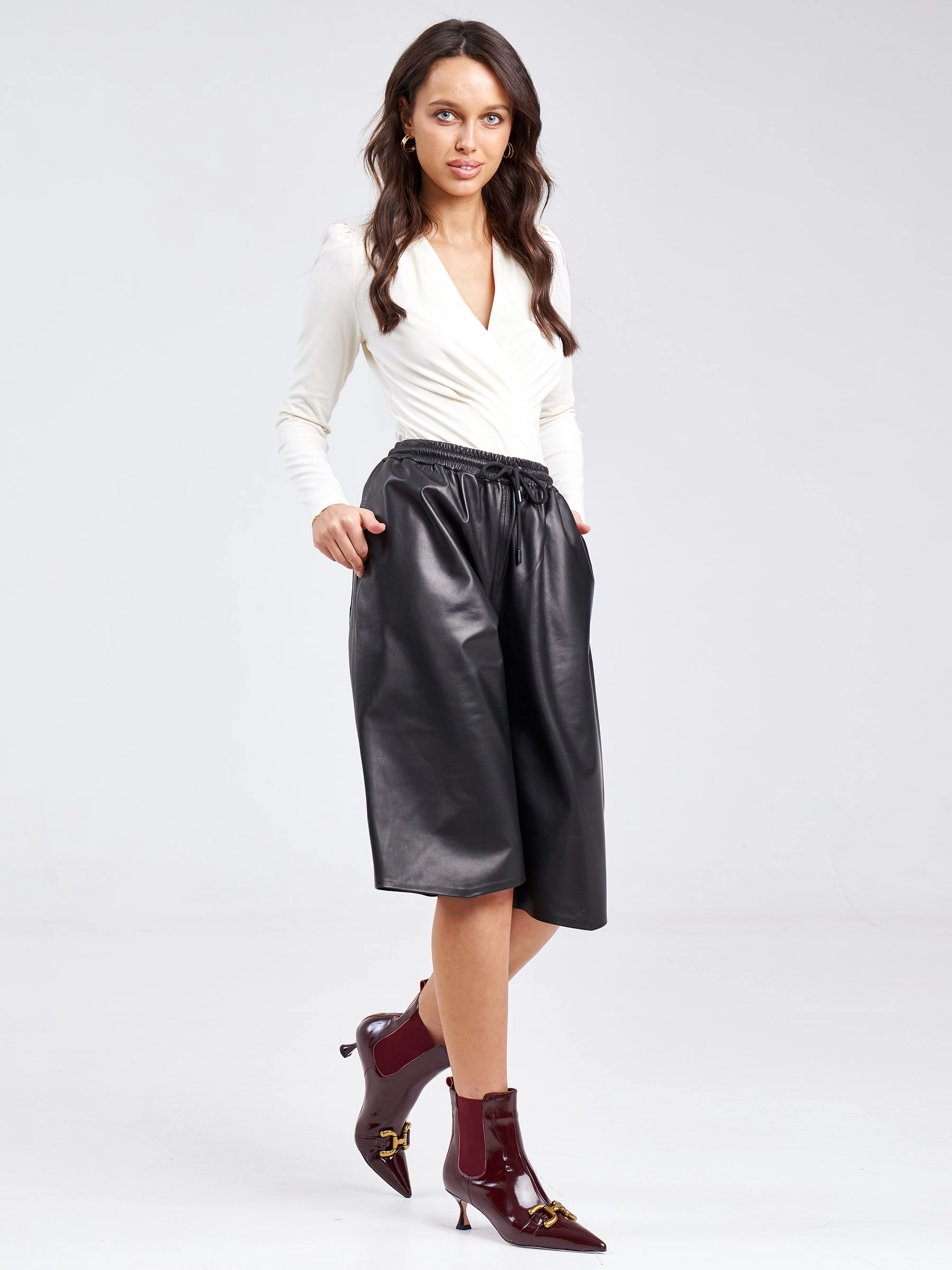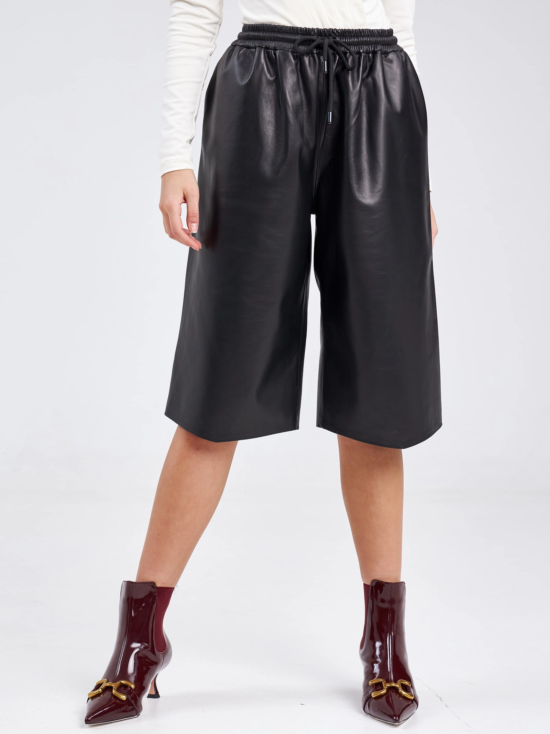 Классические кожаные шорты прямого кроя станут элегантной альтернативой офисной юбке, предлагая безупречную посадку и универсальную длину на 2–3 см ниже колена для сдержанного делового образа. Модель выполнена из натуральной кожи премиум-качества с глянцевой фактурой оптимальной плотности, обеспечивающей комфортную носку без подкладки, что гарантирует идеальную терморегуляцию. Прямой силуэт с аккуратной высокой посадкой подчеркивает талию, а минималистичный дизайн без лишних деталей включает только аккуратные карманы и пояс. Эти шорты легко сочетаются с классической блузой и лодочками для строгого дресс-кода, с oversize-пиджаком и балетками для трендового офисного лука или с шёлковым топом и мюли для вечернего элегантного варианта.