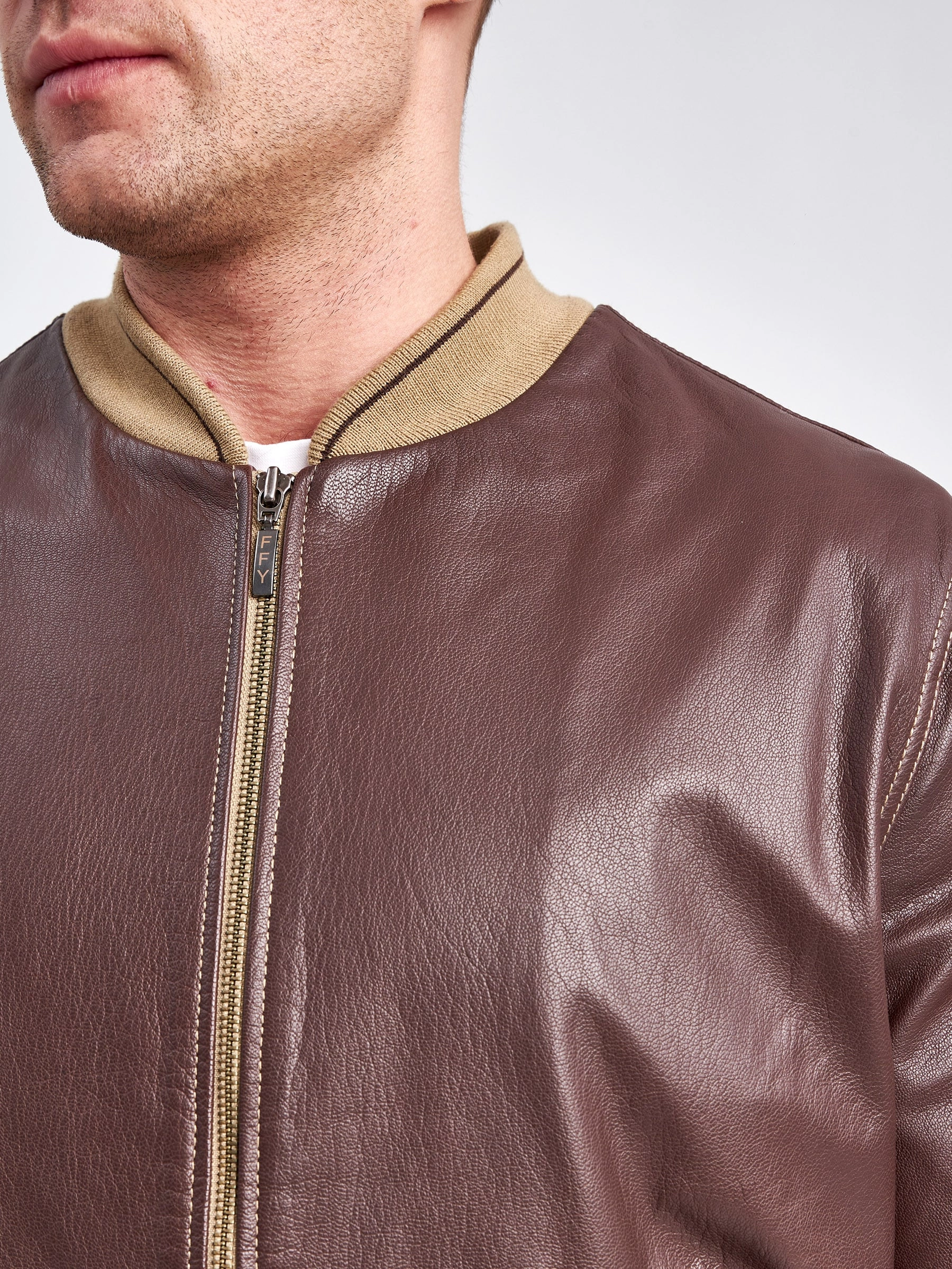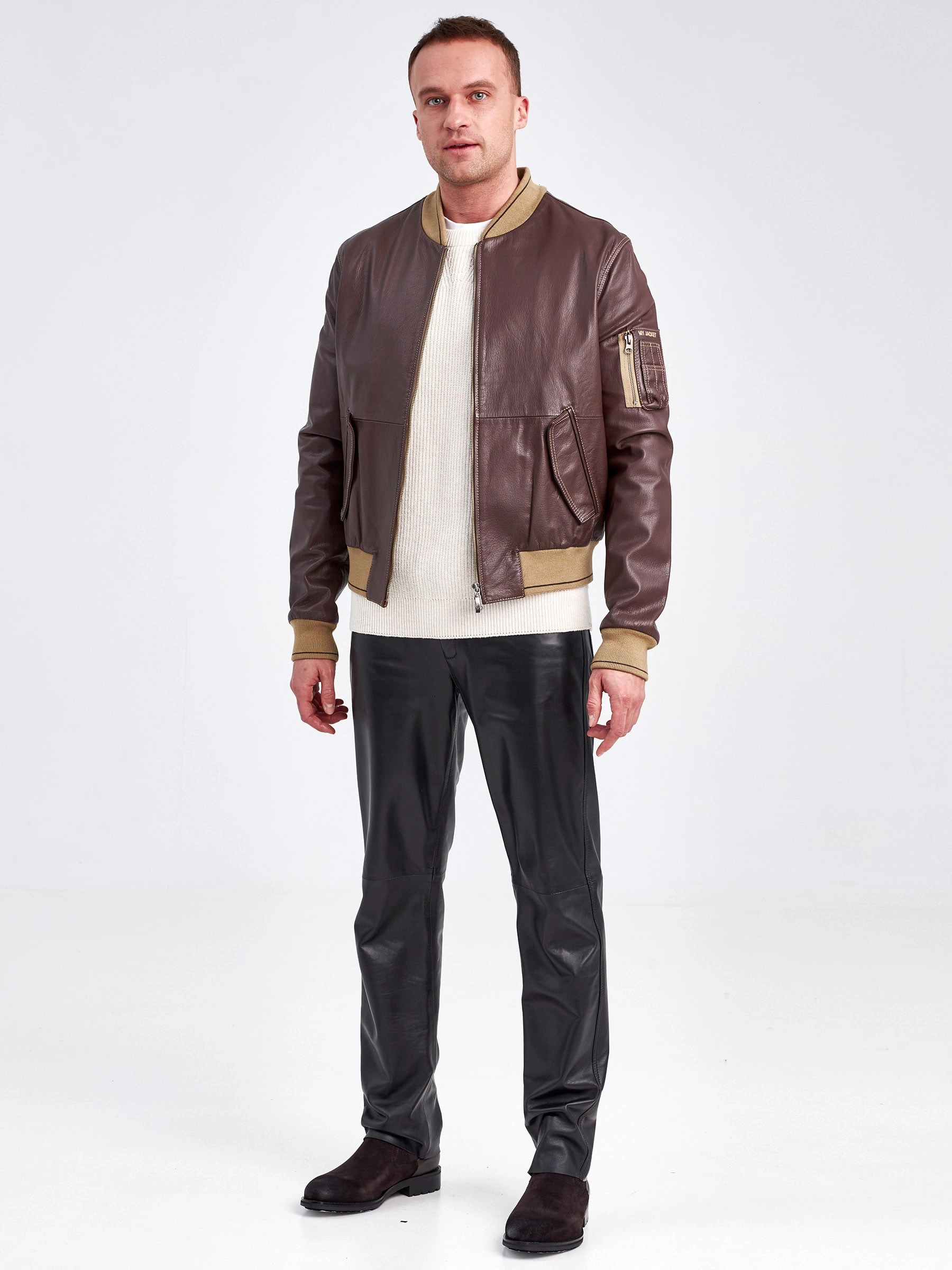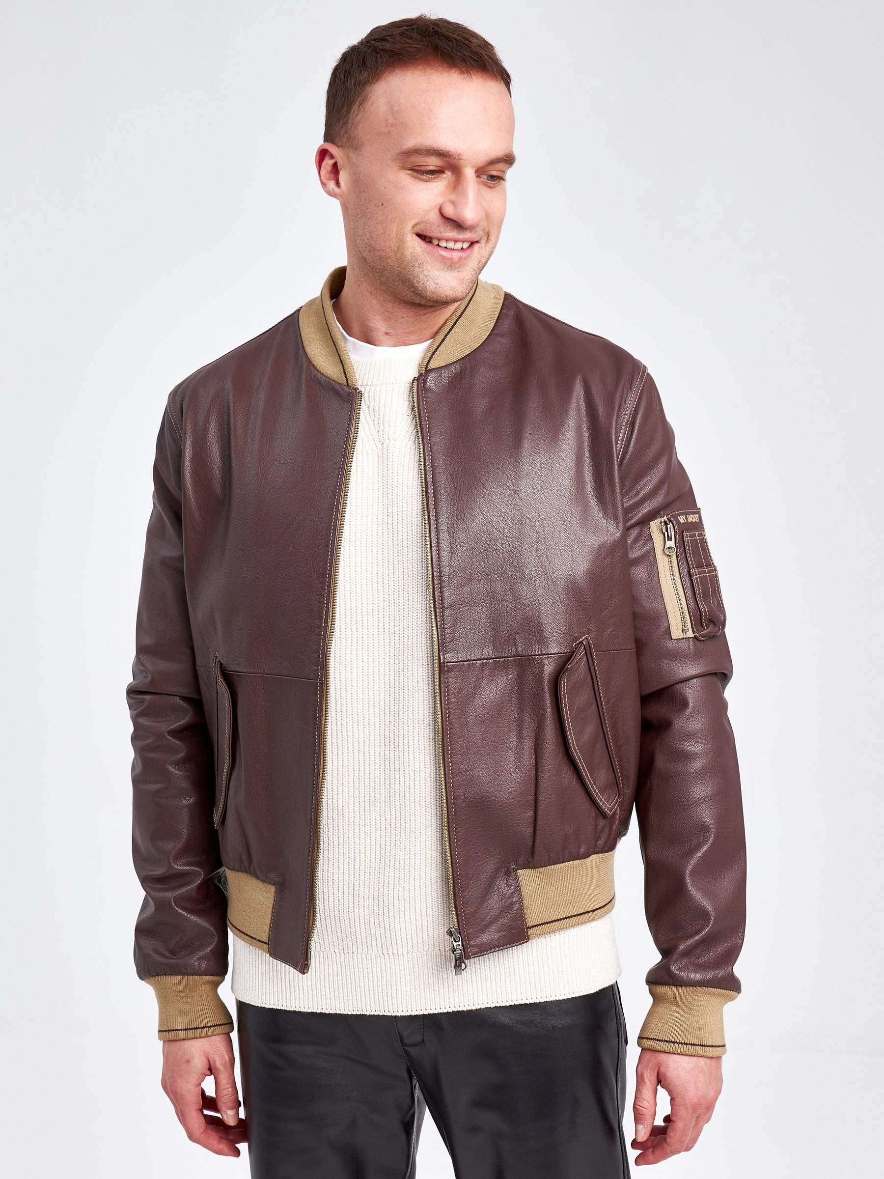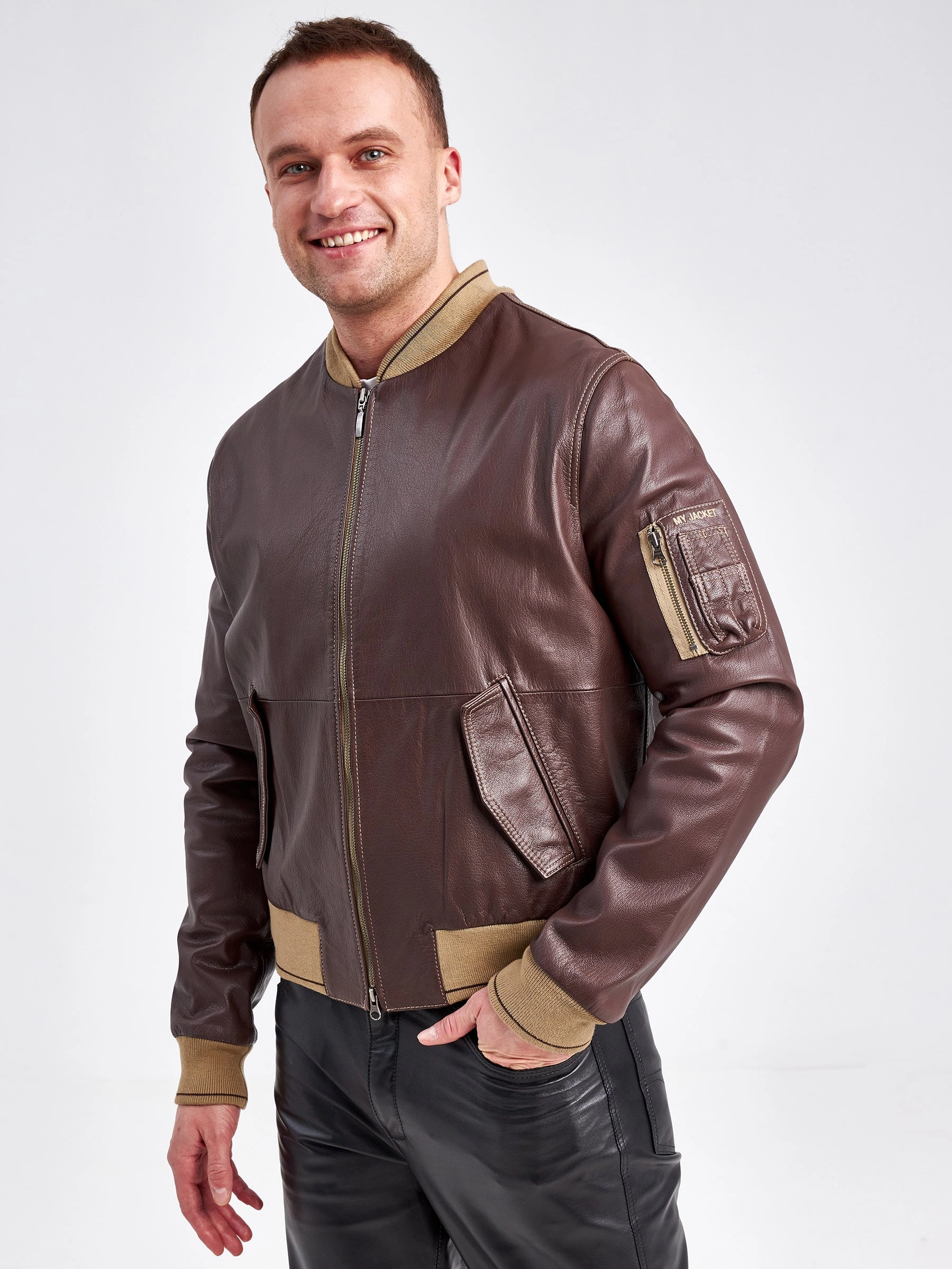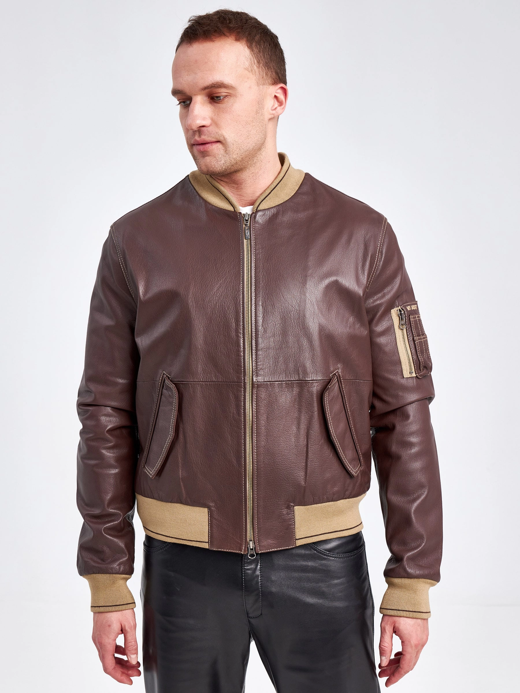 Классический мужской бомбер из итальянской натуральной кожи на подклаке из 100% хлопка, с резинками из мерсирезированного трикотажа.