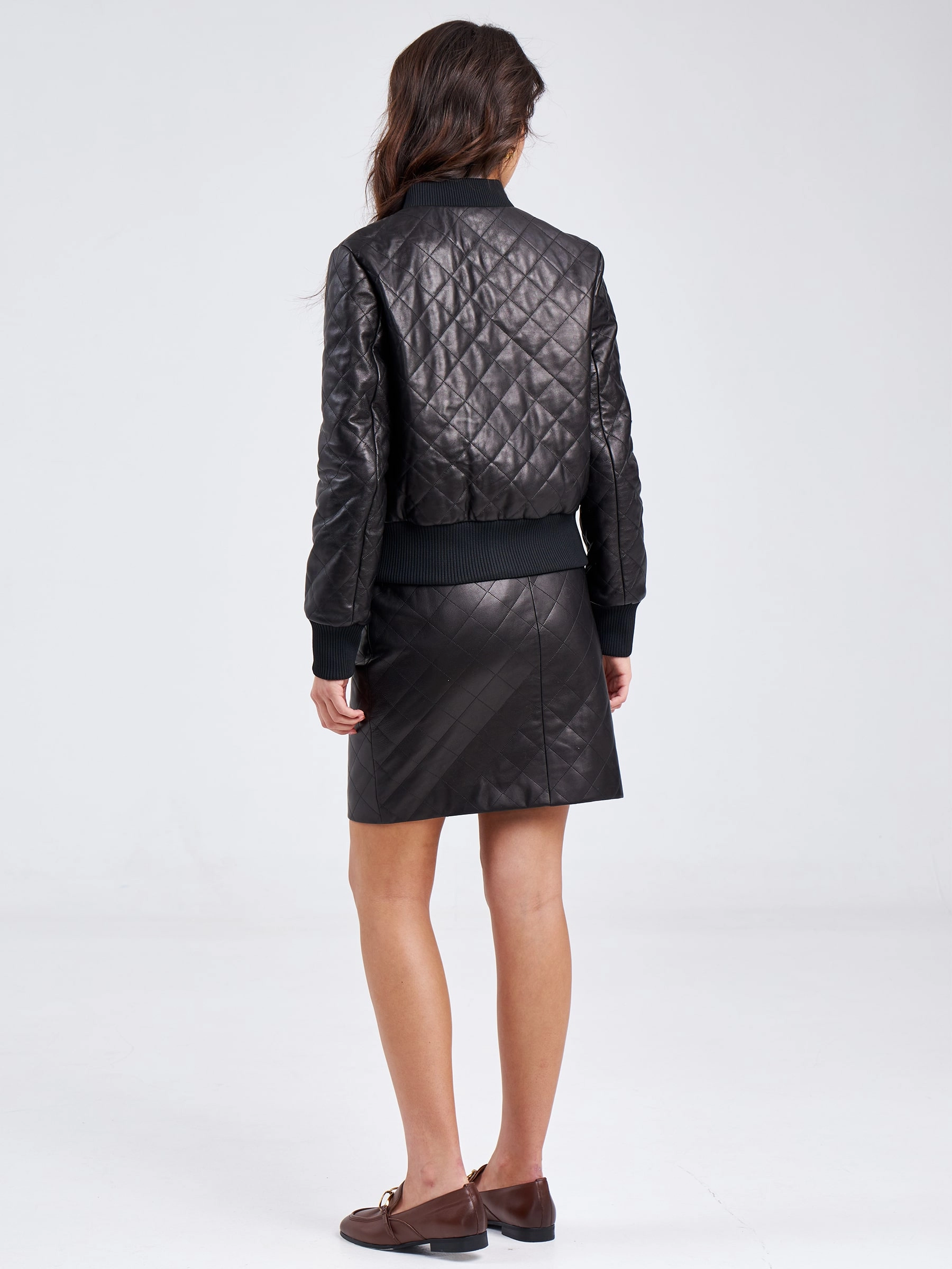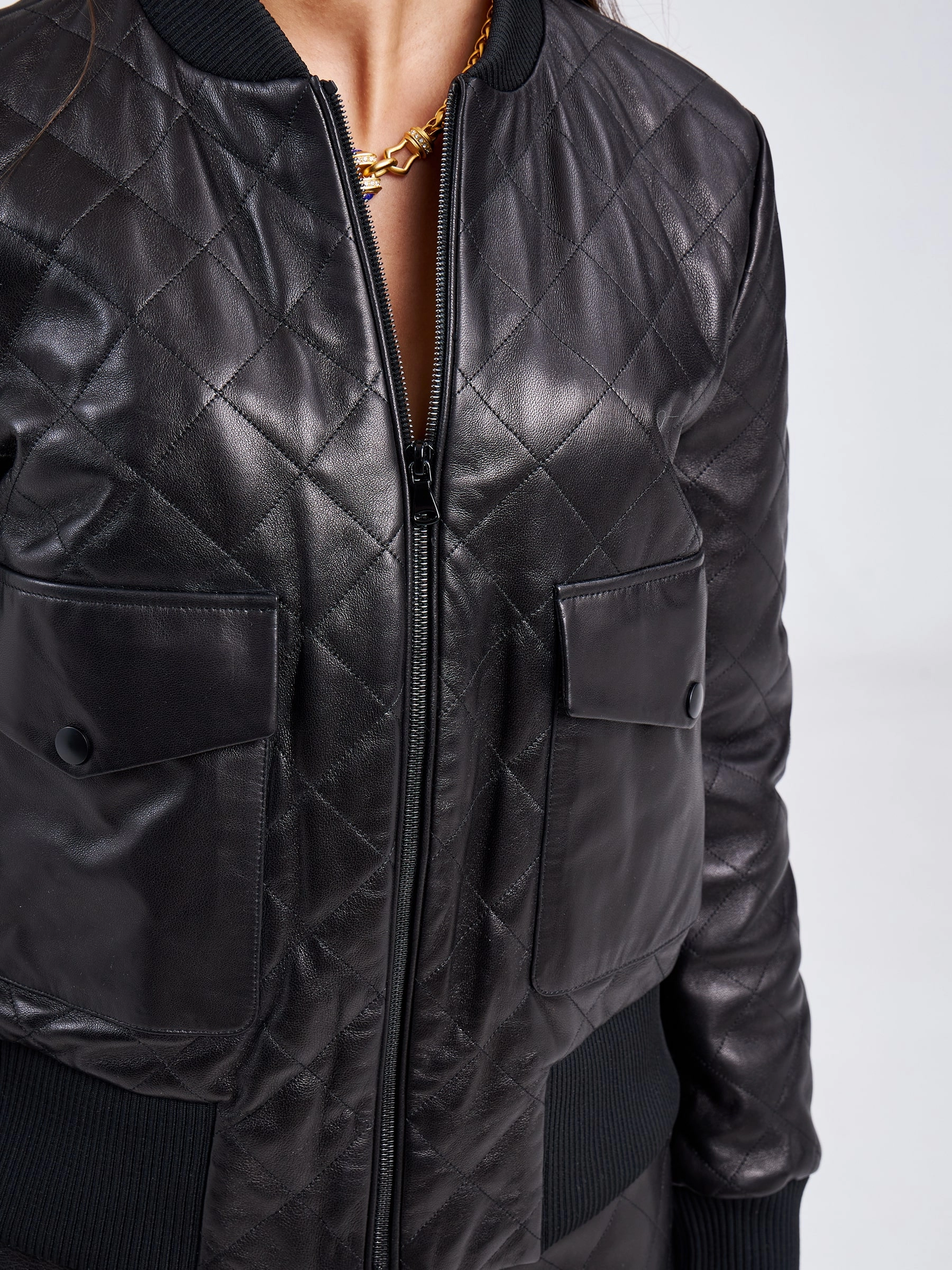 Куртку-бомбер прямого кроя с трикотажным воротником и манжетами, выполнили из гладкой стеганой кожи премиум-класс.Акцент сделали на накладные карманы с клапанами на кнопках.