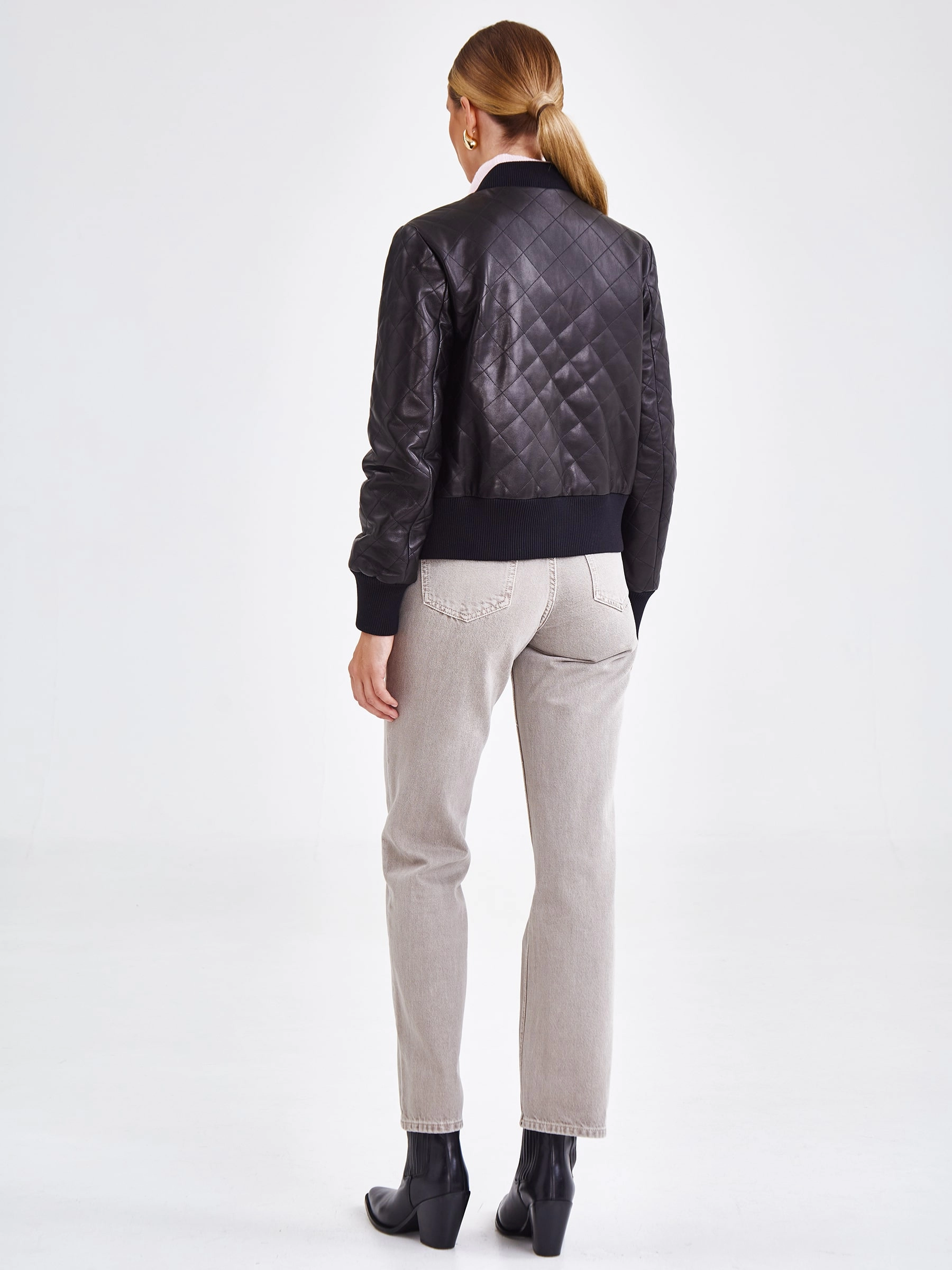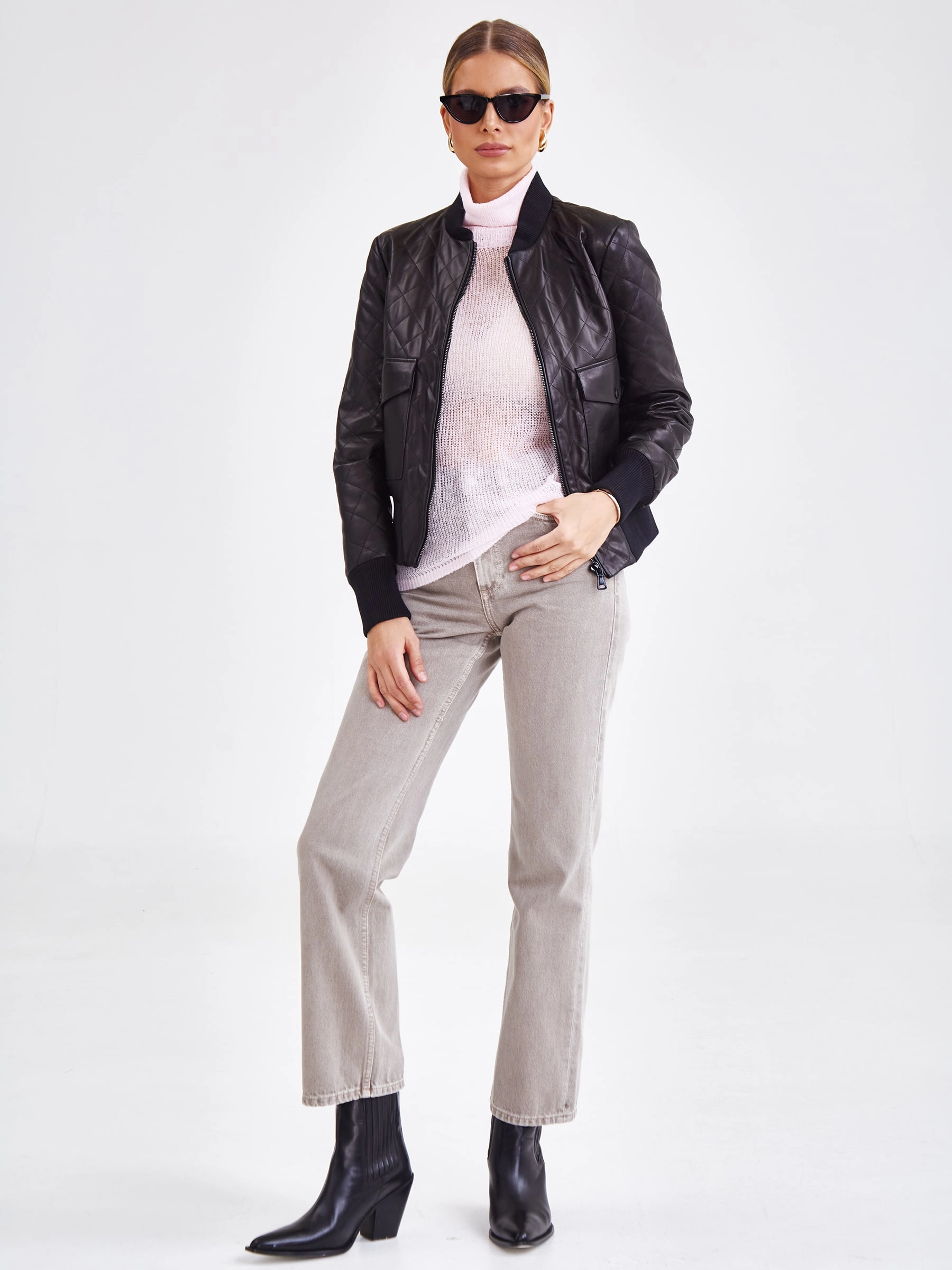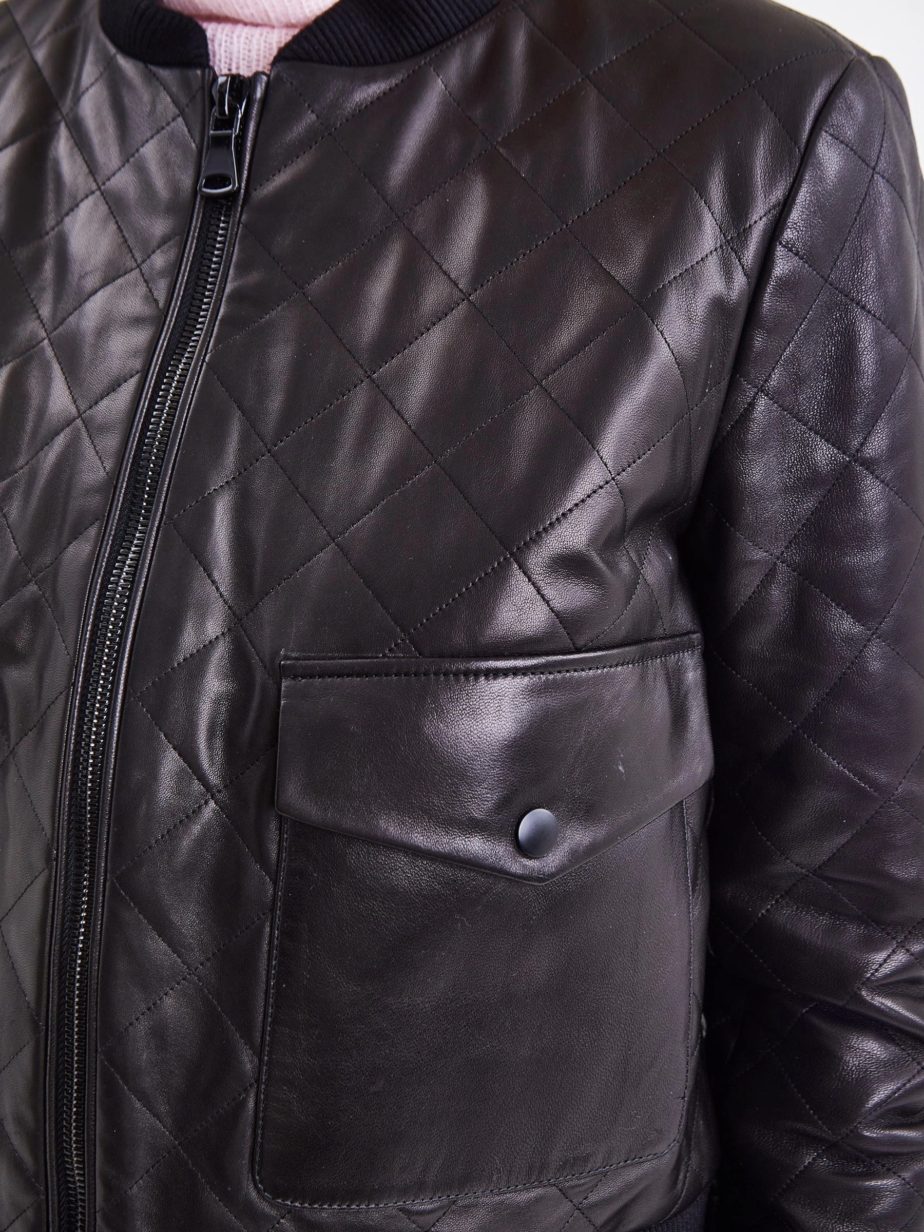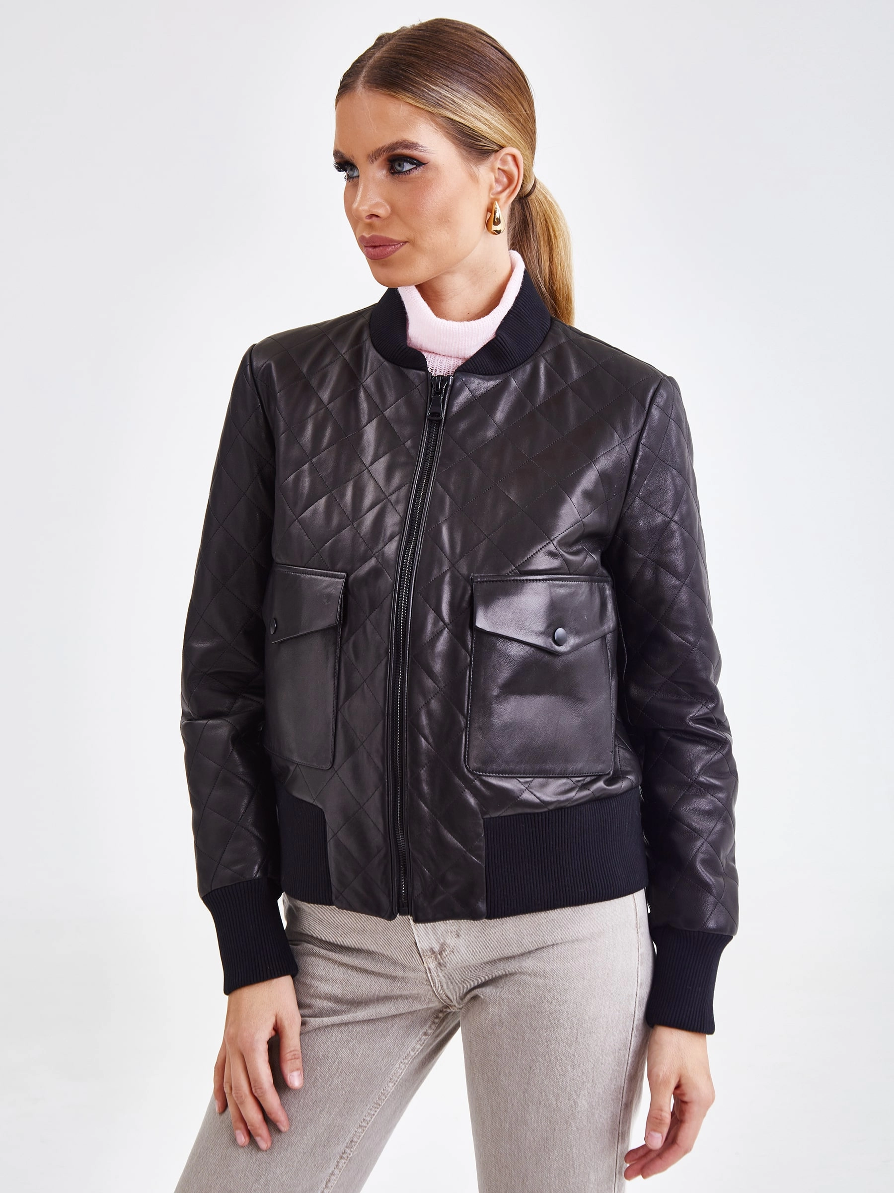 Куртку-бомбер прямого кроя с трикотажным воротником и манжетами, выполнили из гладкой стеганой кожи премиум-класс.Акцент сделали на накладные карманы с клапанами на кнопках.