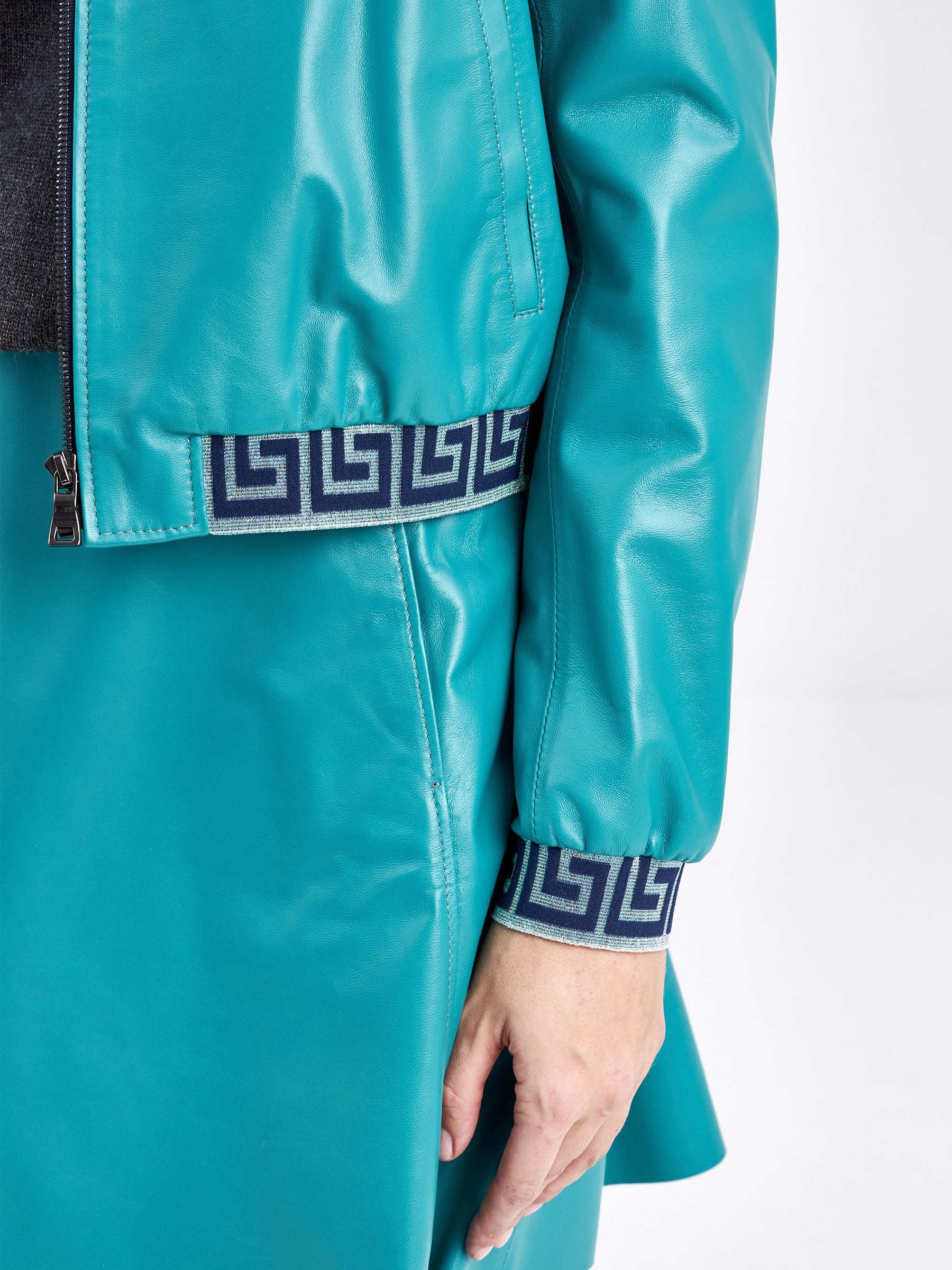 Эффектная и удобная кожаная куртка-бомбер бирюзового цвета, выполненная из натуральной нежной кожи, создана для создания стильных образов. Её свободный крой, длина 48 см и лаконичная стойка в спортивном стиле делают её невероятно универсальной. Этот актуальный предмет гардероба станет отличным спутником как для офиса в паре с классической юбкой или брюками, так и для любого мероприятия в сочетании с лёгким платьем или шелковистым комбинезоном. Для современного прочтения образа сочетайте её с базовыми белыми футболками, джинсами с завышенной талией и кроссовками или белыми кедами, чтобы яркий бирюзовый цвет и фактура кожи оставались в центре внимания.