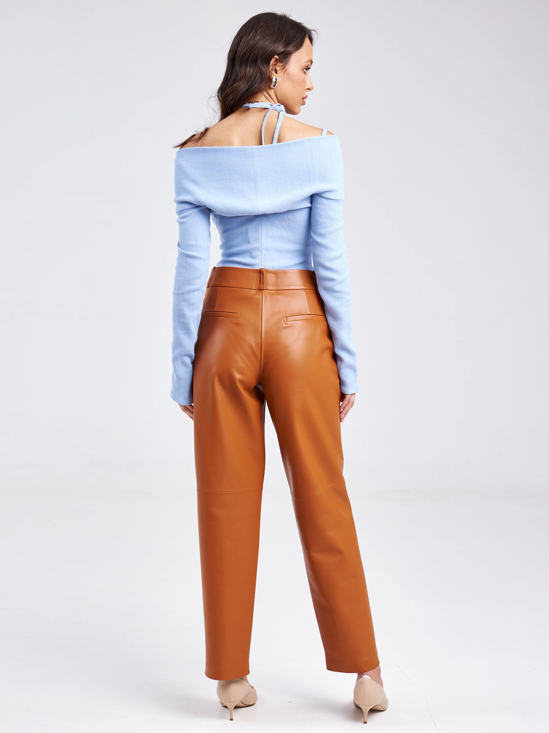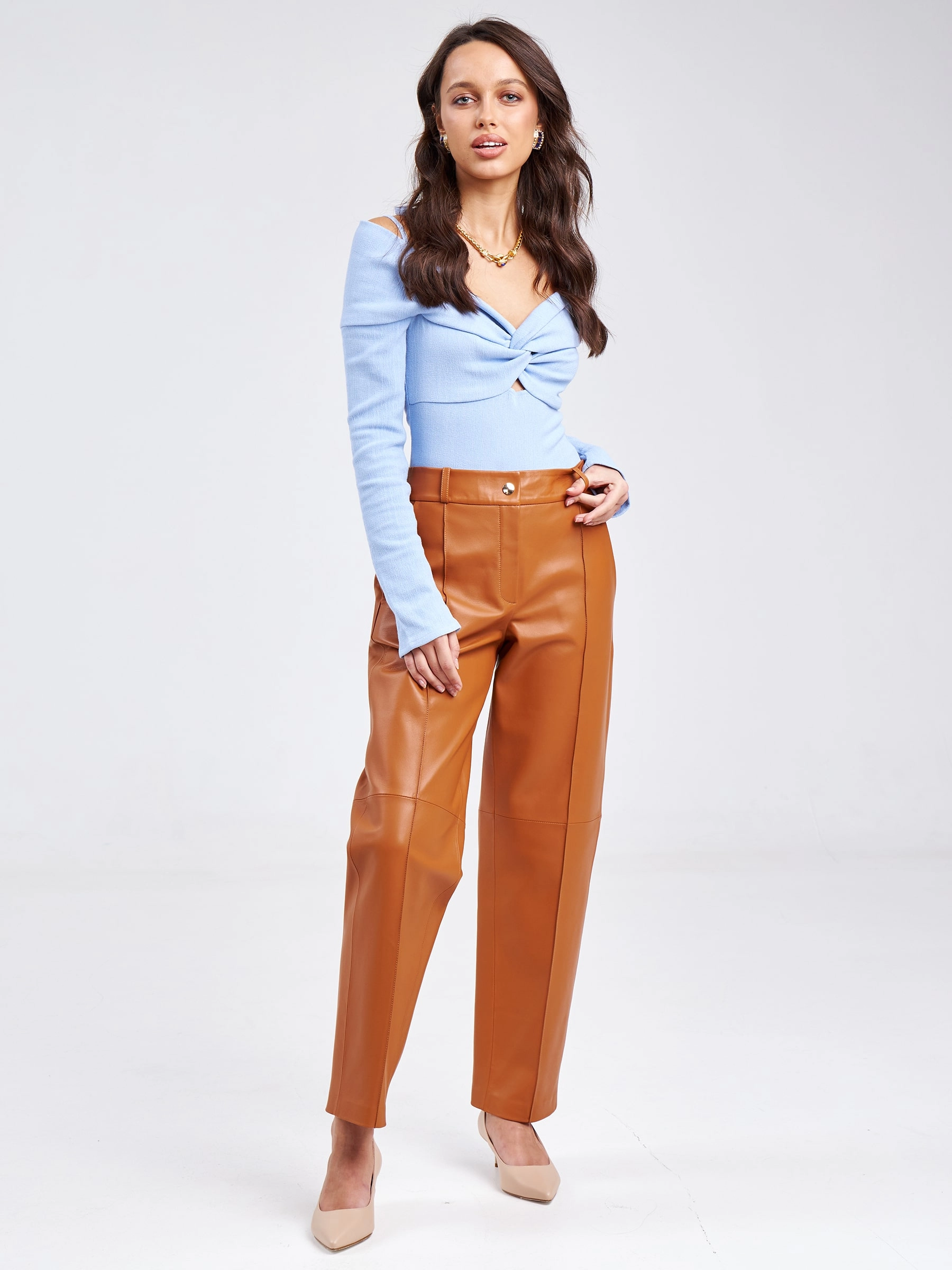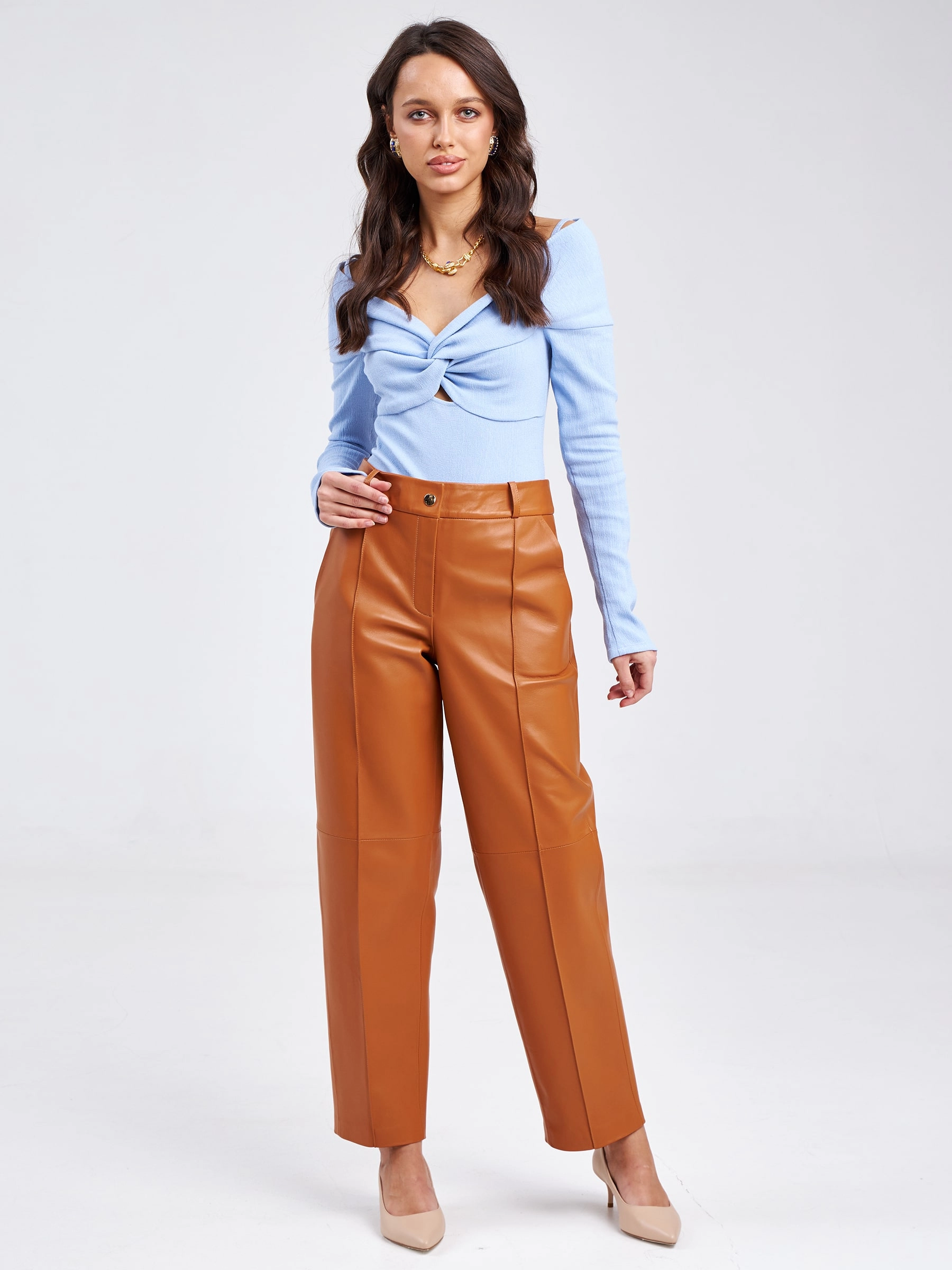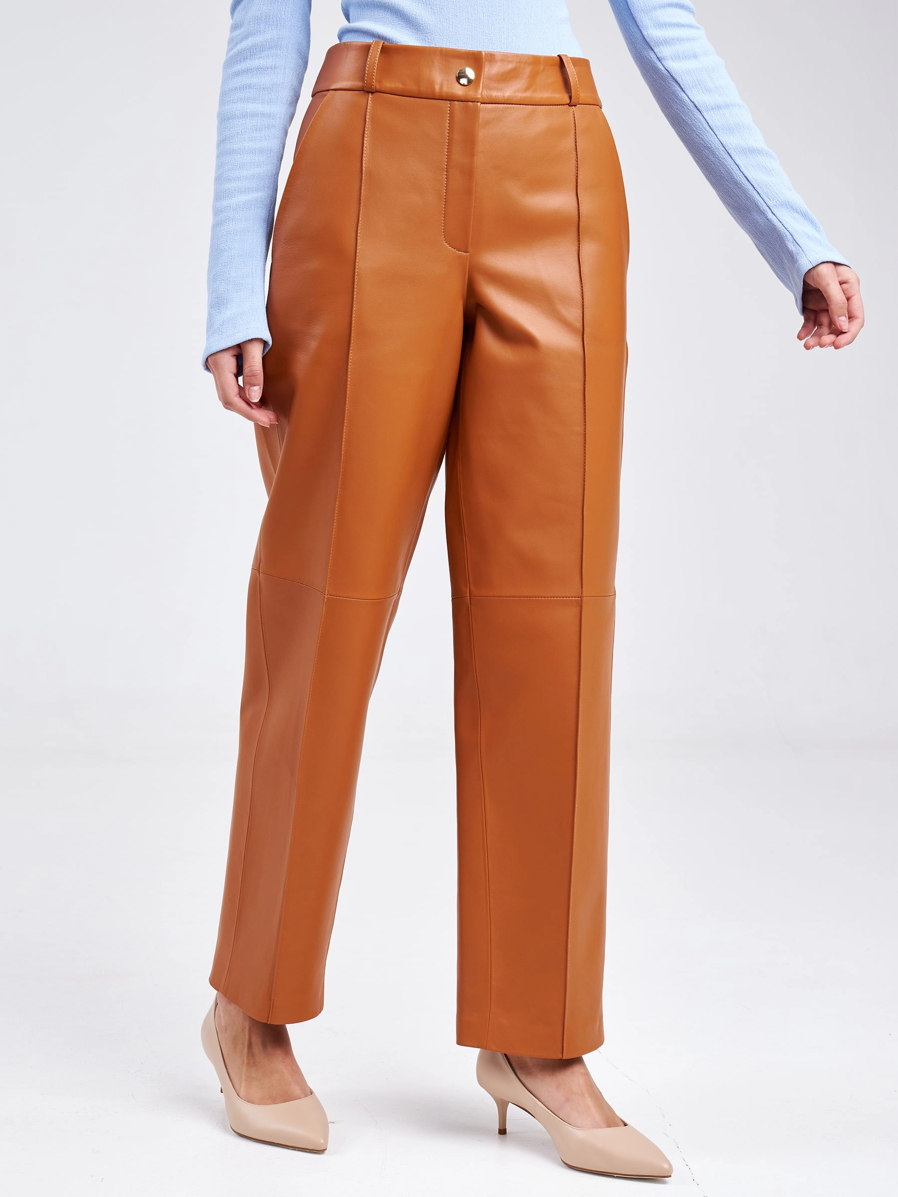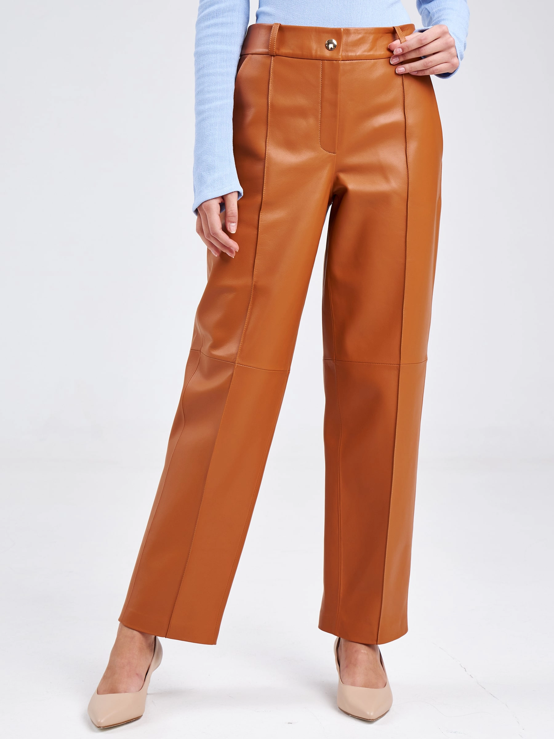 Создать эффектный образ помогут брюки со стрелками из натуральной кожи премиум-класс. Прямой крой, средняя посадка, удобные боковые карманы.