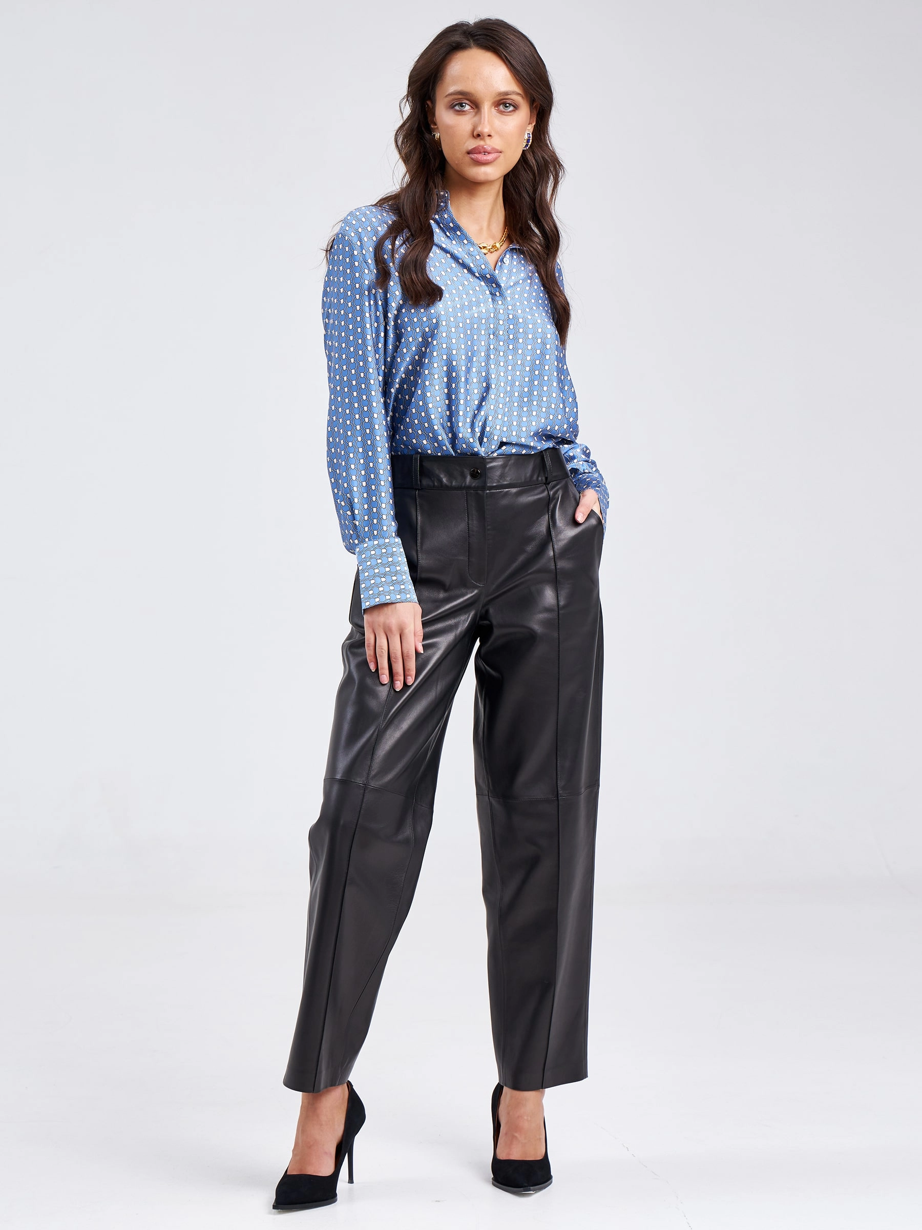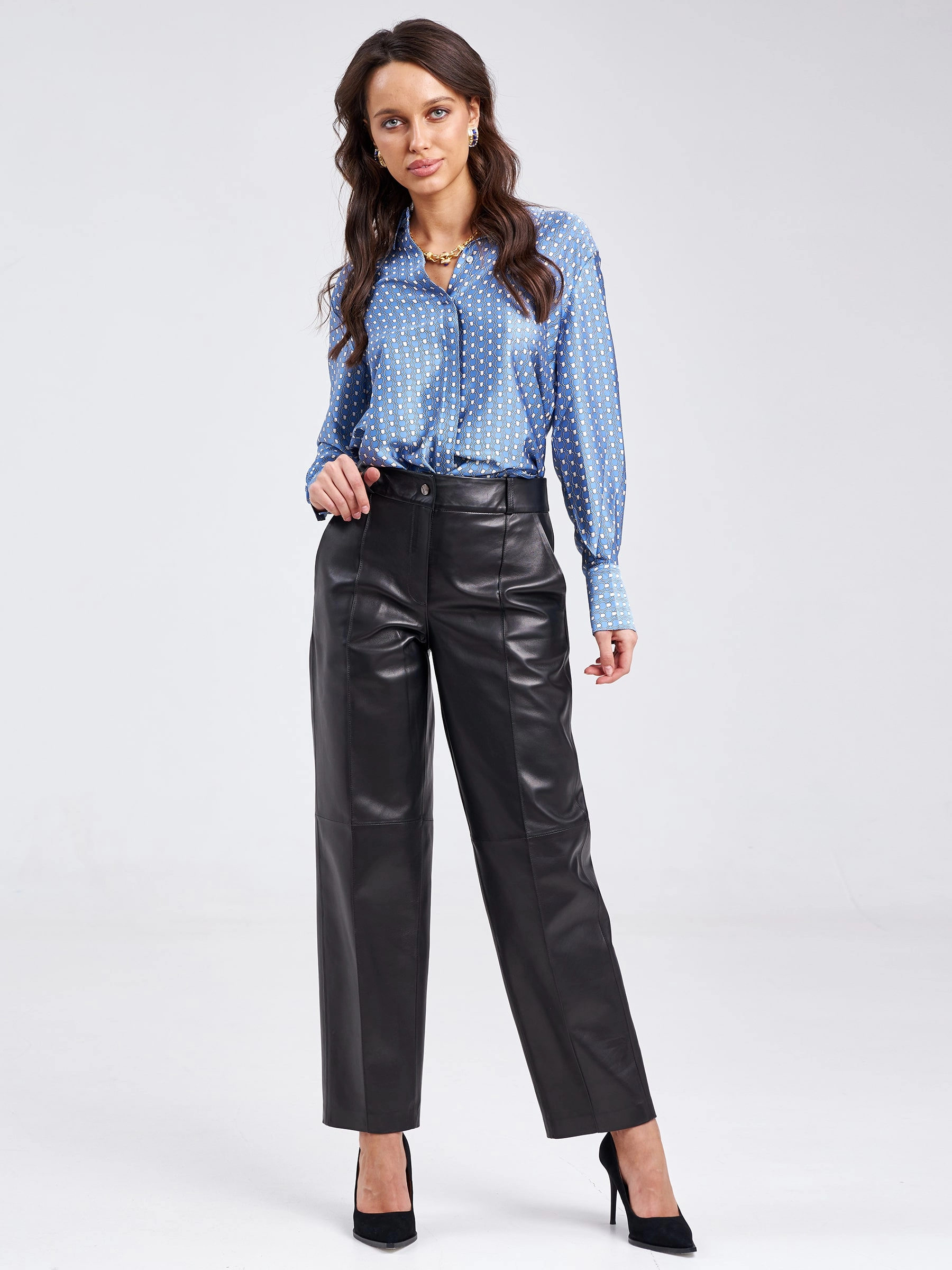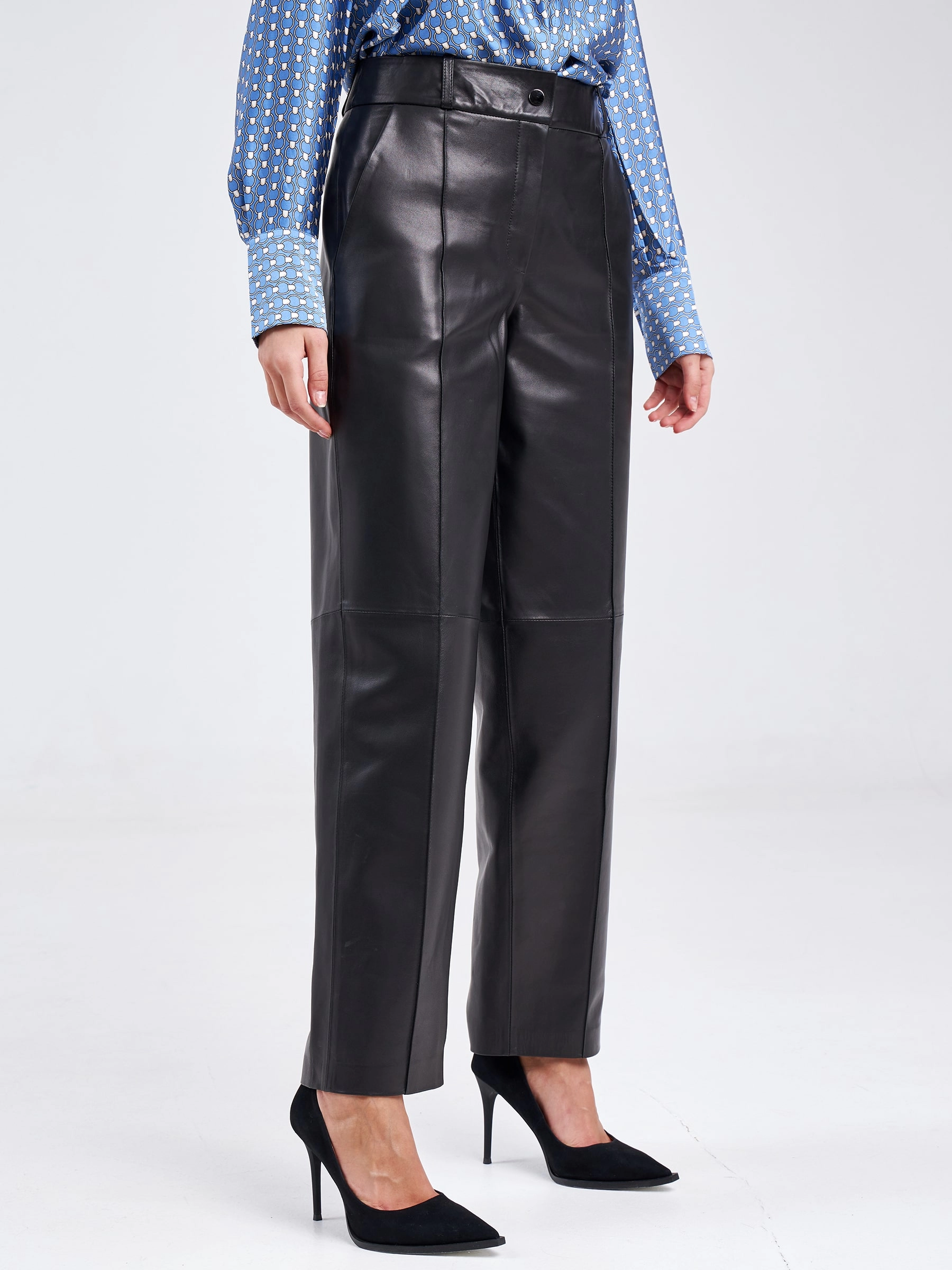 Создать эффектный образ помогут брюки со стрелками из натуральной кожи премиум-класс. Прямой крой, средняя посадка, удобные боковые карманы.