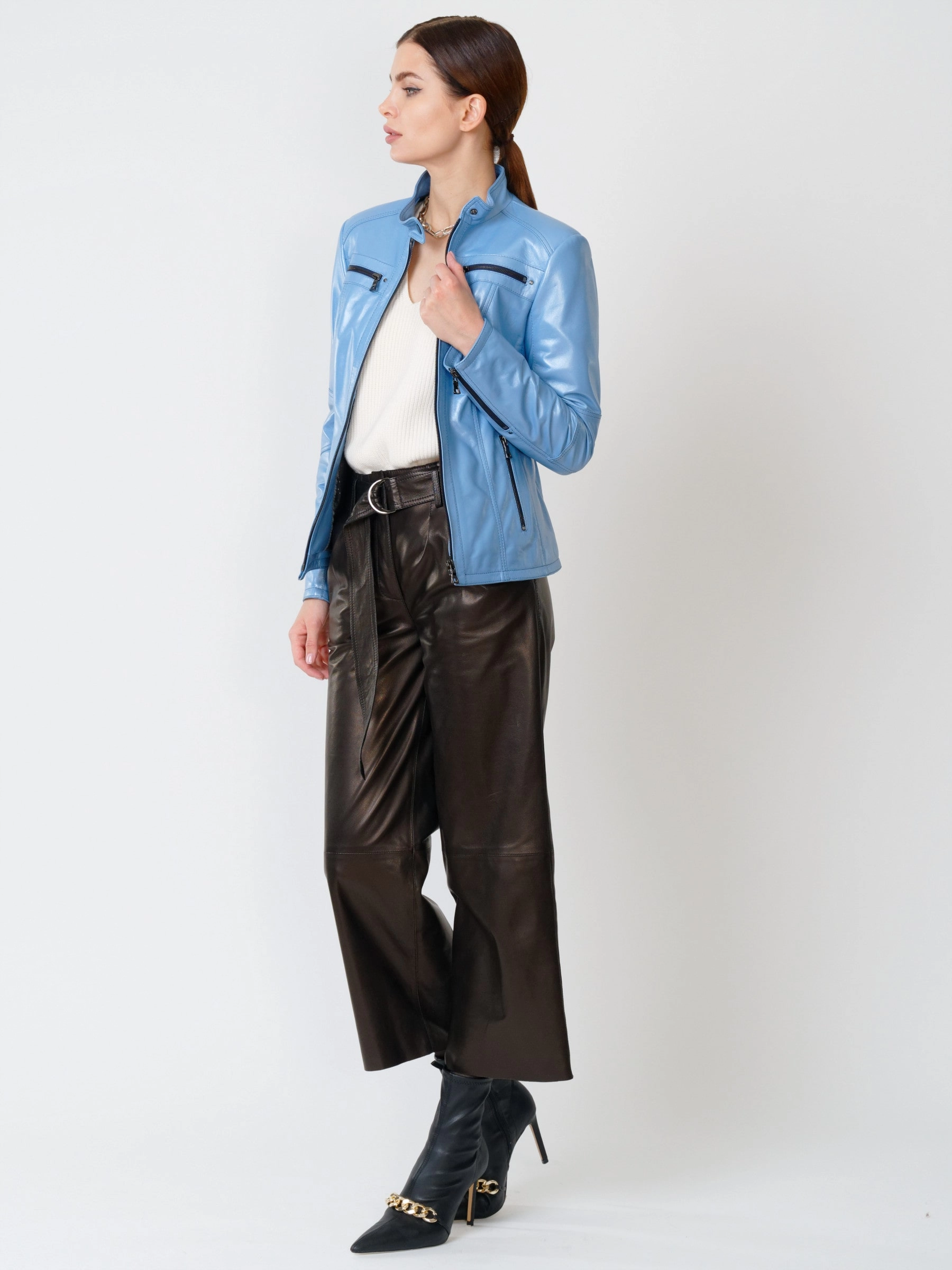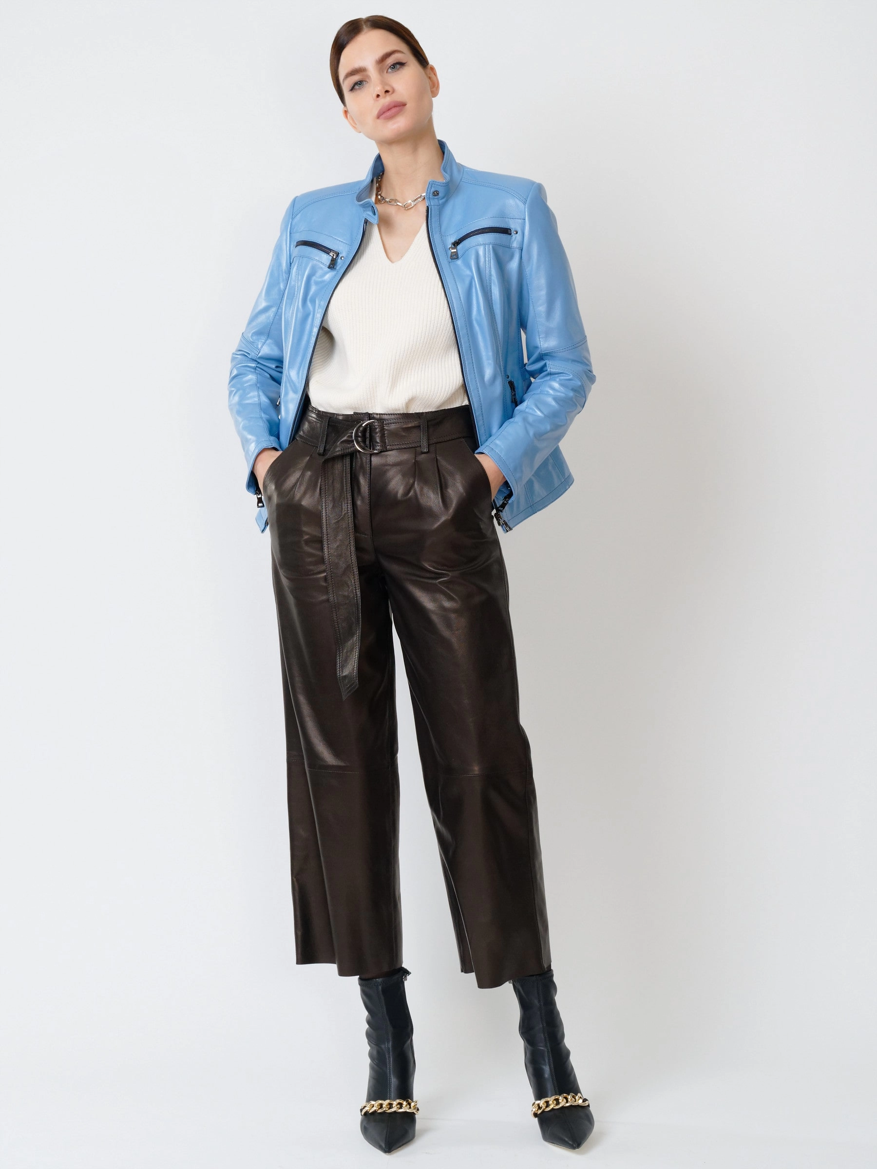 Куртка в комплекте с брюками прямого кроя. Этот стиль подходит женщинам любого возраста. Он характеризуется своей непринужденностью, хорошим качеством кожи, великолепной посадкой и комфортом.