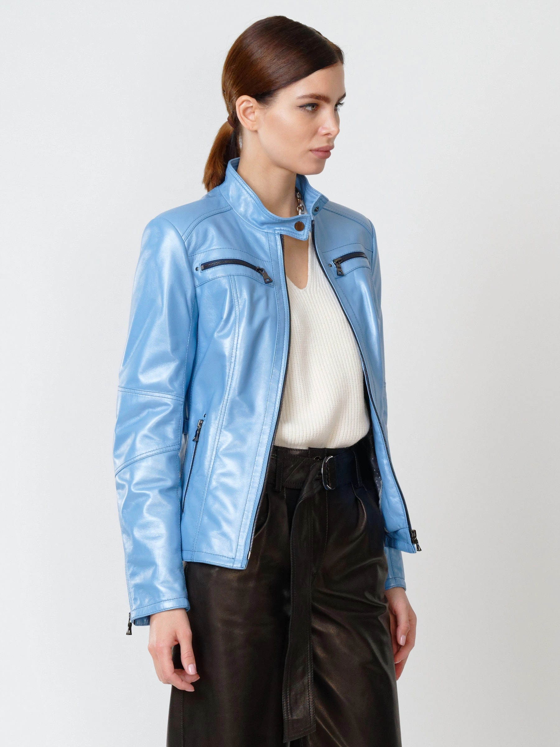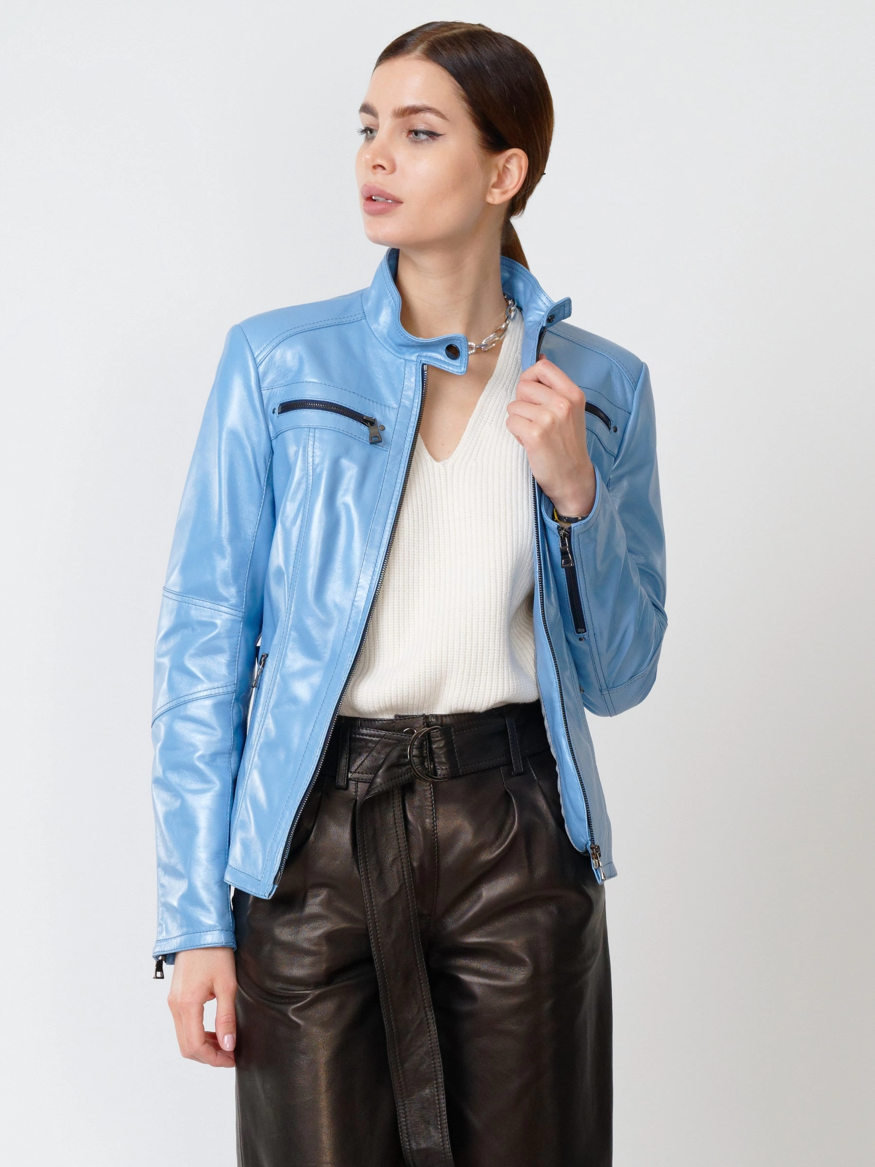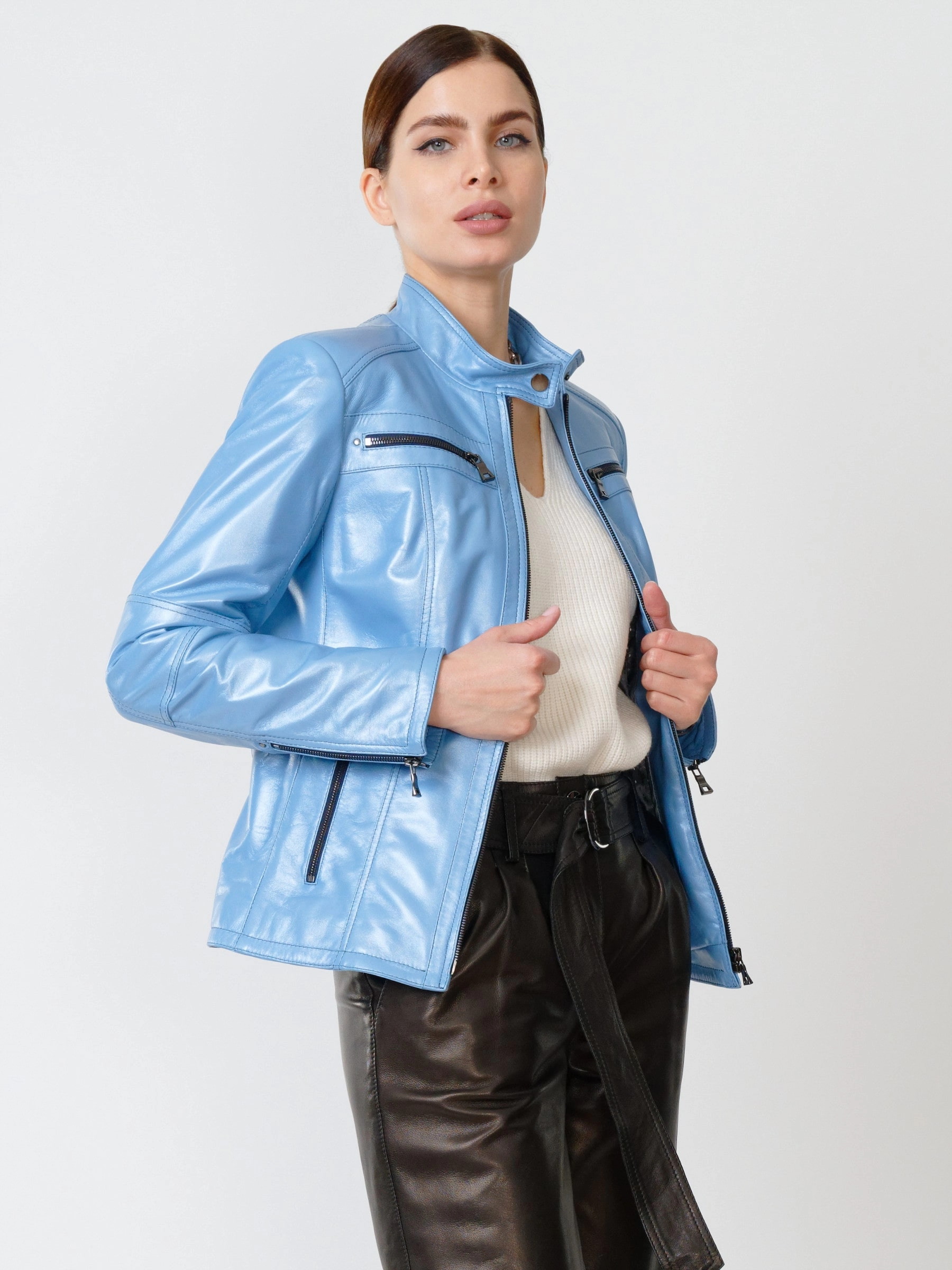 Кожаный комплект женский: Куртка 301 + Брюки 05, голубой перламутр/черный, р. 44, арт. 111167