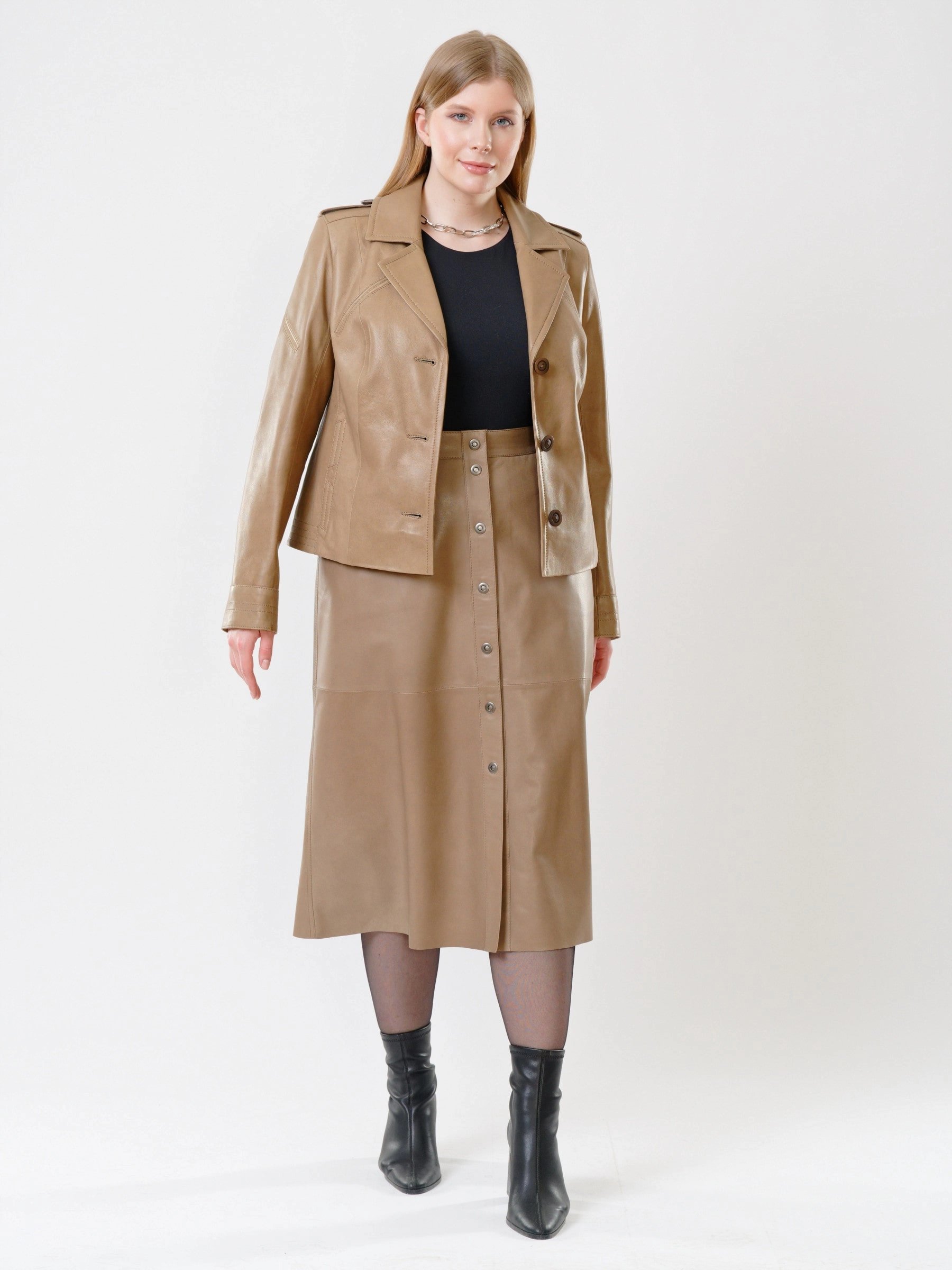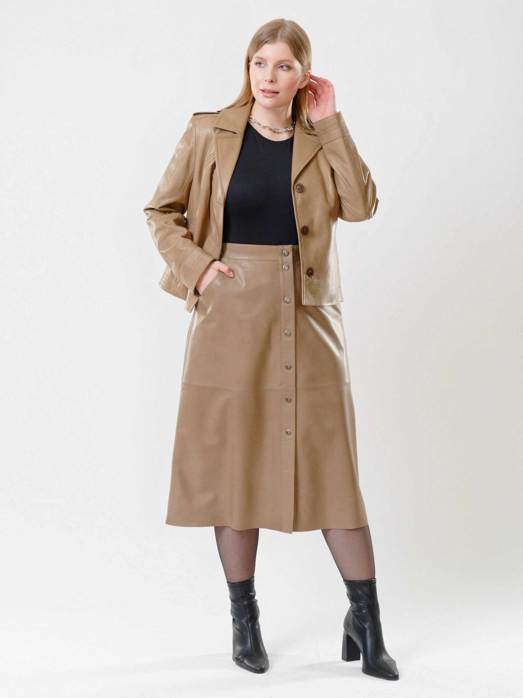 Интересным решением станет комплект из натуральной органической кожи: куртка-пиджак в сочетании с юбкой-миди. Подобный образ подойдет не только для повседневной носки, но и для деловых встреч. Великолепная посадка по фигуре.
