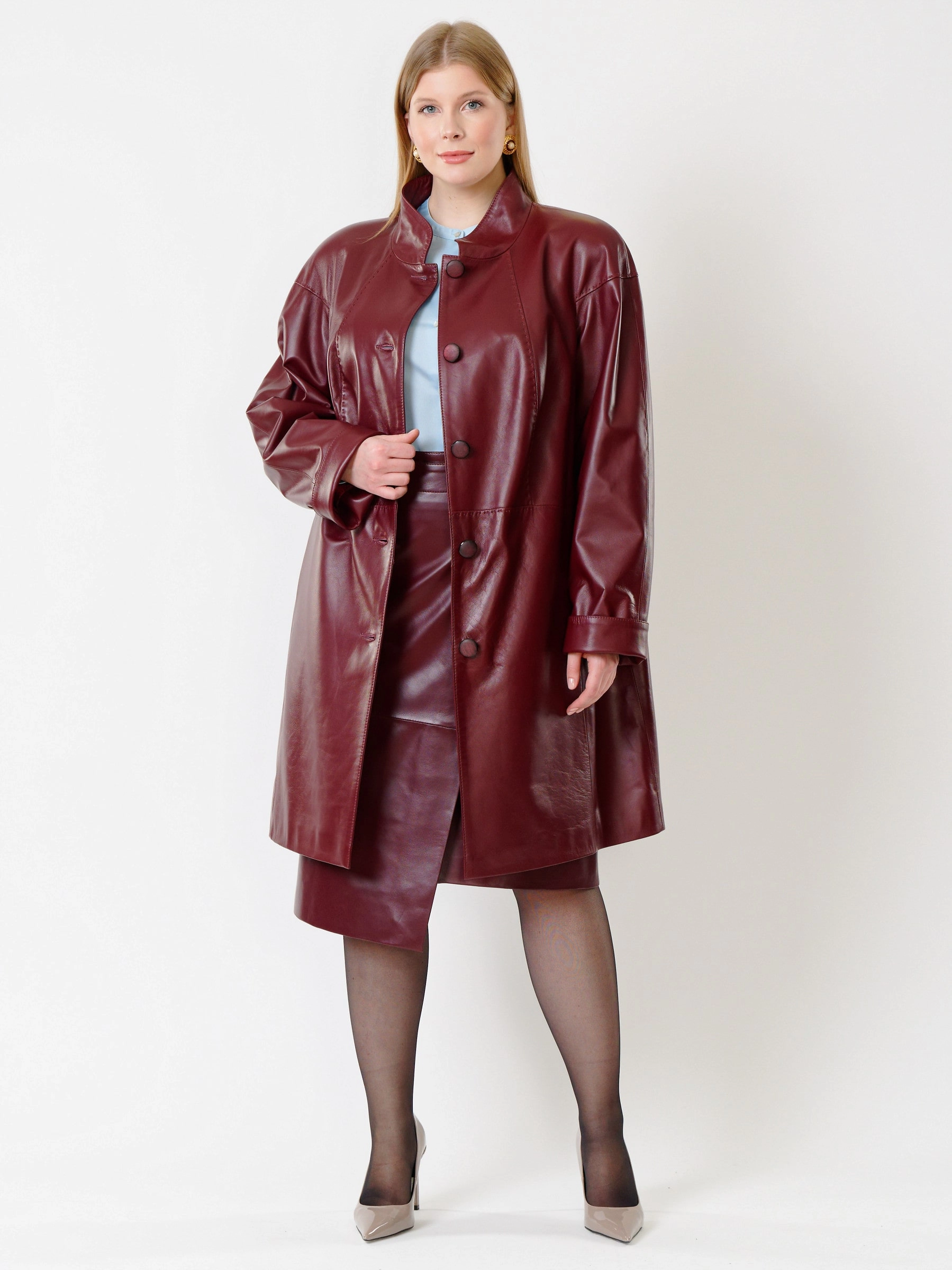 Кожаное пальто с воротником-стойкой в благородном цвете бордо и кожаная юбка в тон. Пальто украшено настоящим ручным стежком. Премиальное качество материалов. Безупречная работа портных. Возможно индивидуальное исполнение в любых базовых размерах, в любом цвете кожи, имеющемся в наличии.