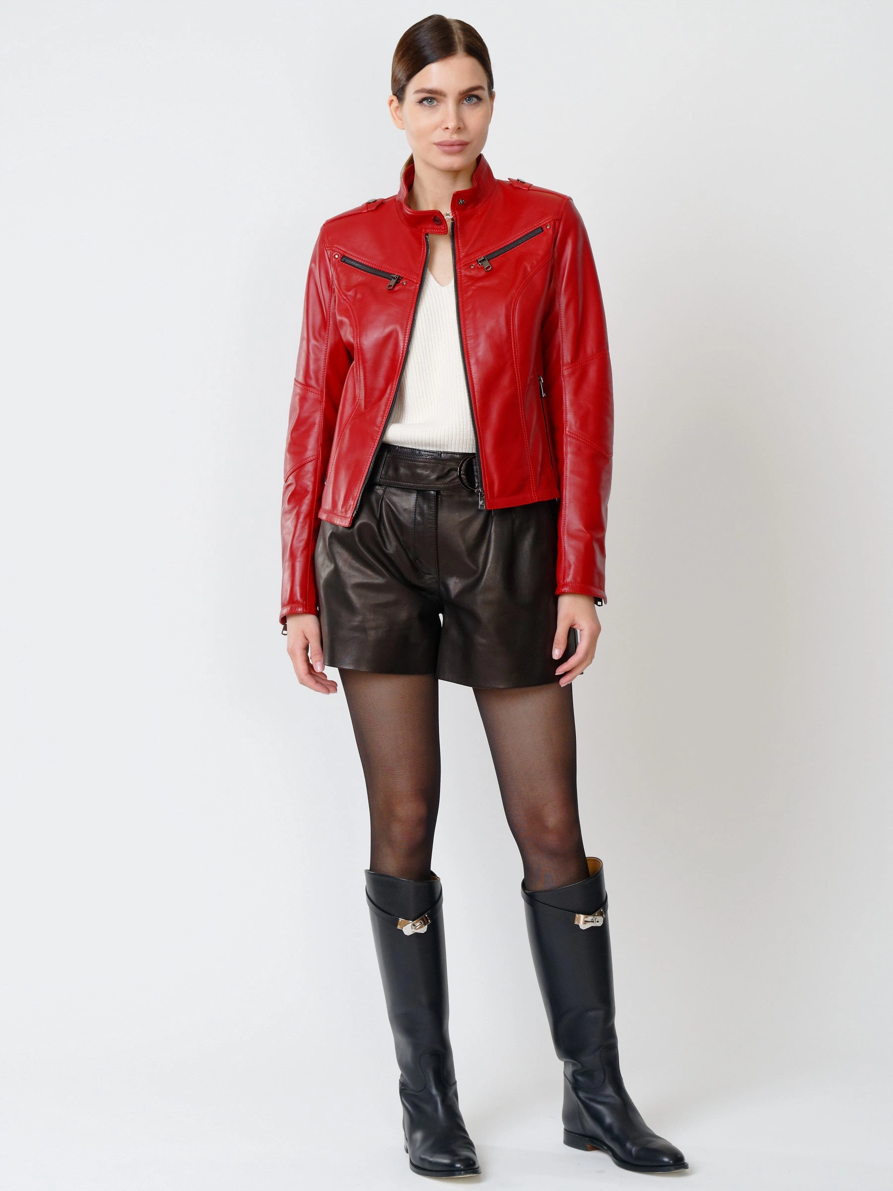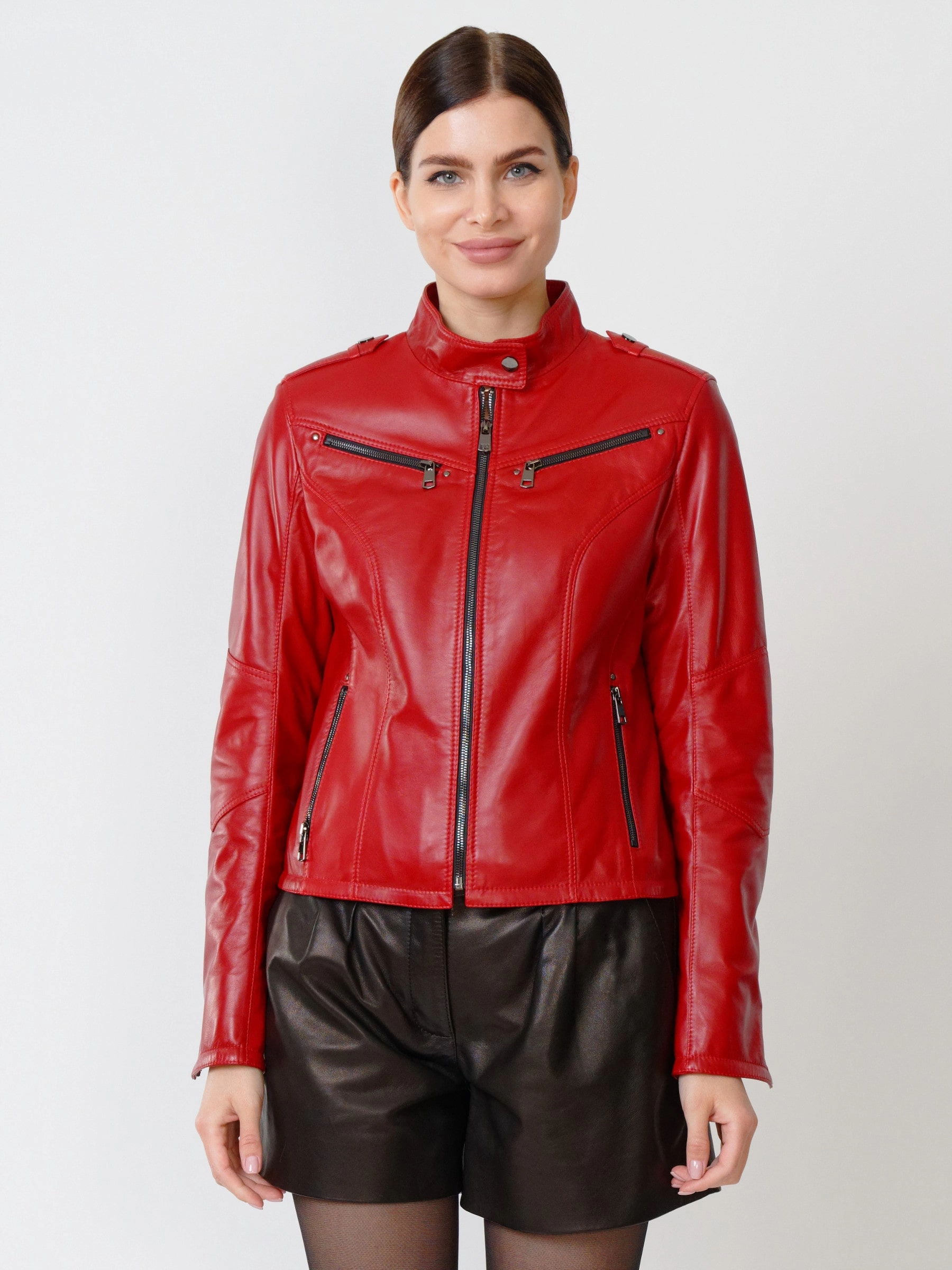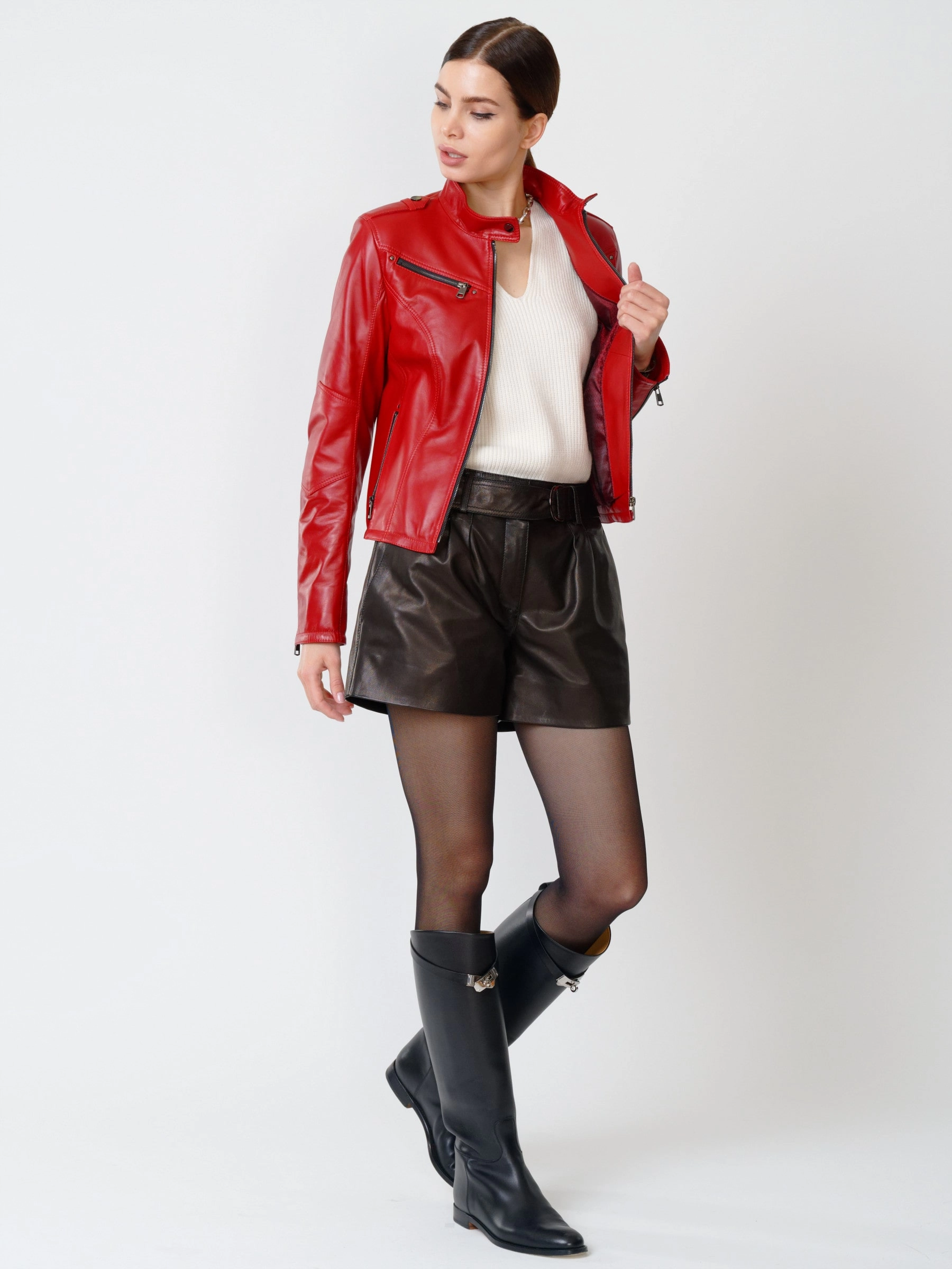 Товар кожаный комплект женский: куртка 399 + шорты 01, красный/черный, р. 44, арт. 111207.