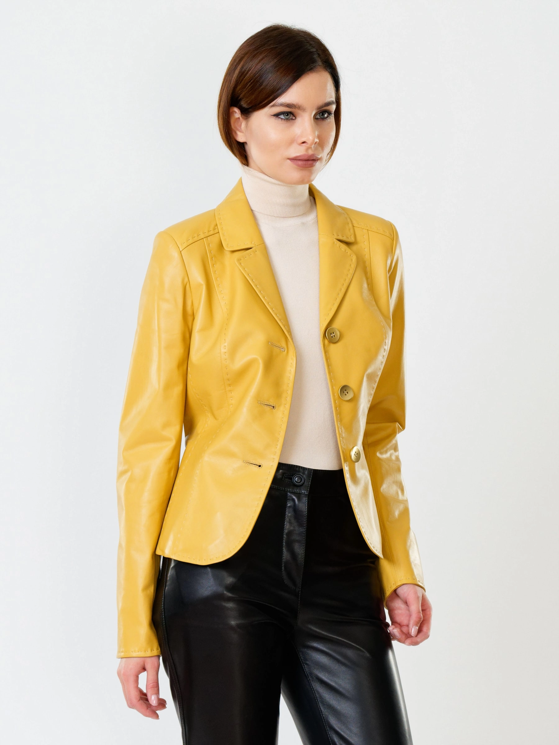 Товар кожаный костюм женский: пиджак 316рс + брюки 03, желтый/черный, р. 44, арт. 111152. Рассчитан на сезон: весна-лето.
