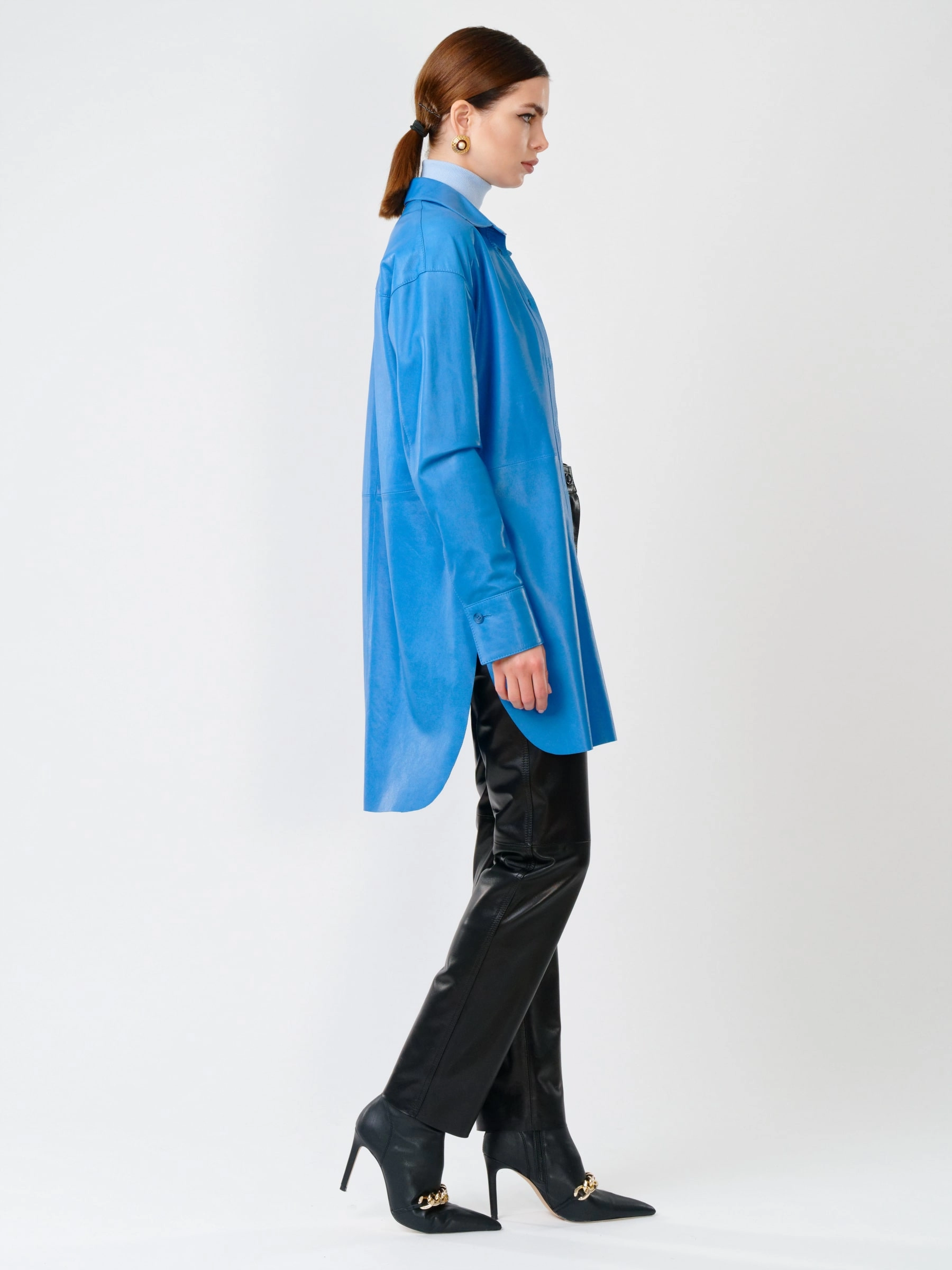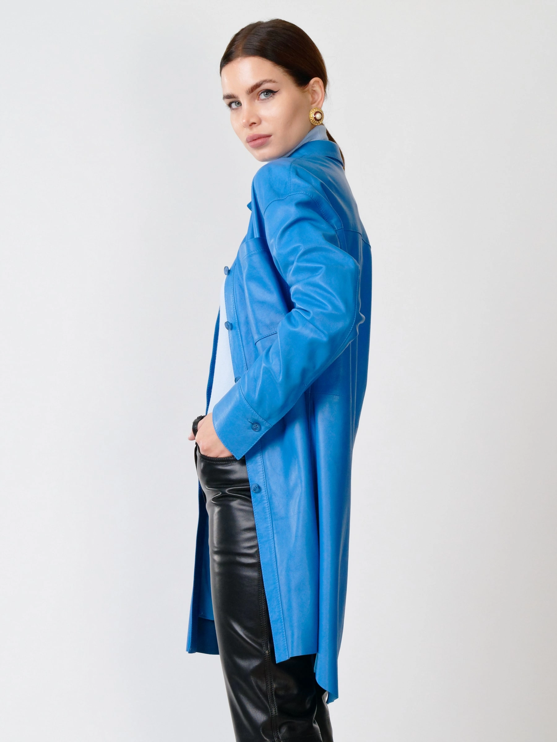Товар кожаный костюм женский: рубашка 01_1 + брюки 02, голубой/черный, р. 46, арт. 111130. Рассчитан на сезон: весна-лето.