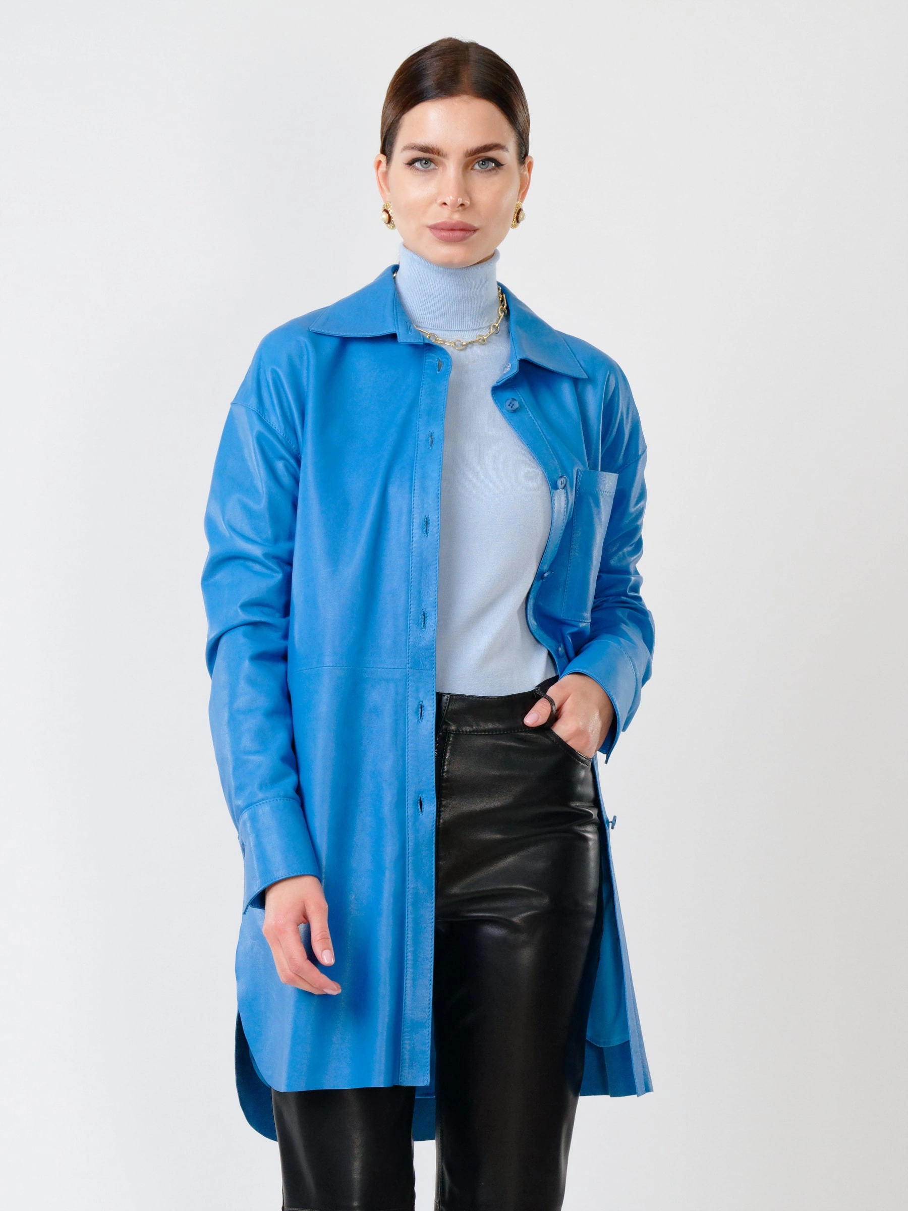 Кожаный костюм женский: Рубашка 01_1 + Брюки 02, голубой/черный, р. 46, арт. 111130
