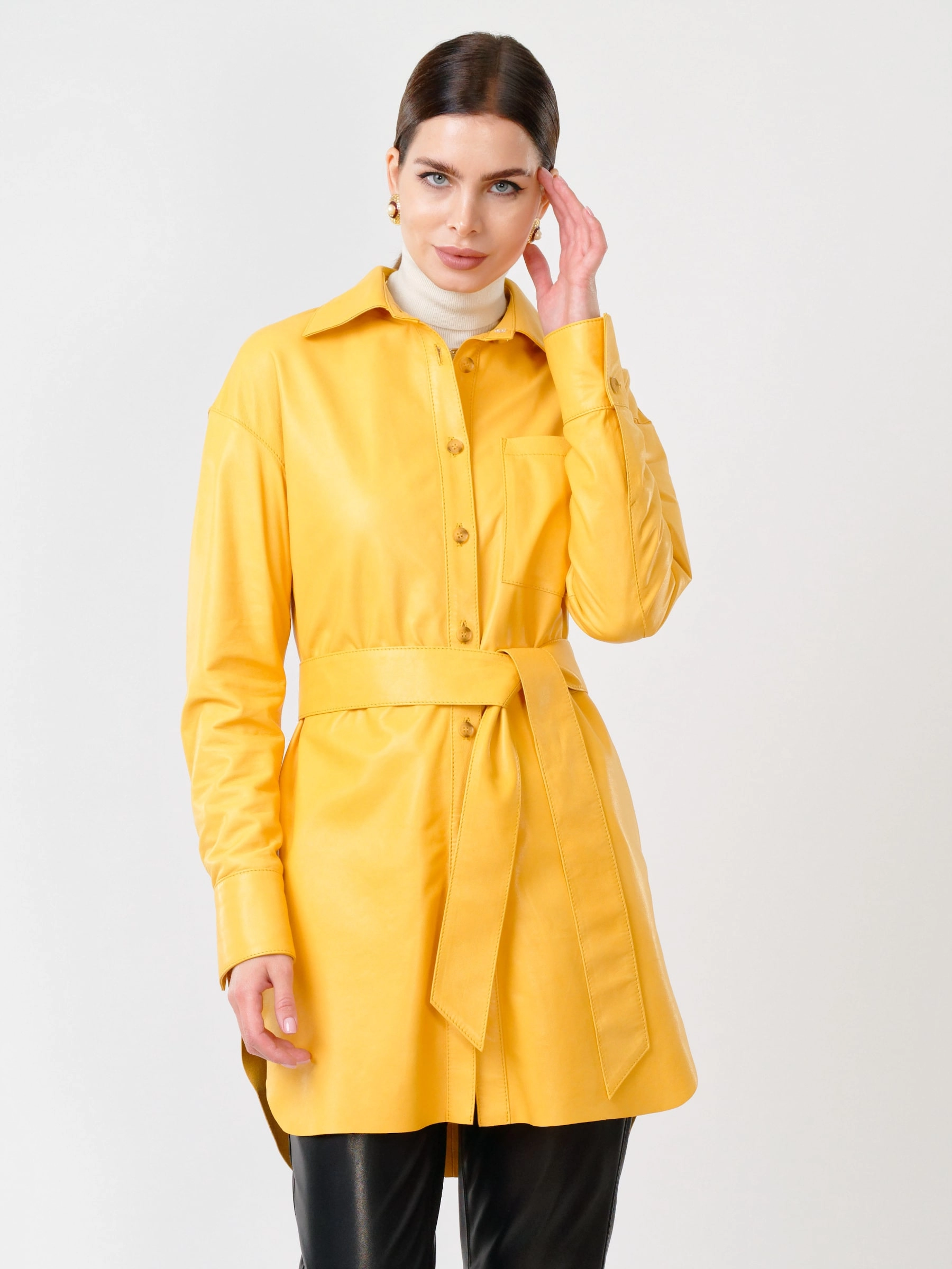 Товар кожаный костюм женский: рубашка 01_1 + брюки 03, желтый/черный, р. 46, арт. 111129. Рассчитан на сезон: весна-лето.